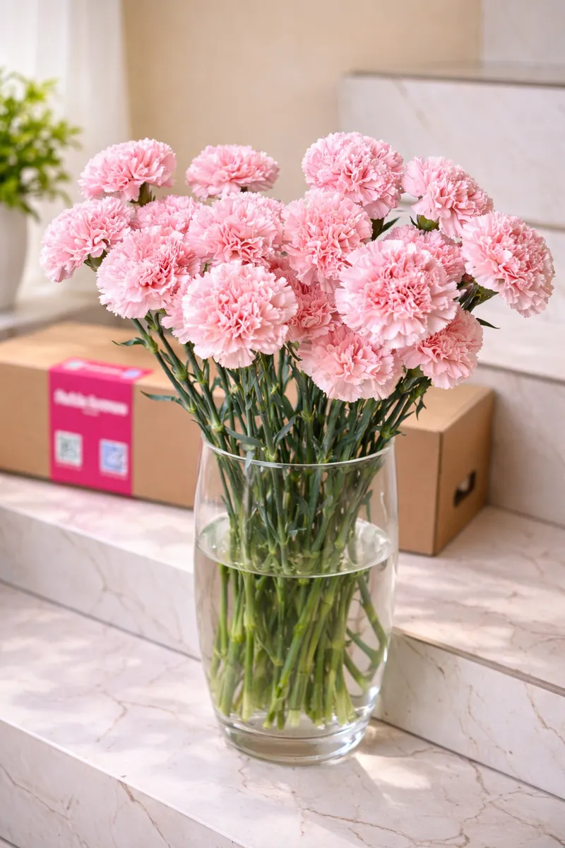 Нежный пудрово-розовый диантус (гвоздика) с пышными, воздушными бутонами и аккуратной текстурой лепестков. Очень стойкий цветок — долго сохраняет свежесть и объём в вазе.