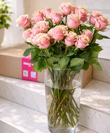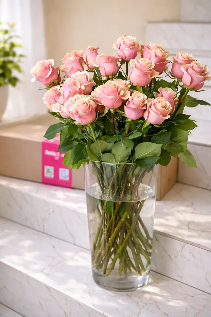 Элегантные розы в пудрово-розовом оттенке с кремовым кантом — аккуратный бутон, высокая ножка 60 см и премиальный внешний вид. Идеально смотрятся как дома, так и в офисе.