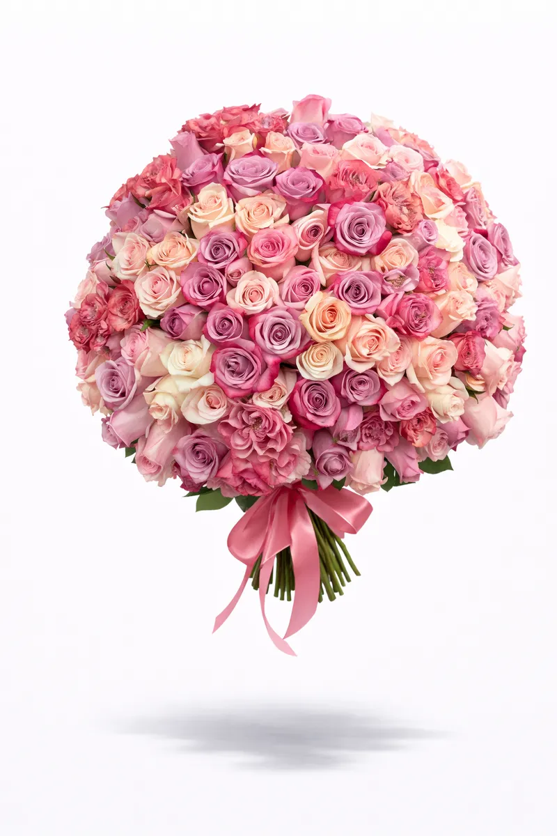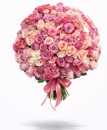 Если вы хотите подобрать для близкого человека роскошный букет, поражающий свои масштабом, и в тоже время желаете выделиться, то есть уйти от традиционных букетов из цветов одного оттенка, то этот вариант для вас. Перед вами микс из свежайших роз пяти разных цветов, и он совершенно не выглядит банально и традиционно.