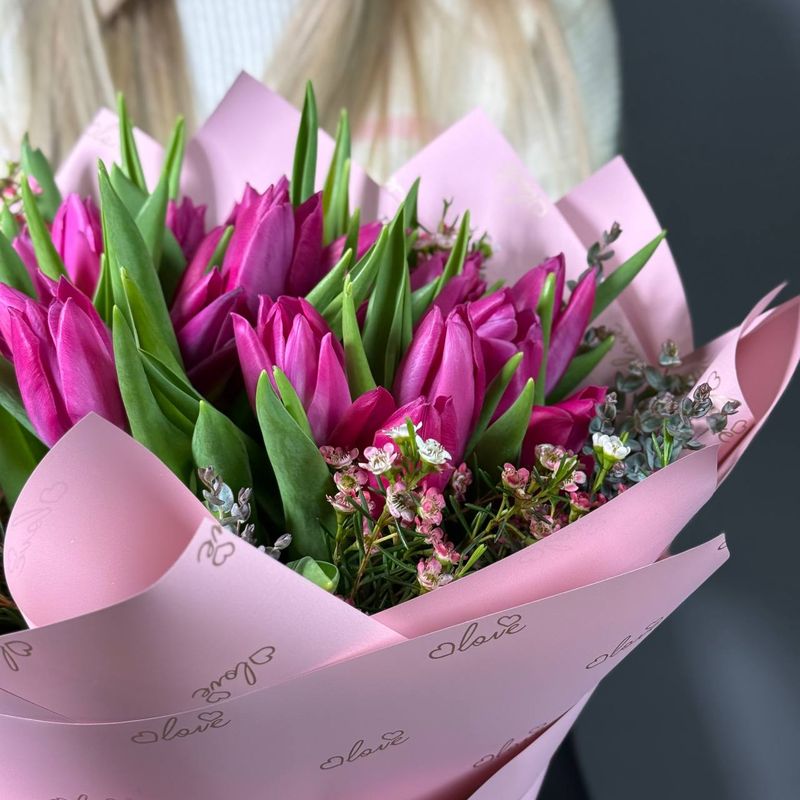 это букет, который дарят, когда хочется сказать о заботе, тепле и мягких чувствах без лишних слов. Лаконичные тюльпаны собирают в себе всё самое светлое: внимание, уважение и тёплую нежность. Такой букет дарит ощущение свежего воздуха, первых солнечных дней и тонкой красоты момента. Универсальный и всегда уместный подарок для мамы, любимой, коллеги или близкого человека.