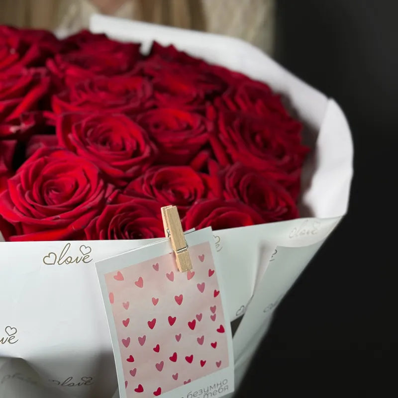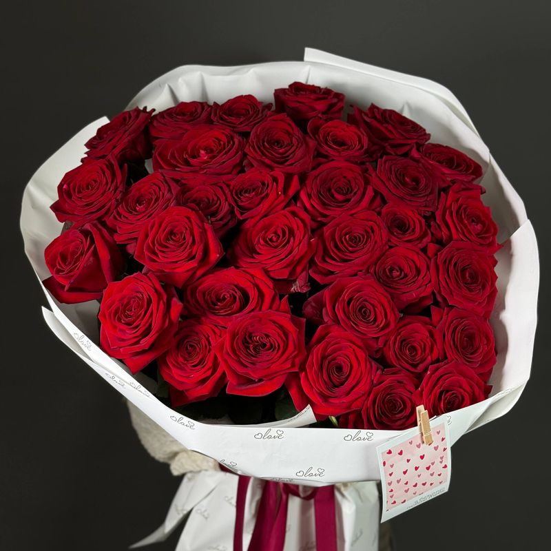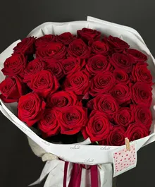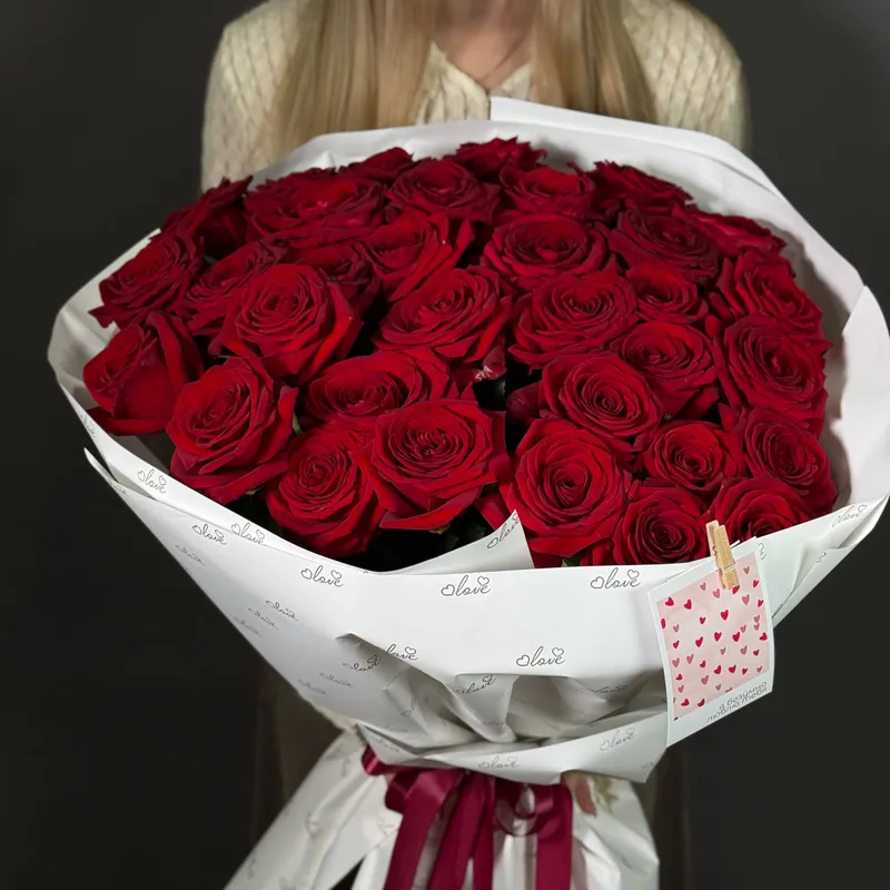 «35 признаний» — это роскошный, выразительный букет из 35 насыщенно-красных роз. Каждая роза — как отдельное признание в любви, собранное в плотную, эффектную шапку, которая мгновенно производит впечатление.