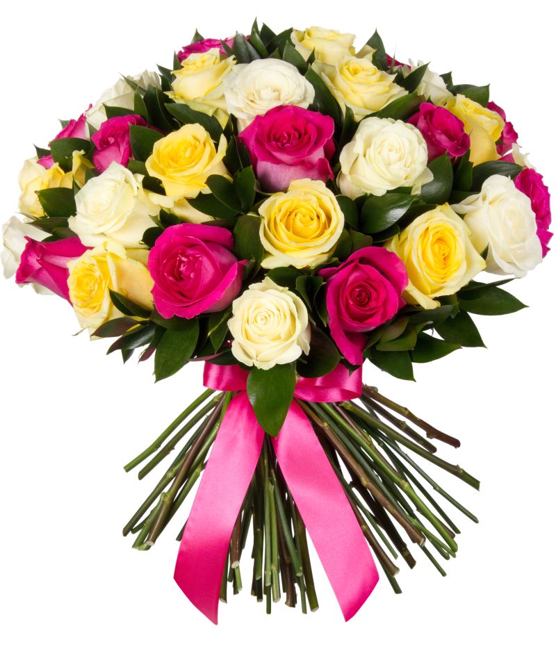 Розы образовали здесь очень праздничное, эффектное сочетание красок. Яркий, профессионально выполненный букет станет лучшим выражением внимания к той даме, которой вы его преподнесете по поводу какого-то особого торжества.