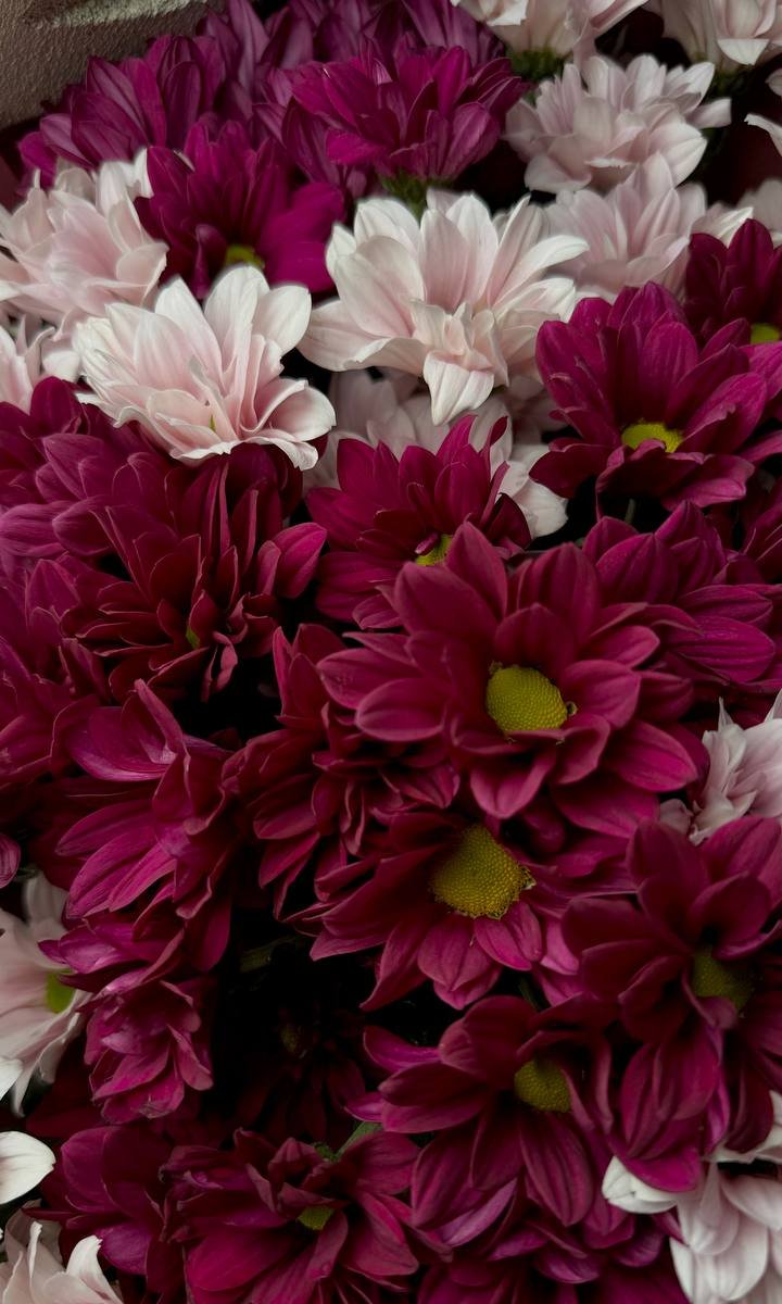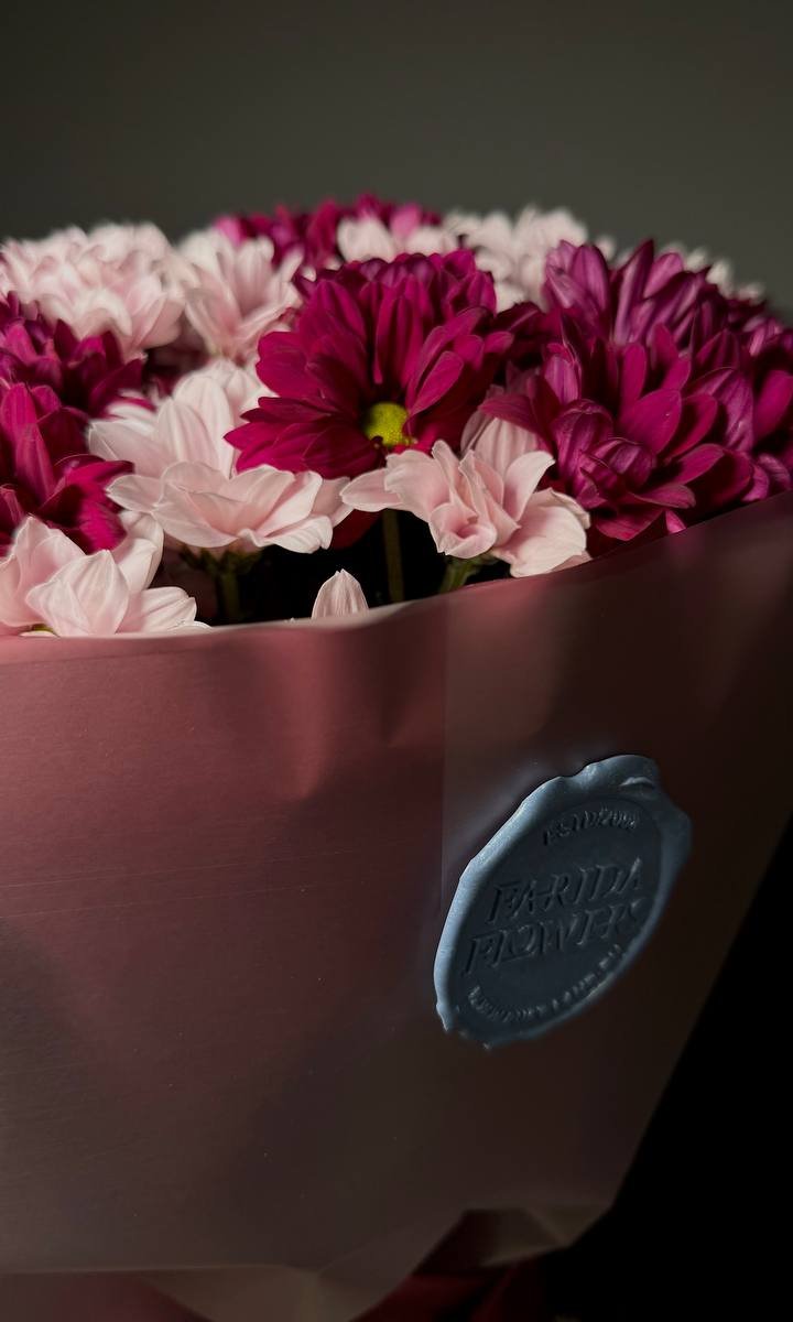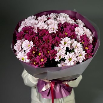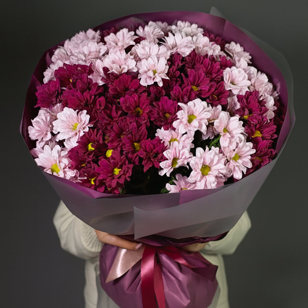 Классический букет из розовых и бордовых хризантем — сочетание вкуса и чувства. Элегантный и выразительный, подойдёт для любого торжества. 💌 Дарите настроение в оттенках любви.