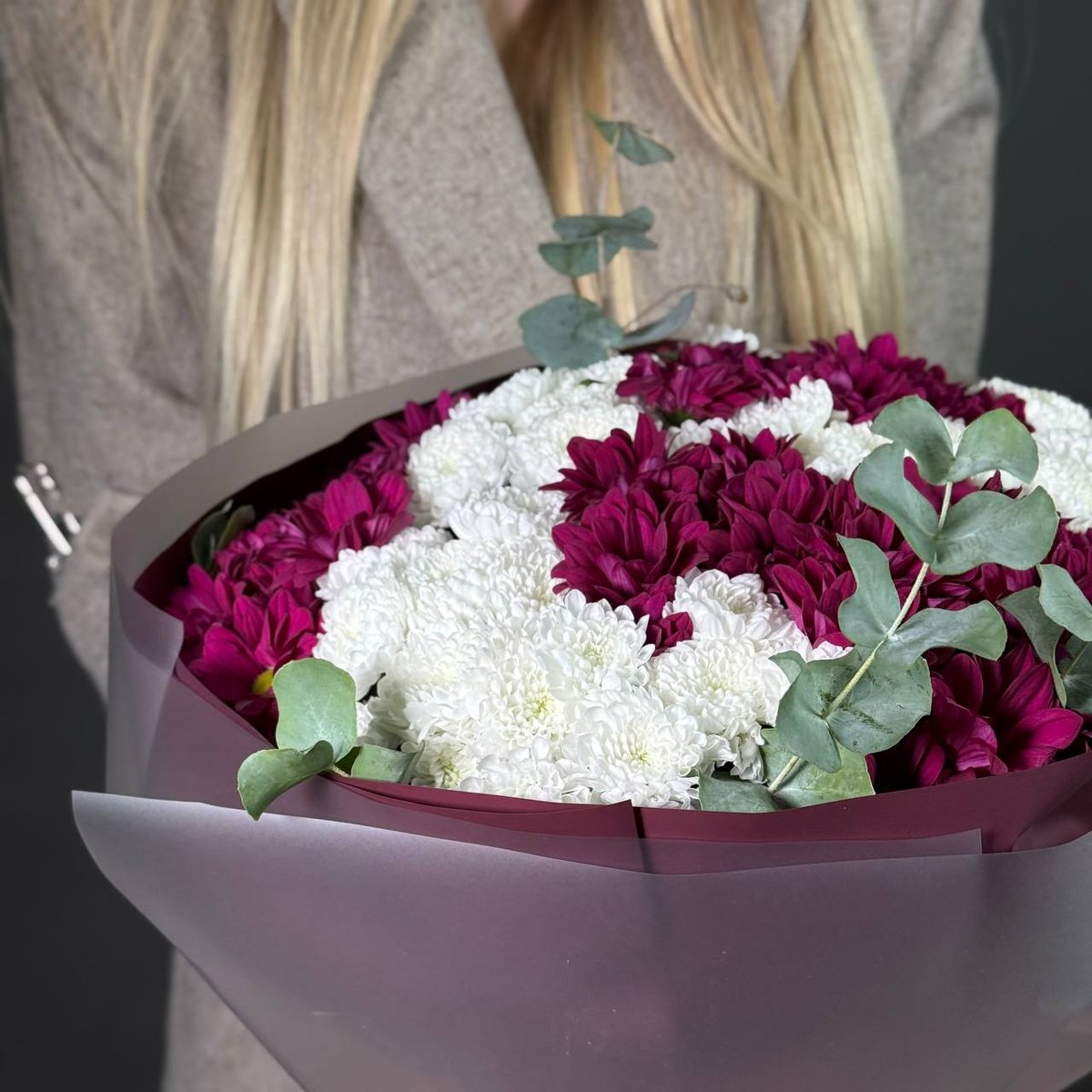 Этот букет — про внимание, тепло и заботу. Белые и малиновые хризантемы создают объёмную, выразительную композицию, которая сразу притягивает взгляд и дарит ощущение праздника. Такой букет выбирают, когда хочется по-настоящему порадовать маму, поддержать близкого человека или сказать важные слова без лишних фраз. Нежный, стильный, стойкий — он точно произведёт впечатление.