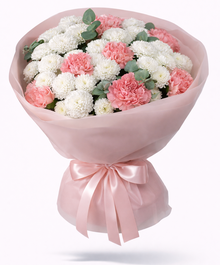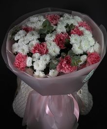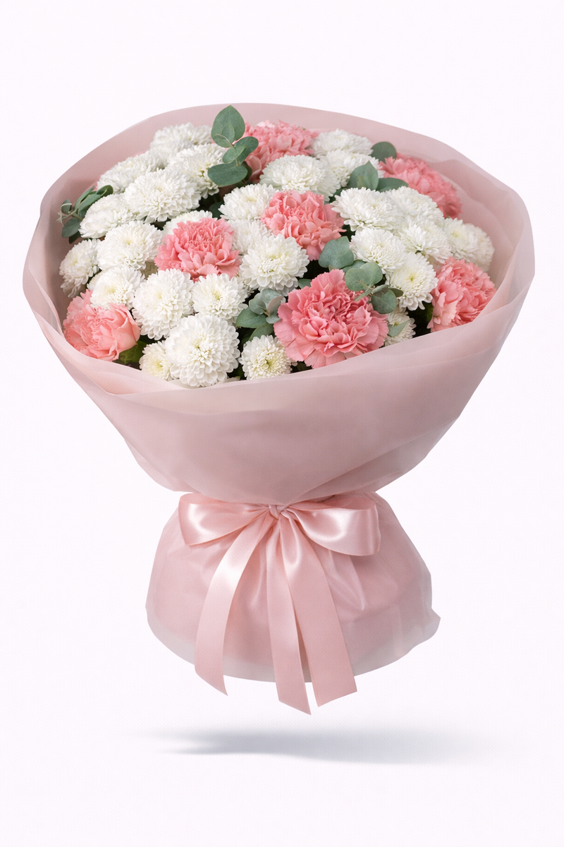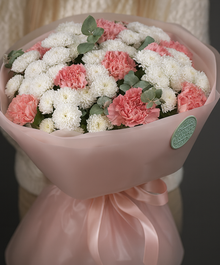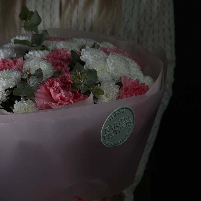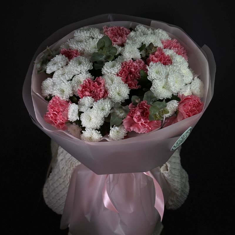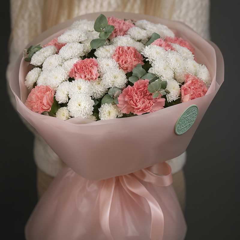 Лёгкие оттенки хризантем и нежные диантусы создают атмосферу уюта и чистоты, а мягкая упаковка подчёркивает трепетность композиции.