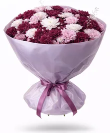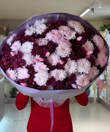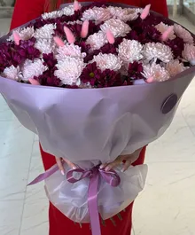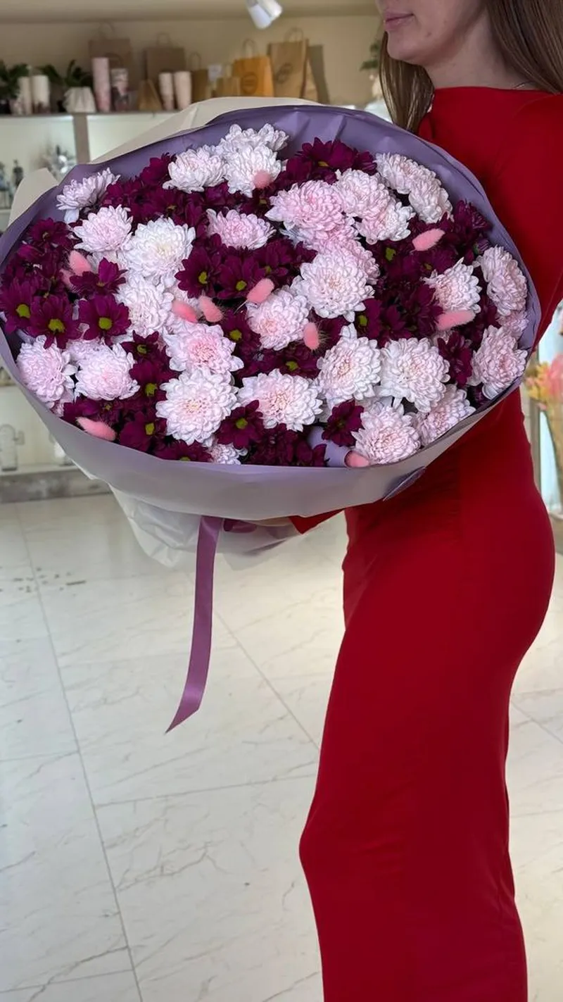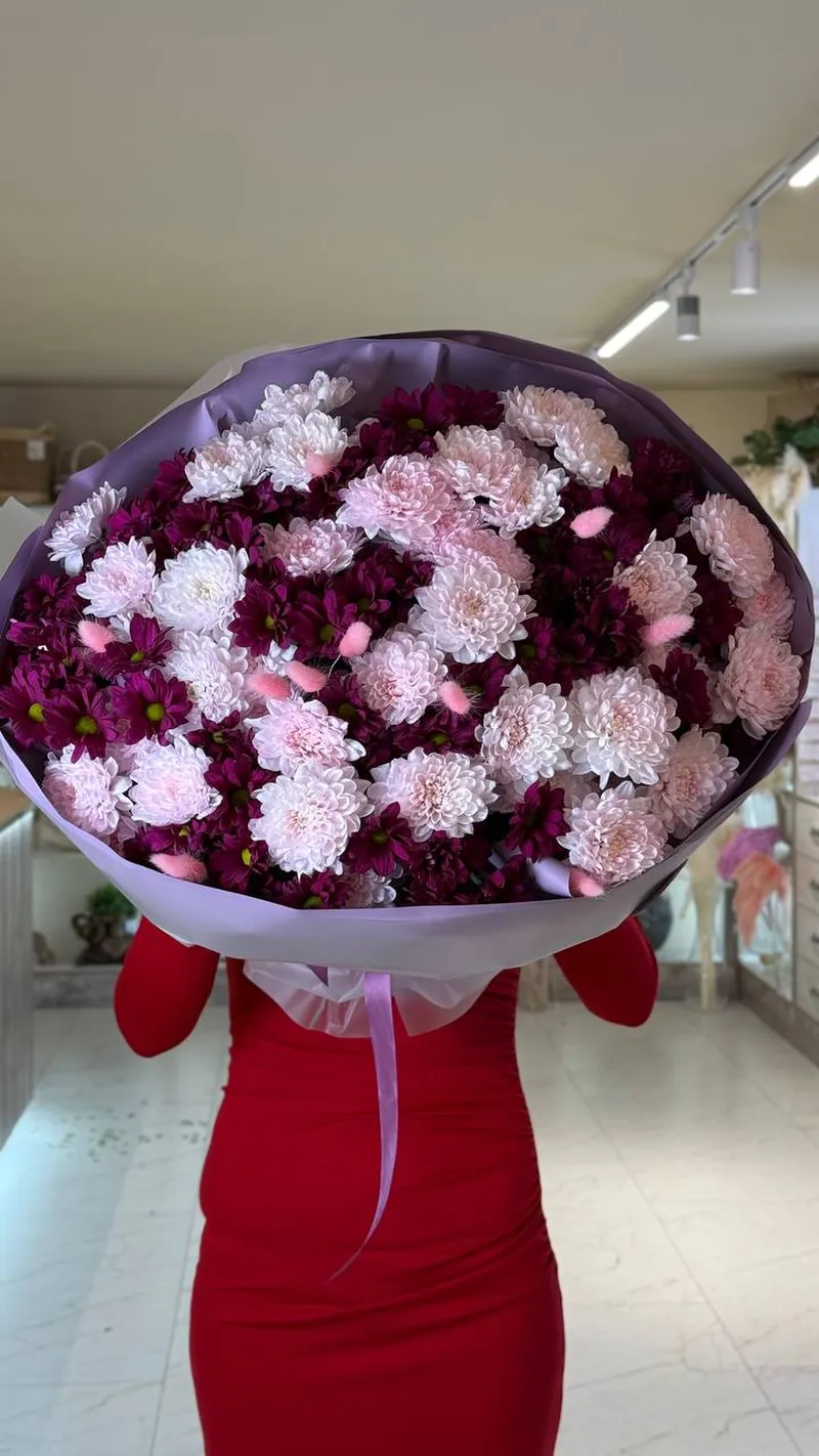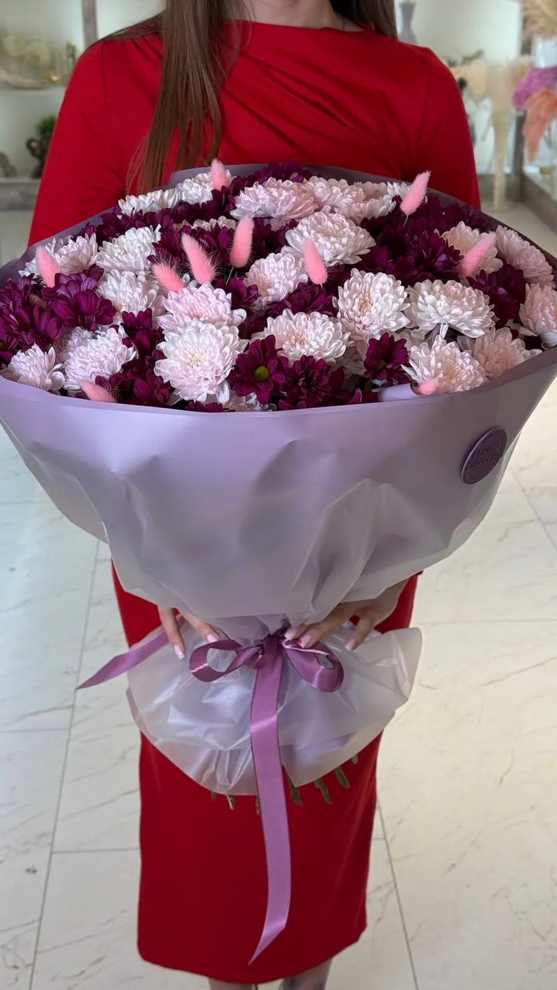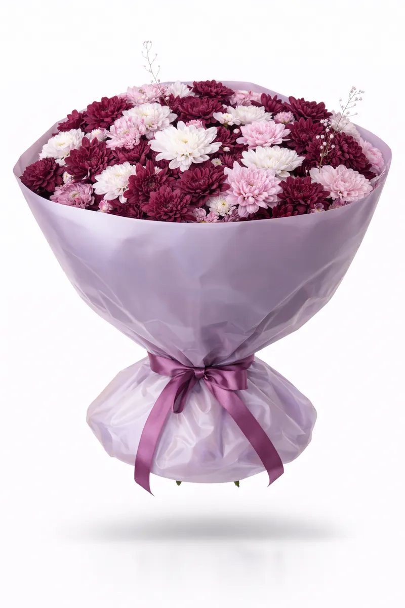 Нежный, выверенный, спокойный — этот букет создан для тех, кто ценит гармонию без лишнего шума. Сочетание сиреневых и белых хризантем образует мягкий градиент, который смотрится дорого, свежо и очень аккуратно. Это не кричащая страсть — это уверенная симпатия, искренность и тёплая забота. Идеальный выбор для признания, благодарности, дня рождения или 14 февраля, когда хочется сказать: «Ты для меня — важна» без лишних слов.