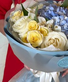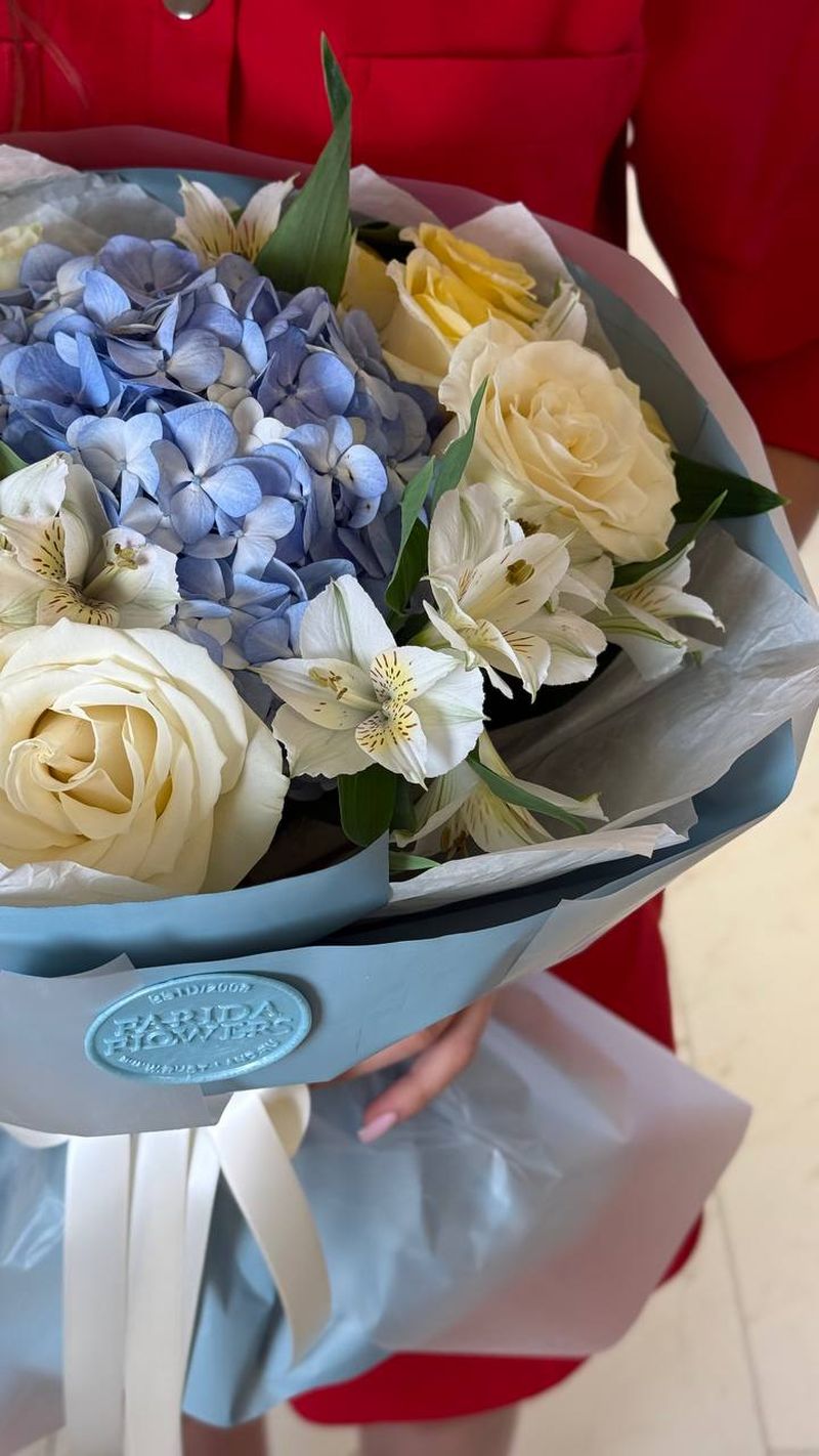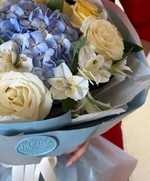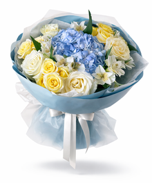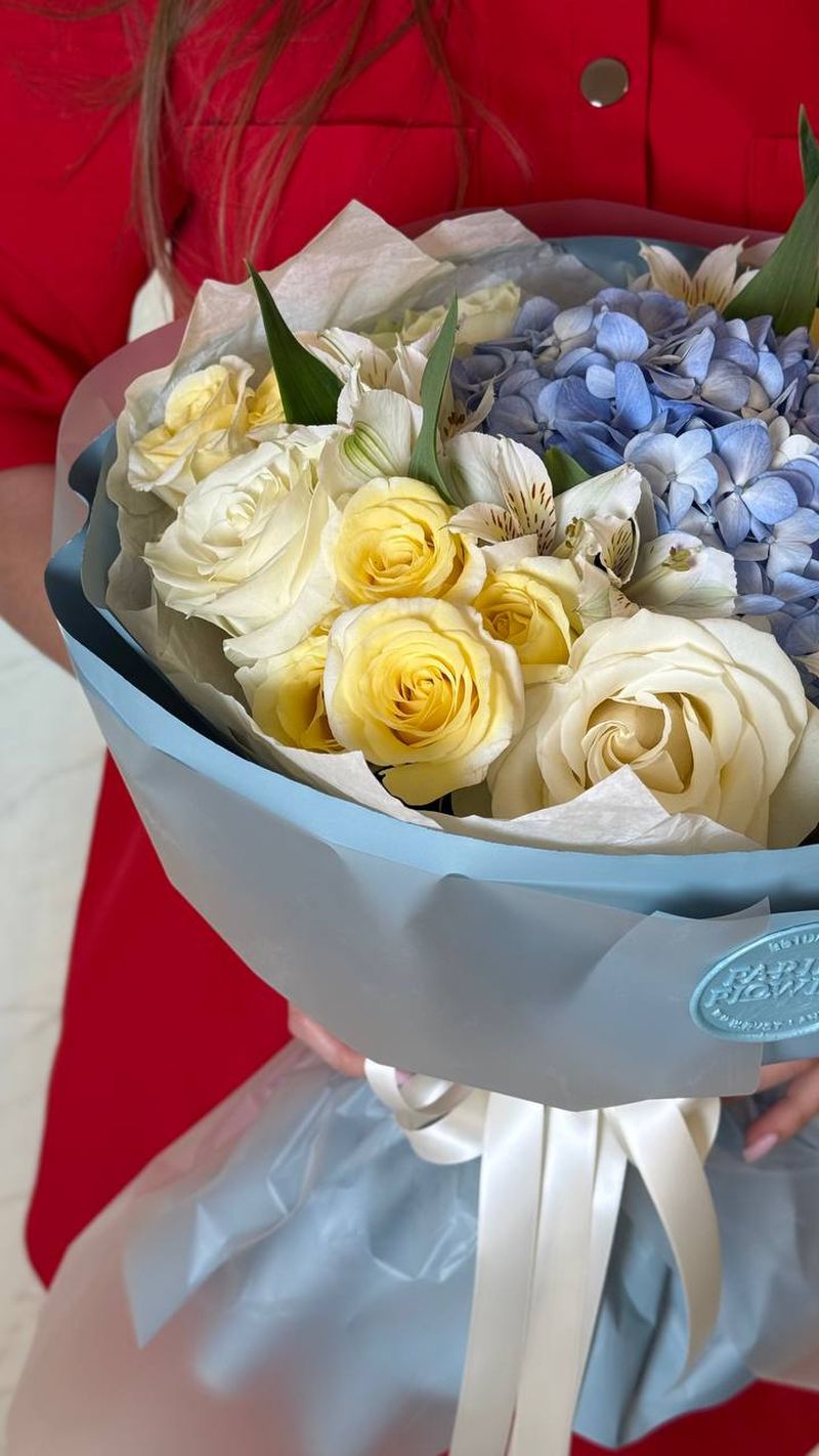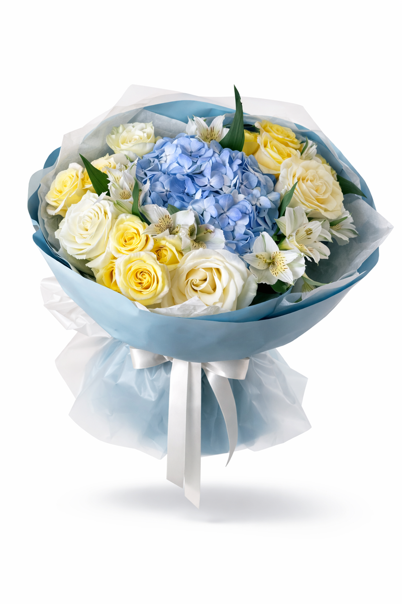 Объёмная композиция с пышной голубой гортензией в центре, окружённой кремовыми и солнечно-жёлтыми розами и изящными альстромериями. Контраст холодного небесного оттенка и мягкой тёплой палитры создаёт ощущение свежести и гармонии. Лёгкая воздушная упаковка подчёркивает чистоту и премиальный характер букета.