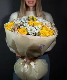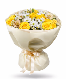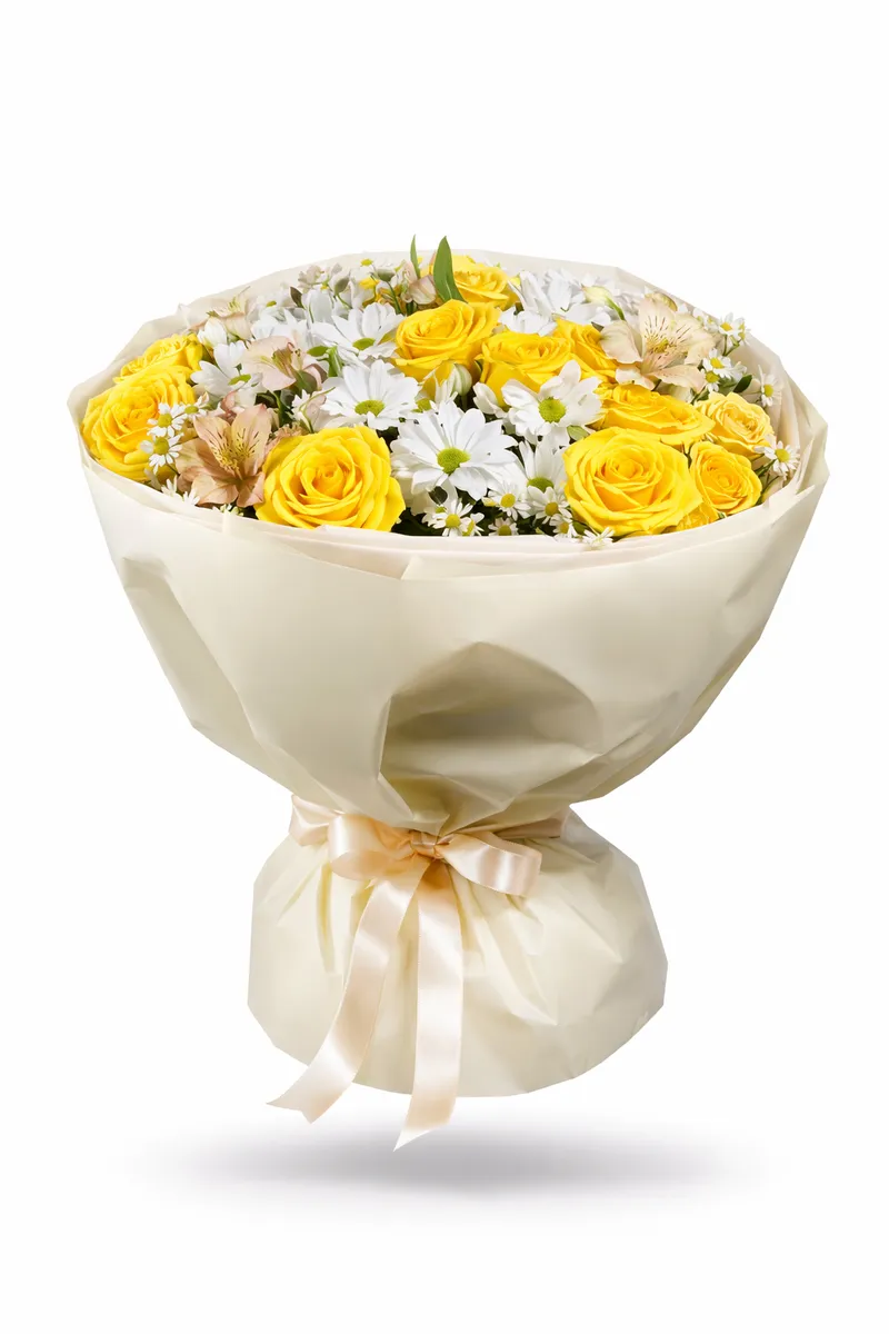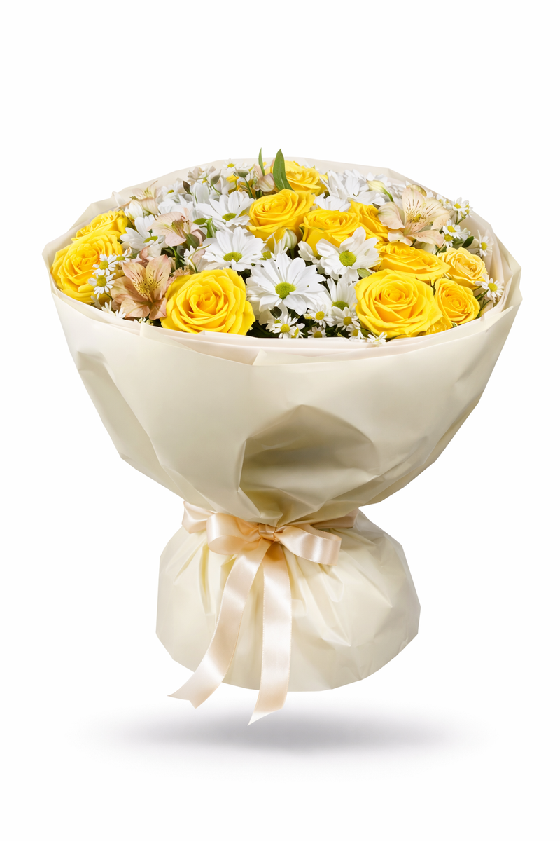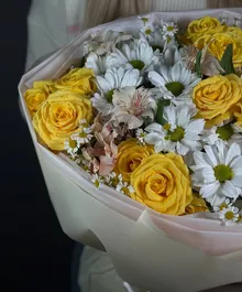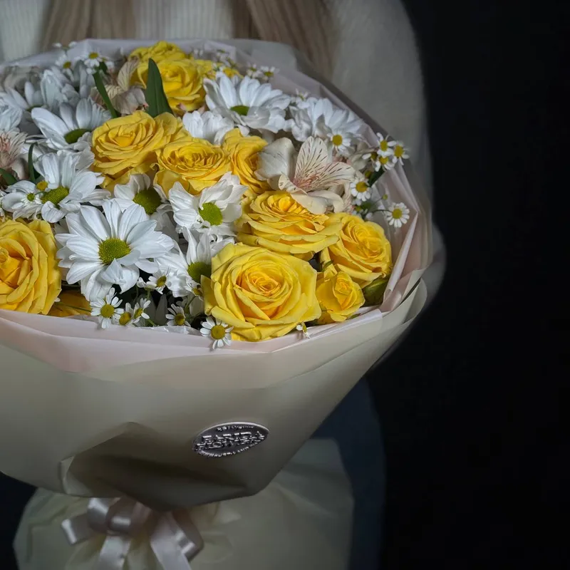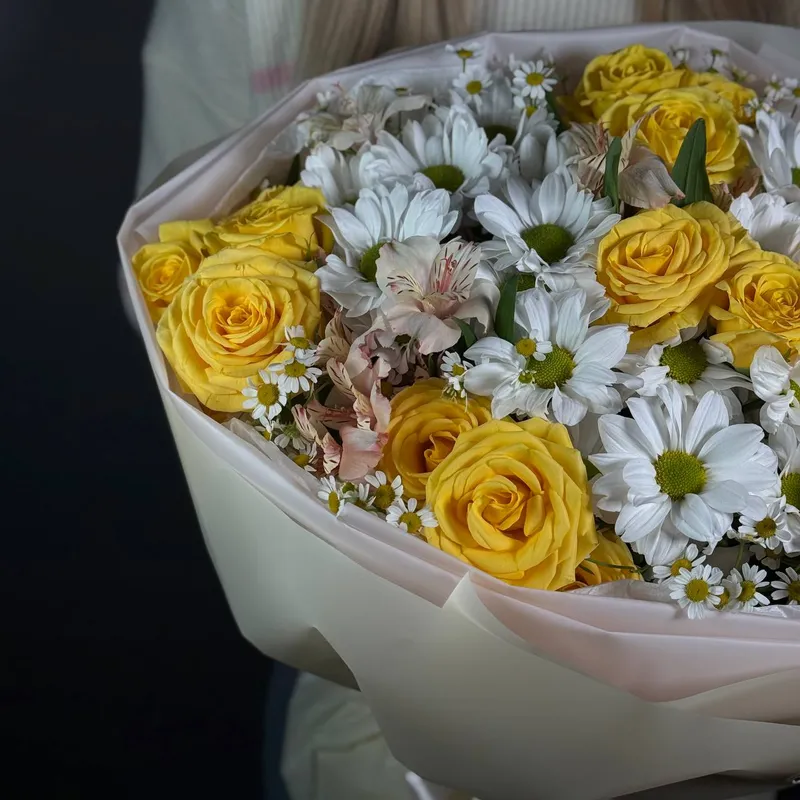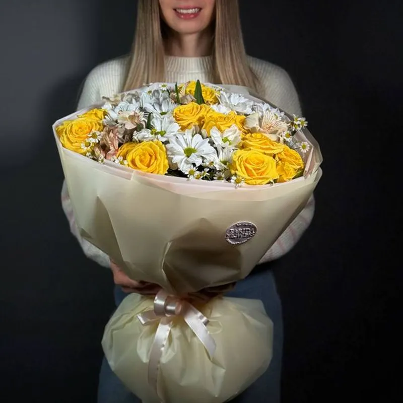 Солнечные розы и белые ромашки — как напоминание о том, что мама всегда права. Немного шутки, немного нежности и море любви — этот букет скажет всё без слов.
