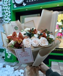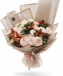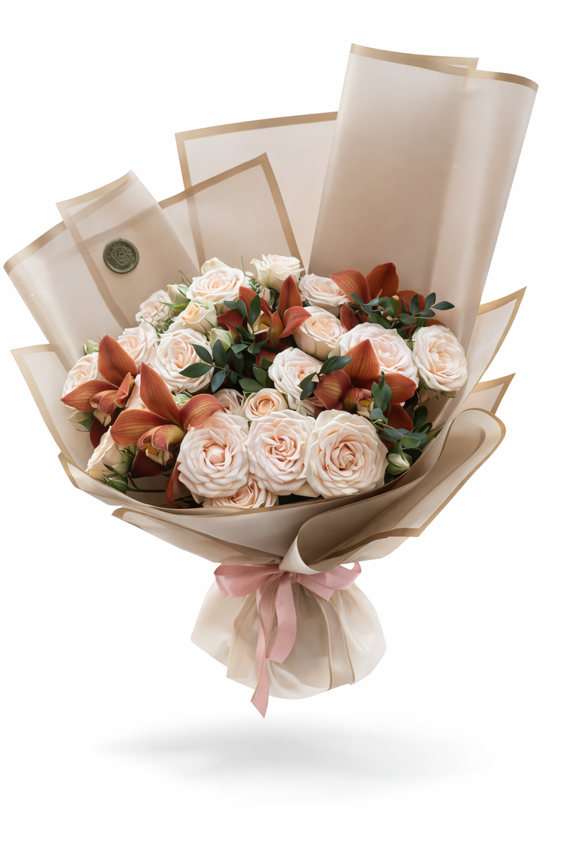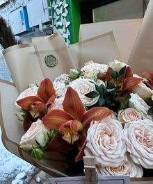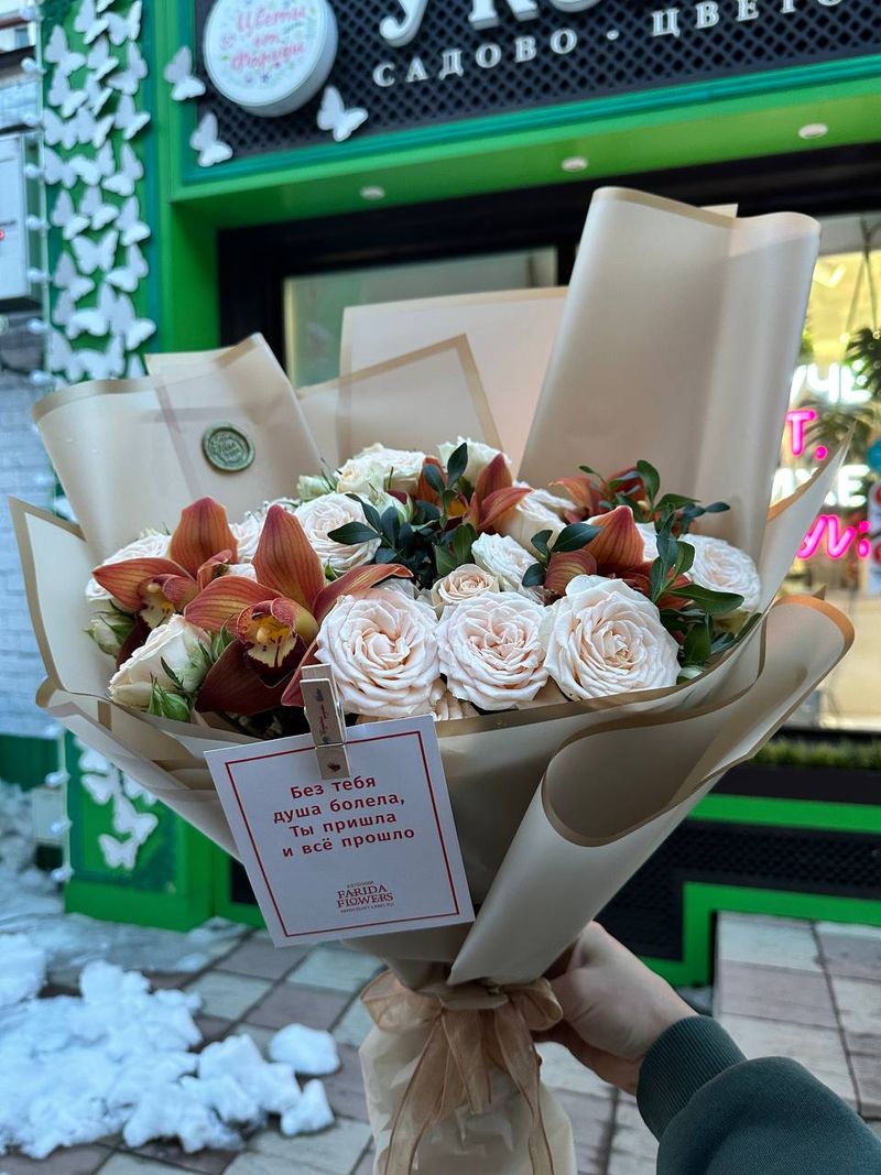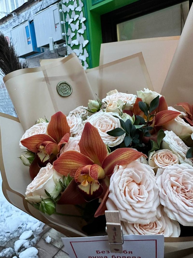 Перед вами букет, который воплощает в себе гармонию и изысканную красоту природы. Орхидея – символ утонченности и благородства. Ее изящные лепестки, словно легкое дуновение ветра, окружают себя загадочной аурой. Вокруг орхидеи располагаются кустовые розы, которые добавляют букету пышность и объем. Их бутоны, раскрываясь, словно завершают картину этого шедевра. Сочетание орхидеи и роз символизирует соединение нежности и силы, хрупкости и стойкости, создавая атмосферу гармонии и равновесия. Этот букет станет идеальным подарком для тех, кто ценит красоту и изящество. Он будет радовать своего обладателя своей свежестью и неповторимым ароматом, наполняя дом уютом и теплом.