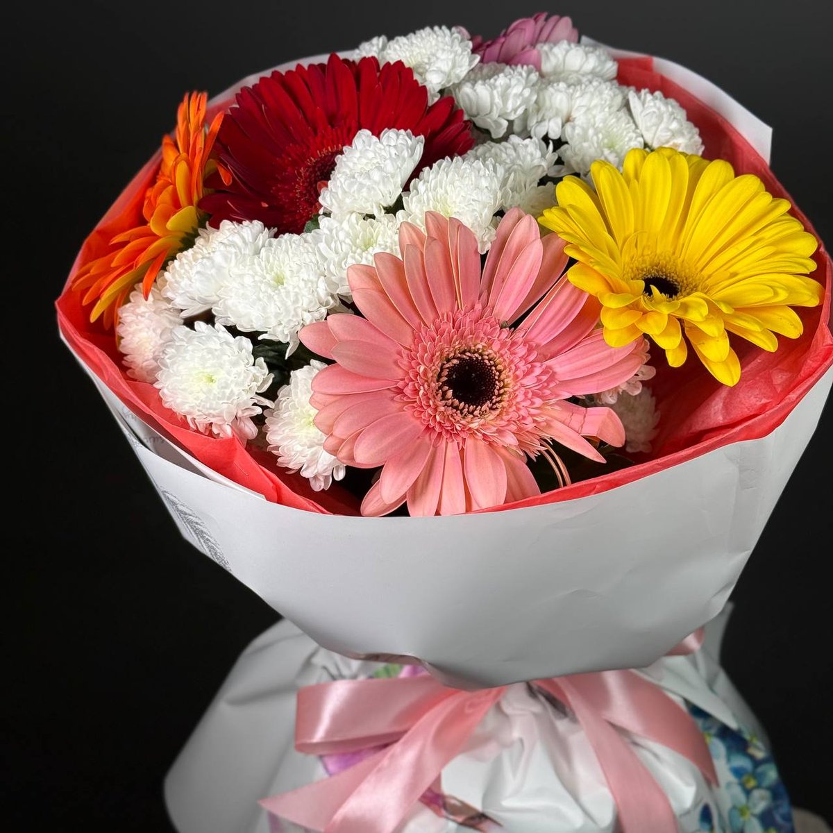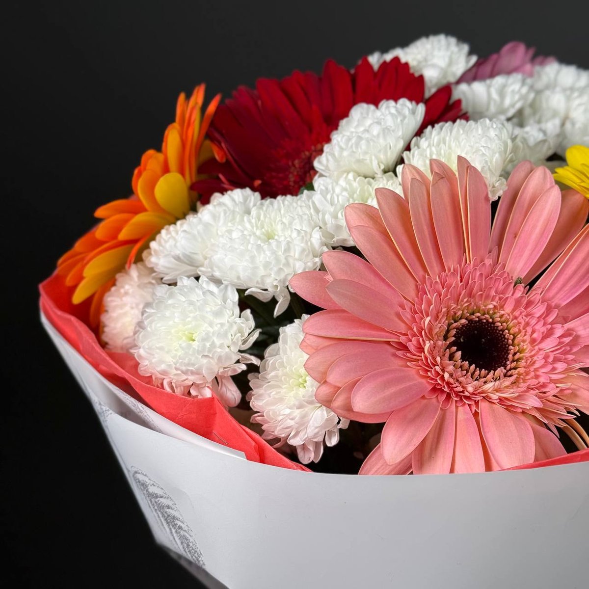 Яркий букет, который сразу создаёт настроение. Нежные герберы в разных оттенках и воздушные белые хризантемы собираются в живую палитру — тёплую, радостную и очень праздничную. Такой букет дарят, когда хотят удивить, порадовать или просто подарить кусочек хорошего дня. Смотрится свежо, аккуратно и вызывает искреннюю улыбку.