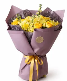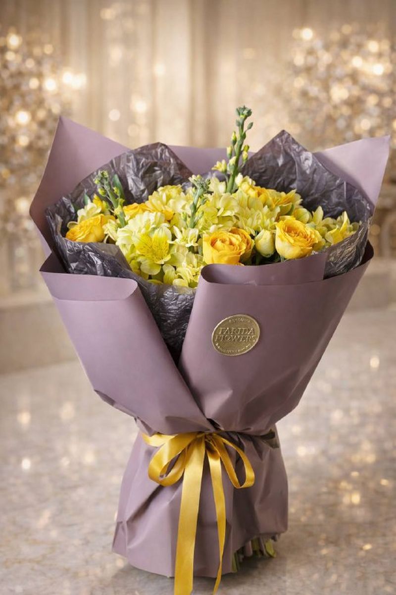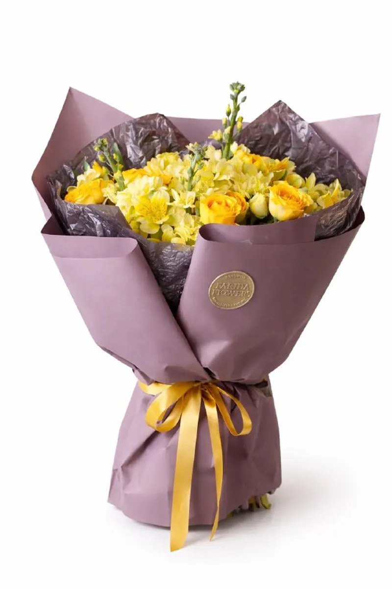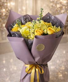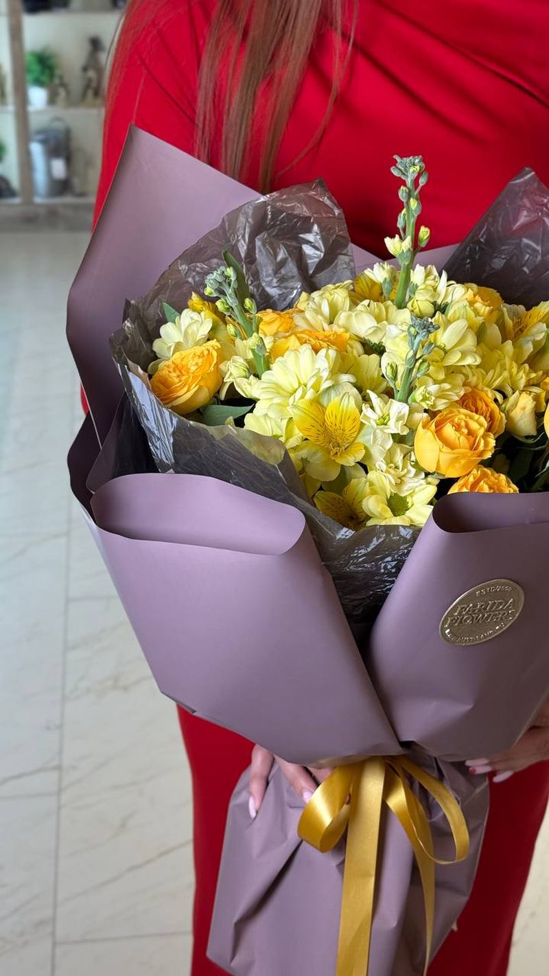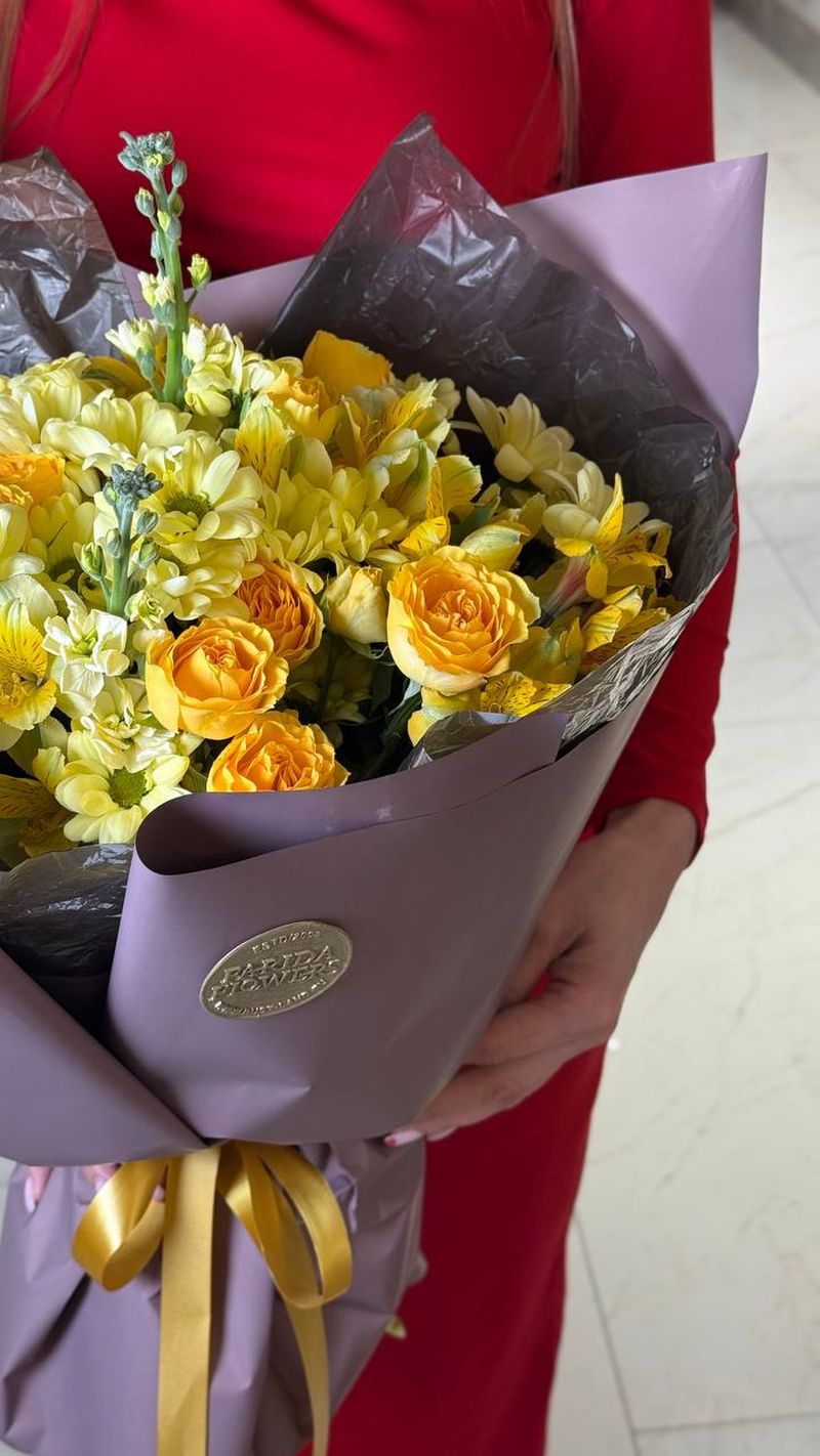 Солнечная композиция в тёплой жёлтой гамме — букет, который заряжает настроением с первого взгляда. Яркие розы в сочетании с пышными соцветиями и изящными вертикальными акцентами создают объём и динамику. Он выглядит живым, энергичным и очень статусным.