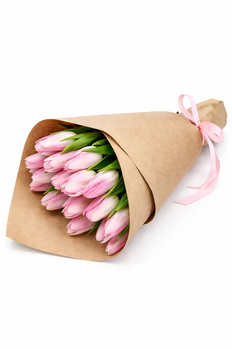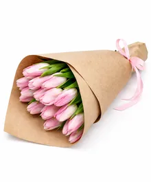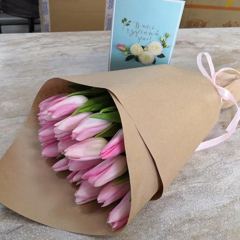 "Все краски цветущей весенней природы собран в букет. Букет создан из свежих тюльпанов, эти цветы славятся своими нежными оттенками и тонким ароматом весны. Благодаря стойкости, букет продлит праздник на несколько дней. Преподнесите этот букет и порадуйте подарком, в каждом лепестке которого живет весна."