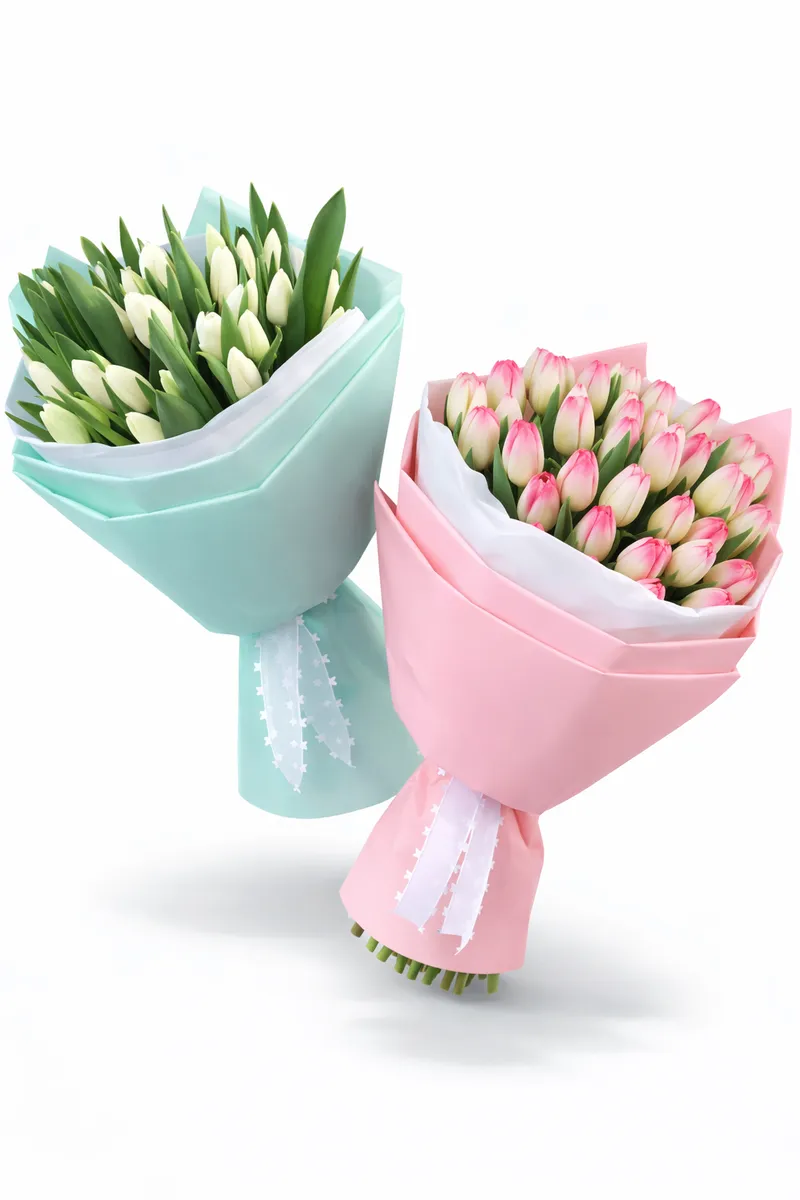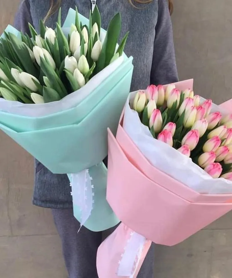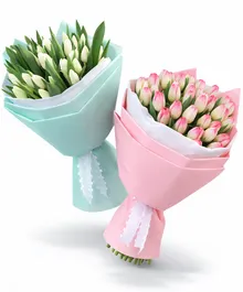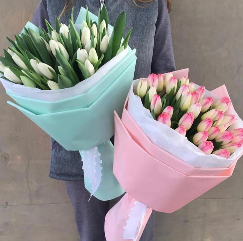"Все краски цветущей весенней природы собран в букет. Букет создан из свежих тюльпанов, эти цветы славятся своими нежными оттенками и тонким ароматом весны. Благодаря стойкости, букет продлит праздник на несколько дней. Преподнесите этот букет и порадуйте подарком, в каждом лепестке которого живет весна."