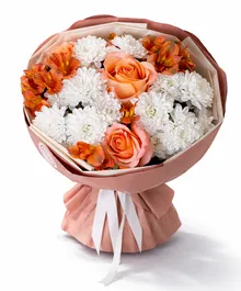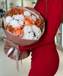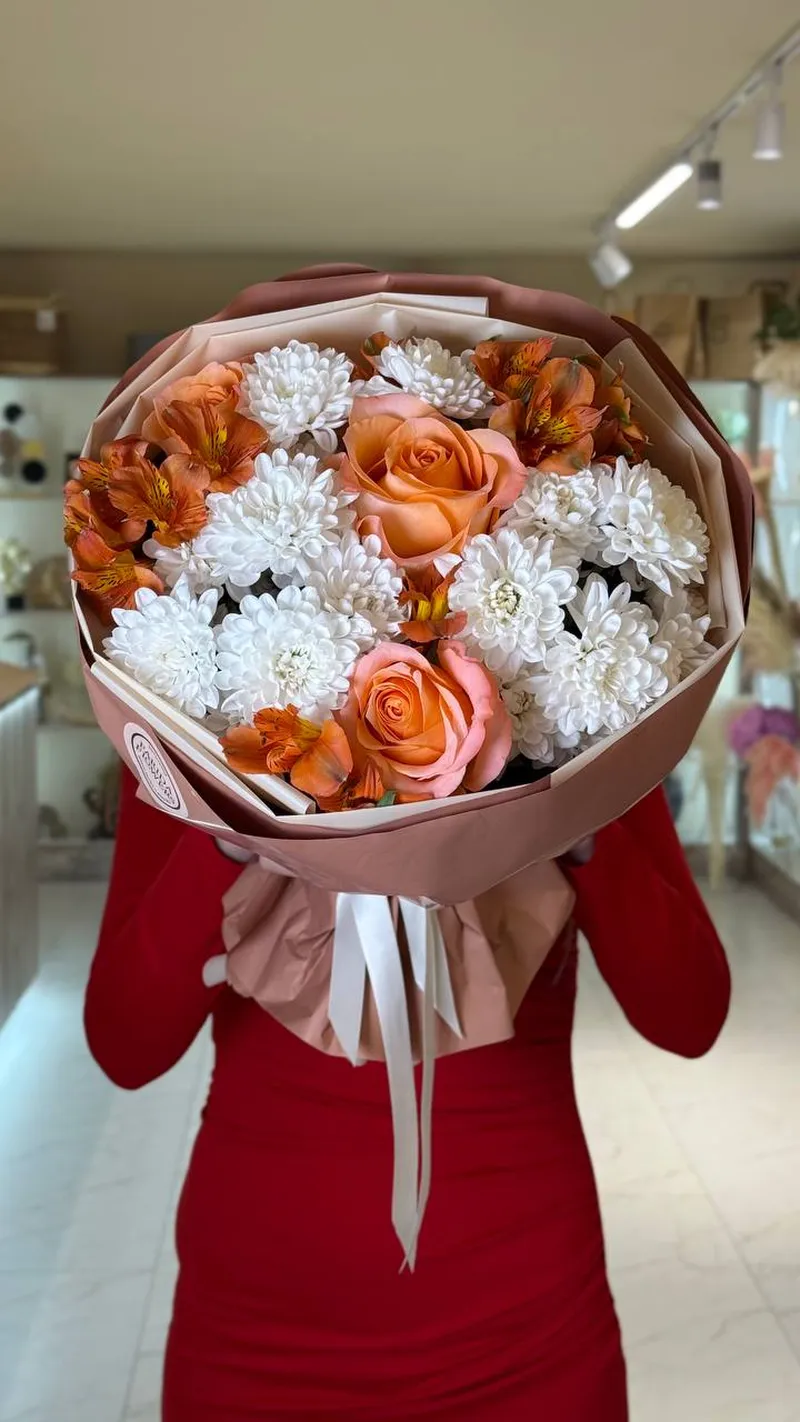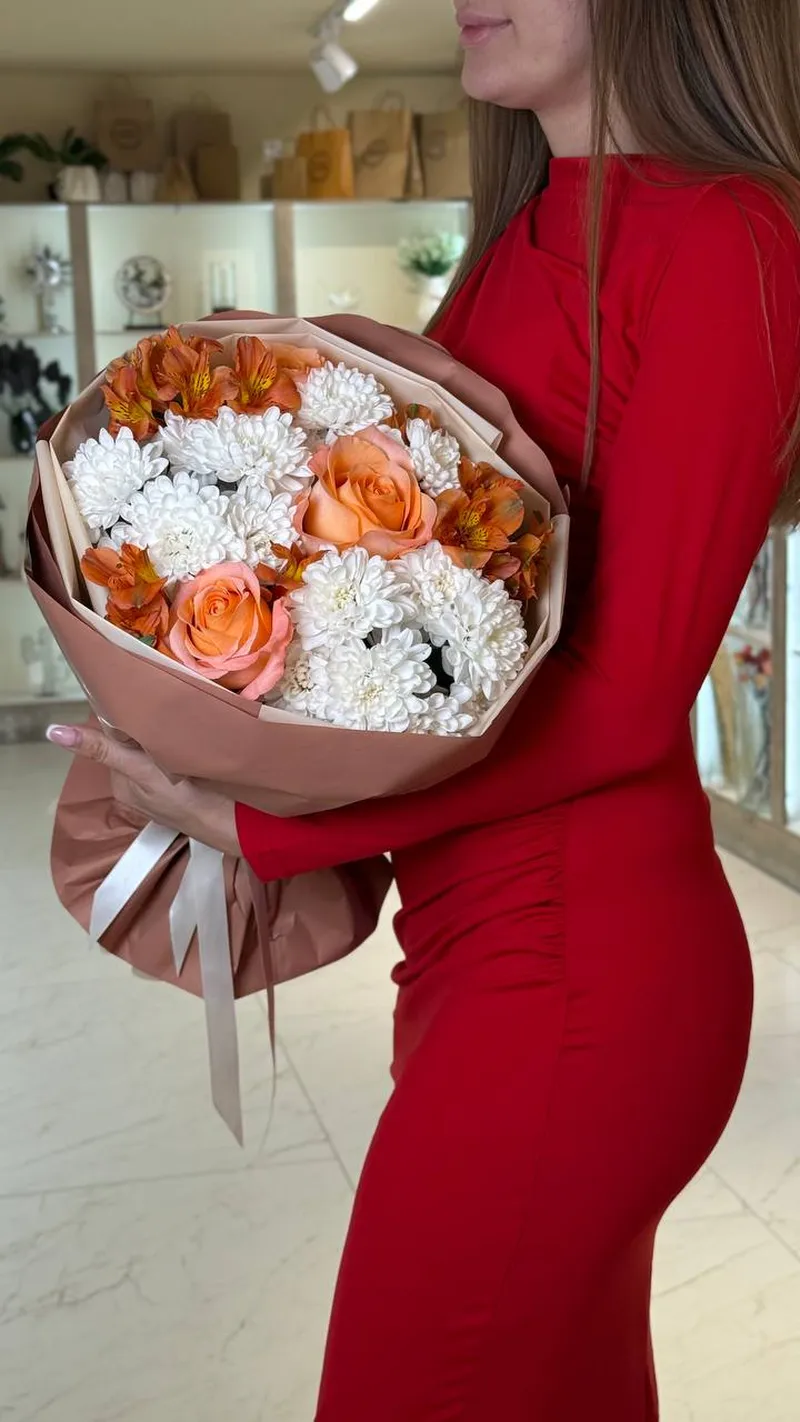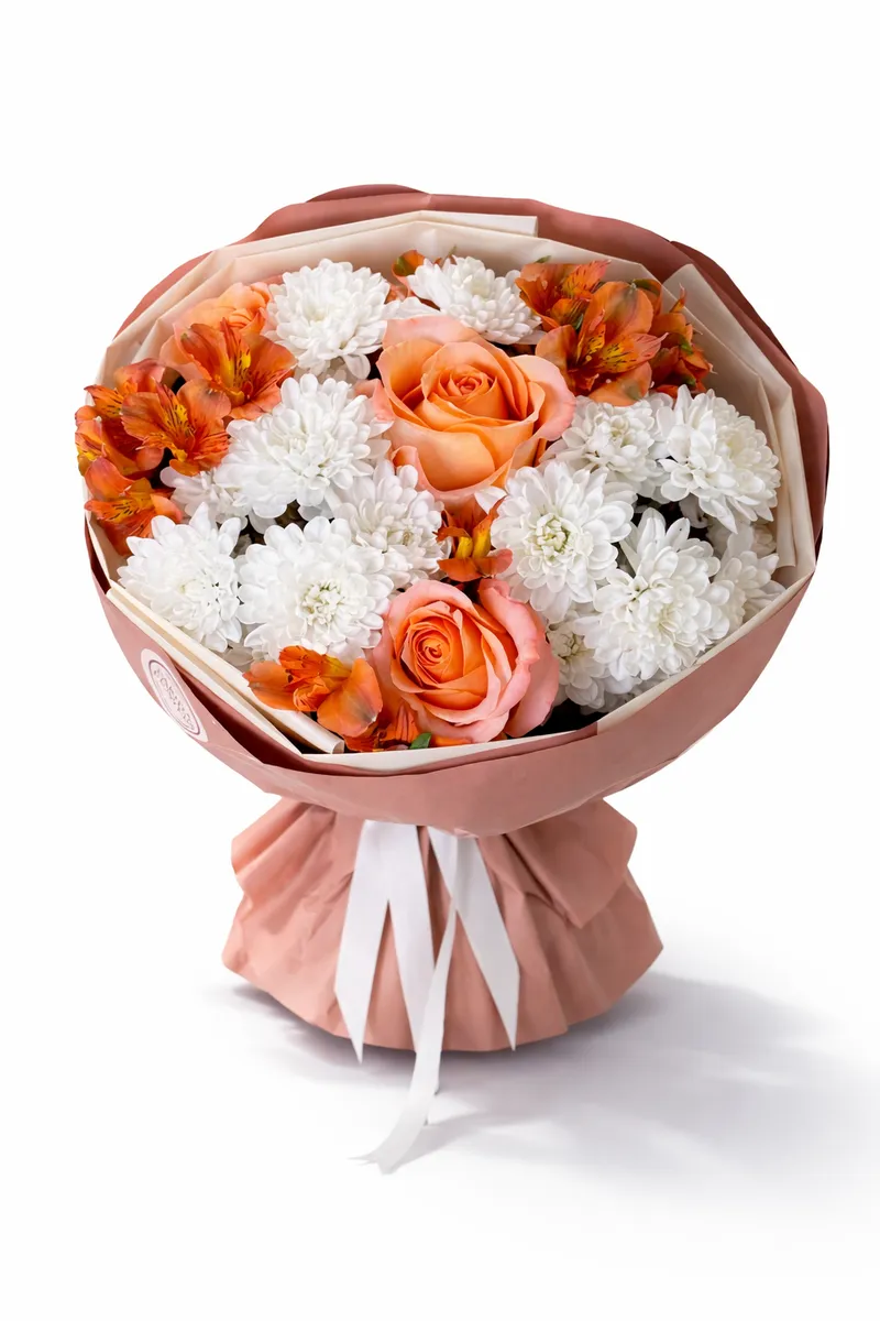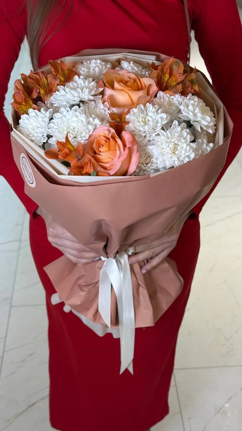 Стильная композиция из персиковых роз, белоснежных хризантем и тёплых альстромерий в оттенках карамели. Контраст нежной светлой базы и насыщенных оранжево-медовых акцентов создаёт объём и глубину. Упаковка в кофейно-бежевой гамме подчёркивает натуральность и премиальный характер букета.