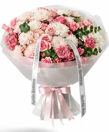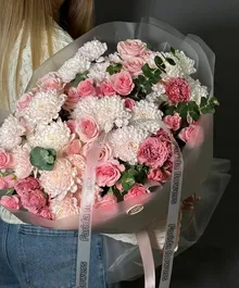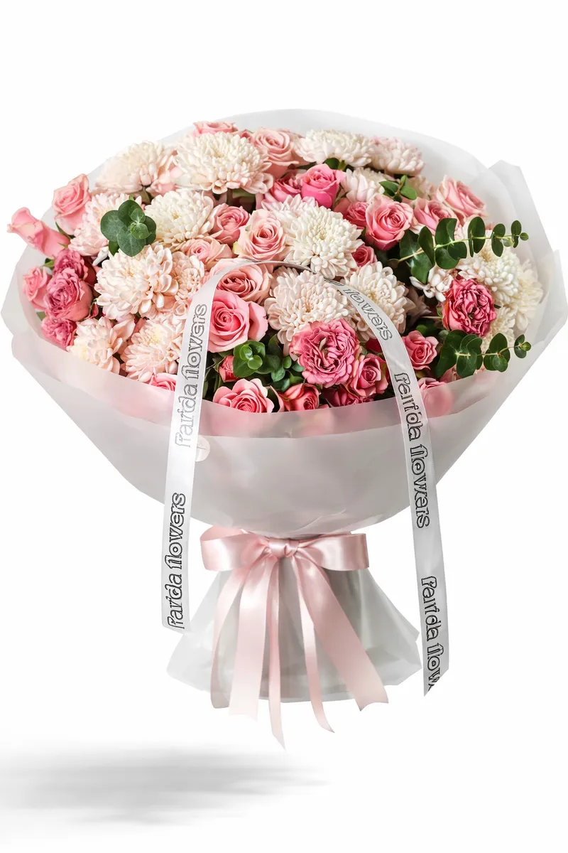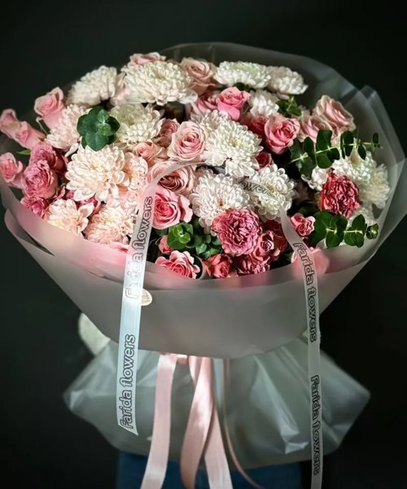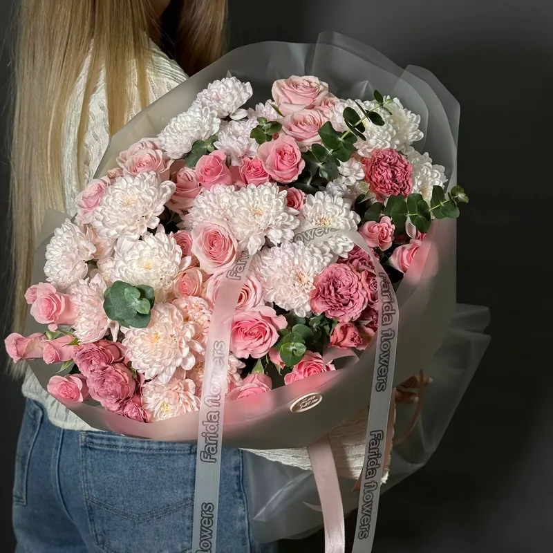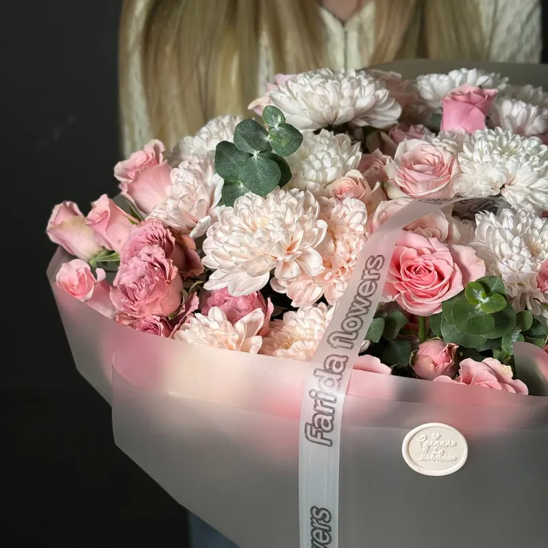 Эта композиция создана для тех, кто ценит эстетику высокого уровня. Мягкие розовые оттенки, контраст белоснежных и розовых соцветий и деликатные акценты эвкалипта придают букету утончённость и статусность. Он буквально «светится» — и вживую производит невероятное впечатление.