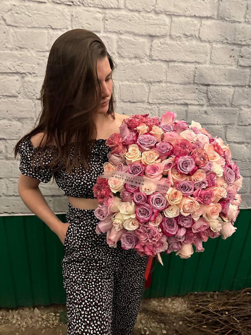 Если вы хотите подобрать для близкого человека роскошный букет, поражающий свои масштабом, и в тоже время желаете выделиться, то есть уйти от традиционных букетов из цветов одного оттенка, то этот вариант для вас. Перед вами микс из свежайших роз пяти разных цветов, и он совершенно не выглядит банально и традиционно.
