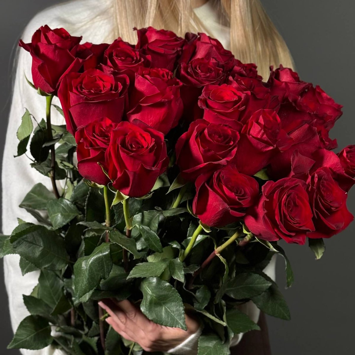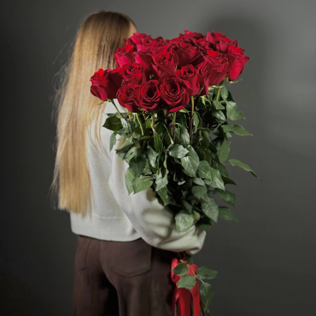Величественные красные розы длиной 130 см — символ силы, страсти и уважения.