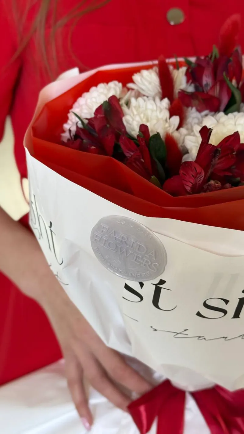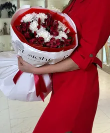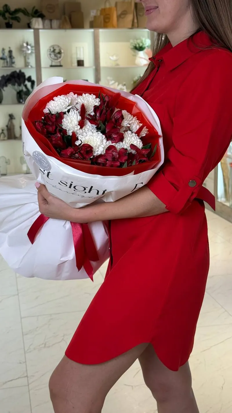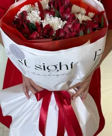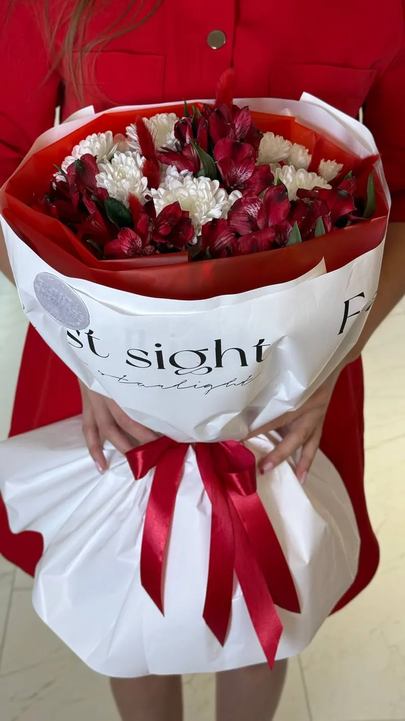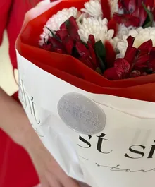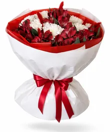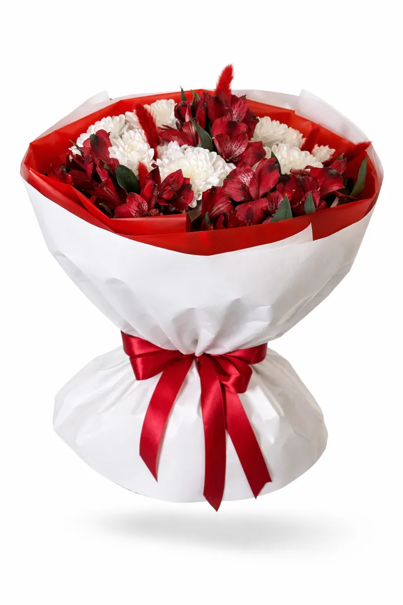 Эффектный букет в насыщенной красно-белой гамме: страстные алые альстромерии в сочетании с воздушными белыми хризантемами создают баланс нежности и огня. Контрастная упаковка в красном и белом с атласной лентой подчеркивает глубину оттенков и делает композицию по-настоящему праздничной.