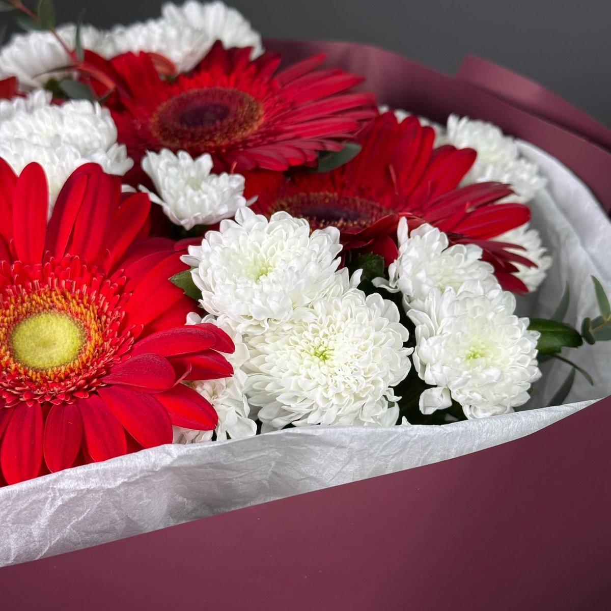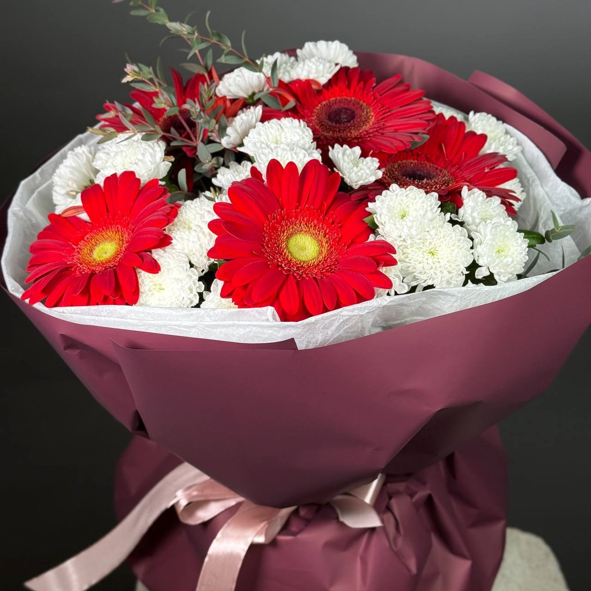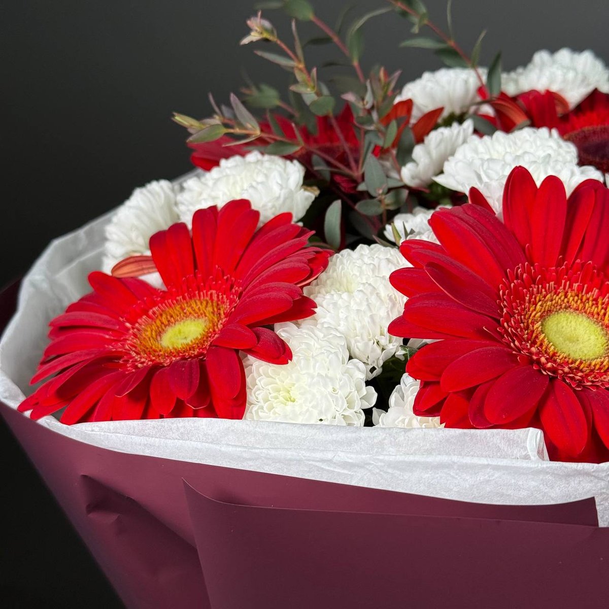 Яркий и уверенный букет, который сразу притягивает взгляд. Сочные красные герберы в сочетании с белыми хризантемами создают эффект праздничного настроения и чистой энергии. Такой букет выбирают, когда хочется порадовать маму, поздравить близкого человека или сделать момент особенным. Стильный, заметный и очень живой — он точно вызовет улыбку.