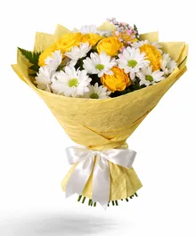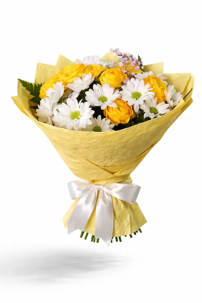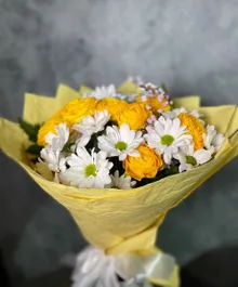 Букет в солнечных светлых оттенках будет прекрасным подарком, напоминающем о том, что лето всегда рядом. Букет – неординарный и яркий подарок с положительными эмоциями в комплекте.