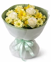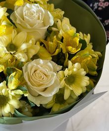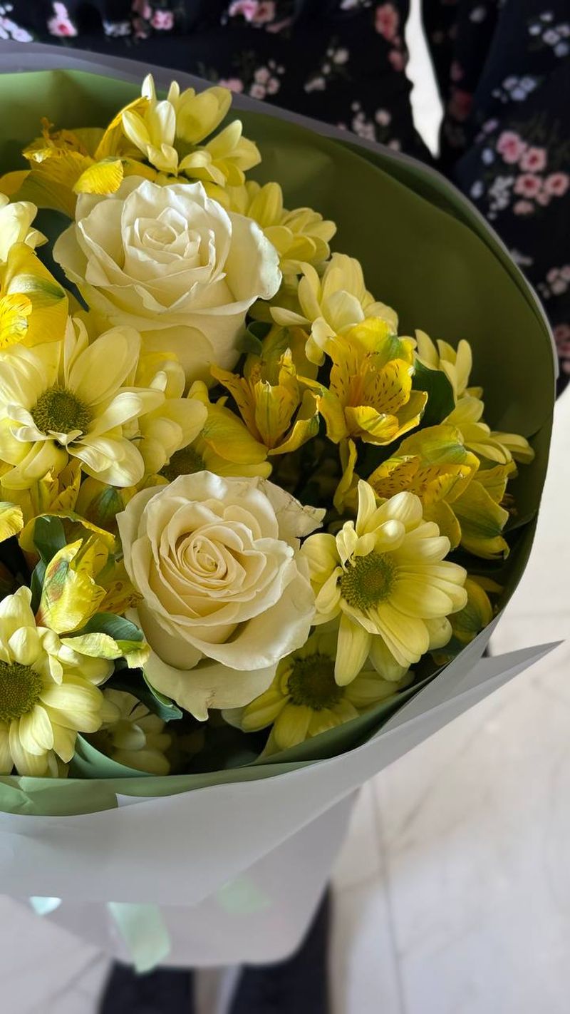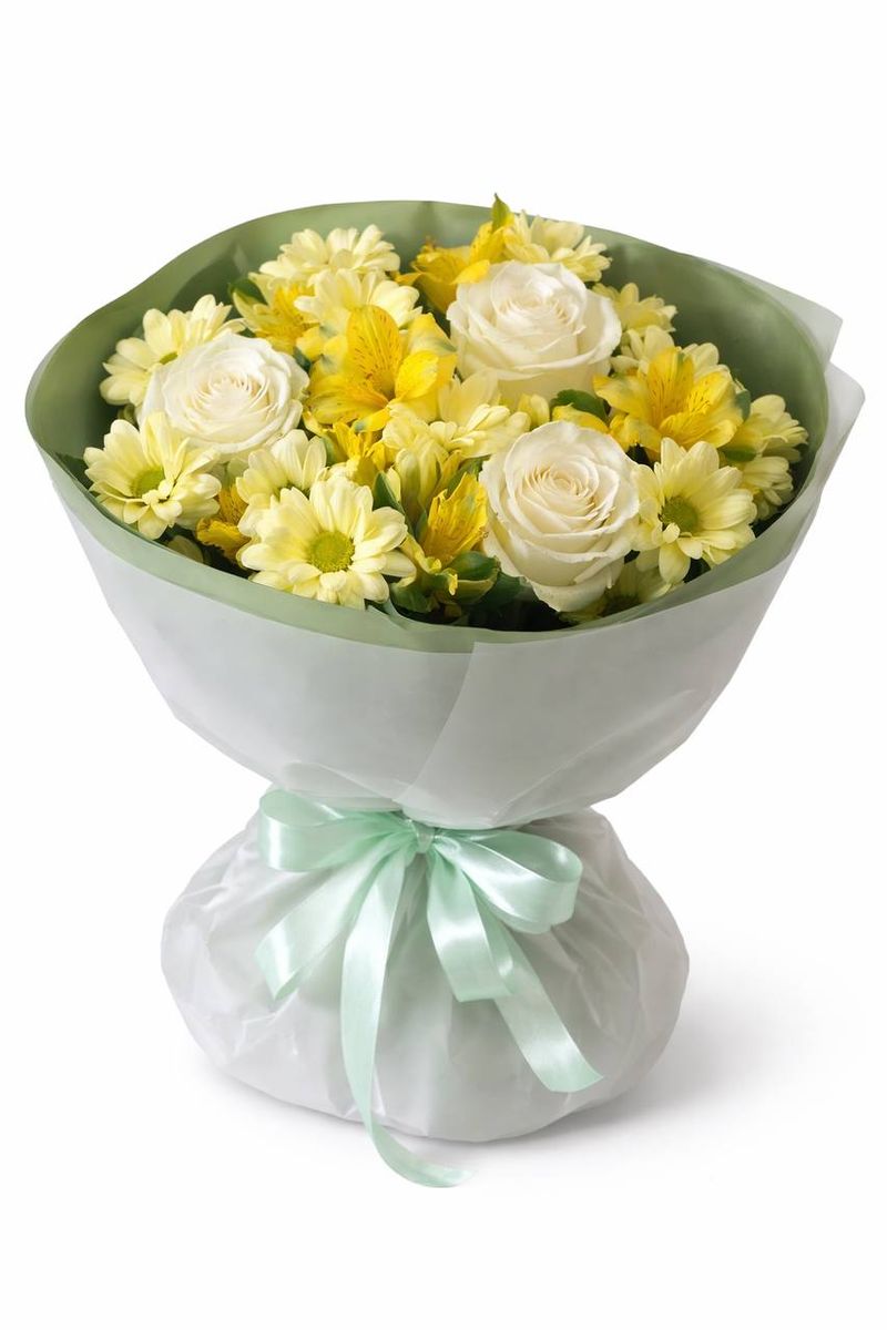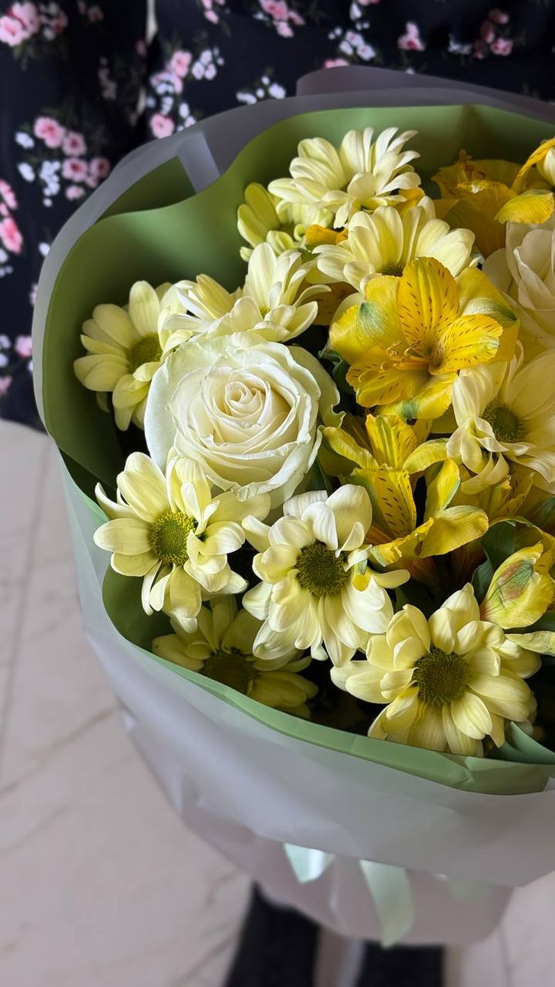 Светлая, солнечная композиция в свежей жёлто-кремовой гамме — букет, который моментально поднимает настроение. Нежные белые розы создают основу элегантности, а жёлтые альстромерии и хризантемы добавляют тепла и живой энергии. Цветы собраны плотно и аккуратно, формируя ровный, насыщенный объём.