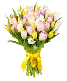 "Все краски цветущей весенней природы собран в этой яркий букет. Букет создан из свежих тюльпанов, эти цветы славятся своими нежными оттенками и тонким ароматом весны. Благодаря стойкости, букет продлит праздник на несколько дней. Преподнесите этот букет и порадуйте подарком, в каждом лепестке которого живет весна."