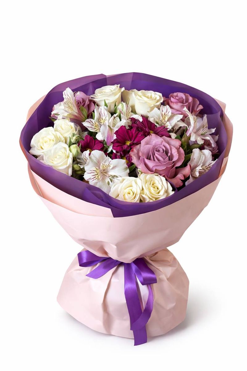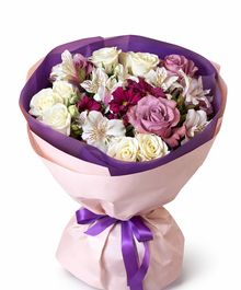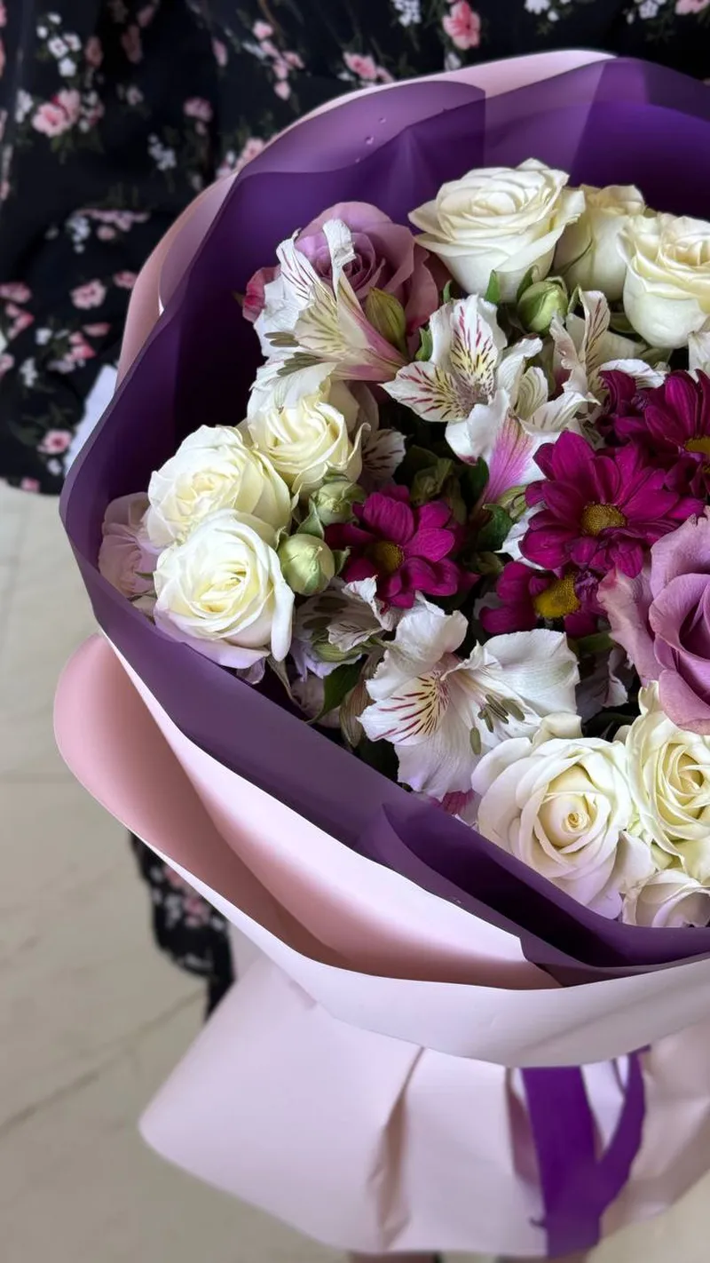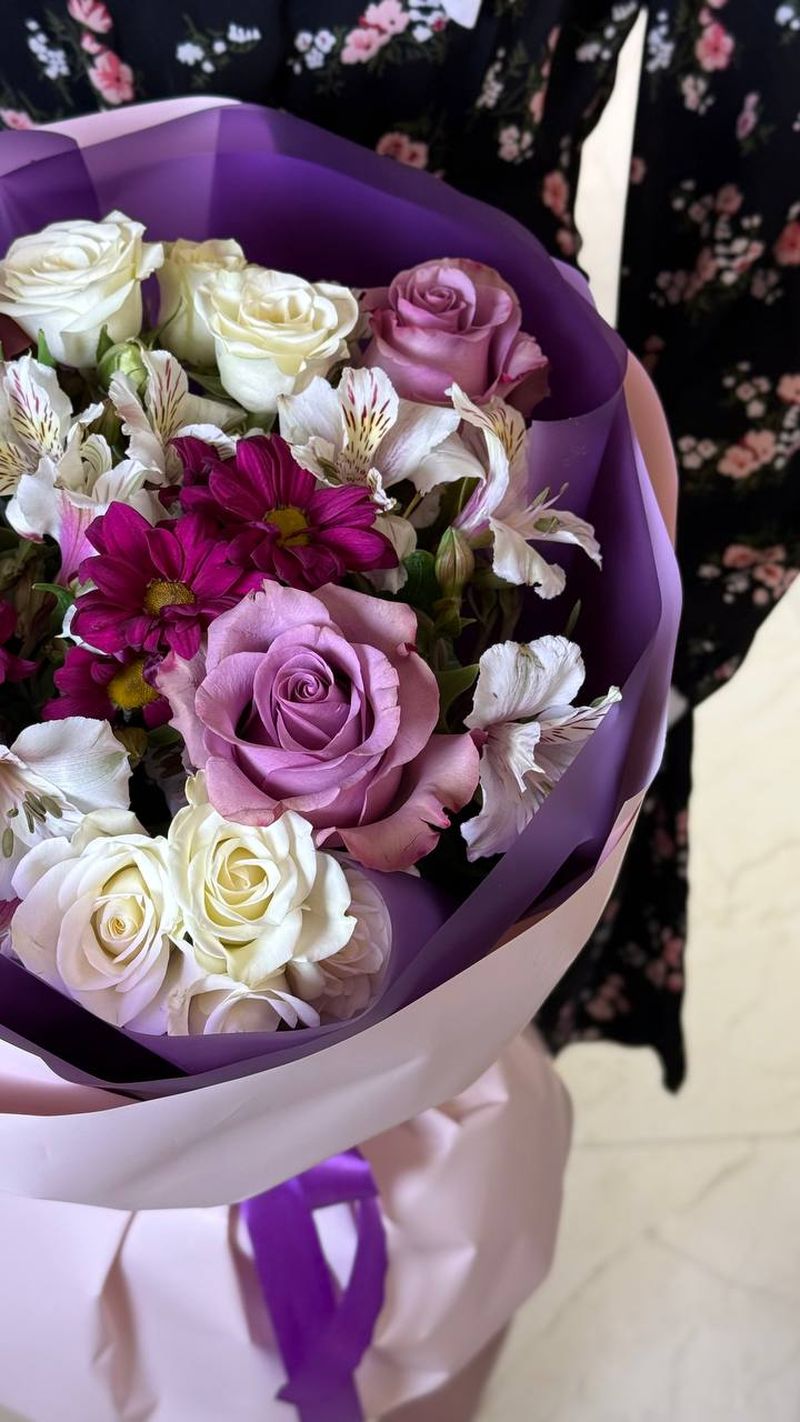 Эффектная композиция в контрастной палитре — букет, который притягивает взгляд с первого секунды. Нежные кремовые розы переплетаются с пудровыми и сиреневыми оттенками, а яркие акценты фуксии добавляют глубины и характера. Альстромерии создают лёгкость и динамику, делая композицию живой и многослойной.