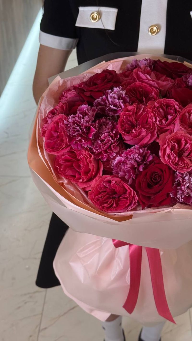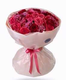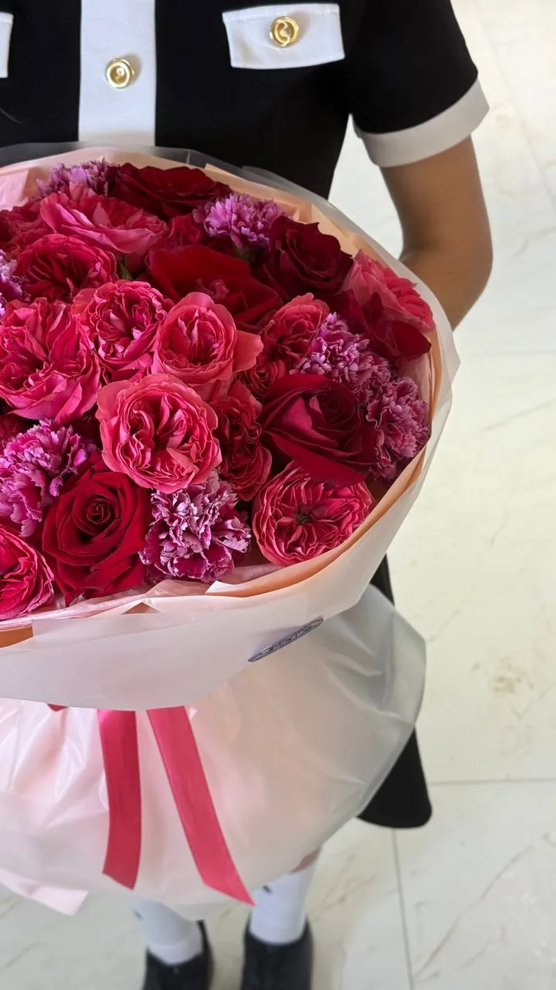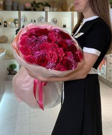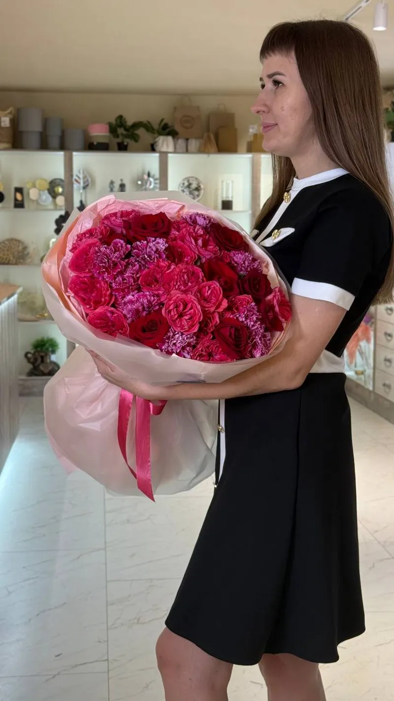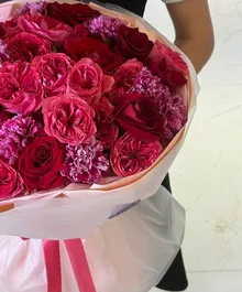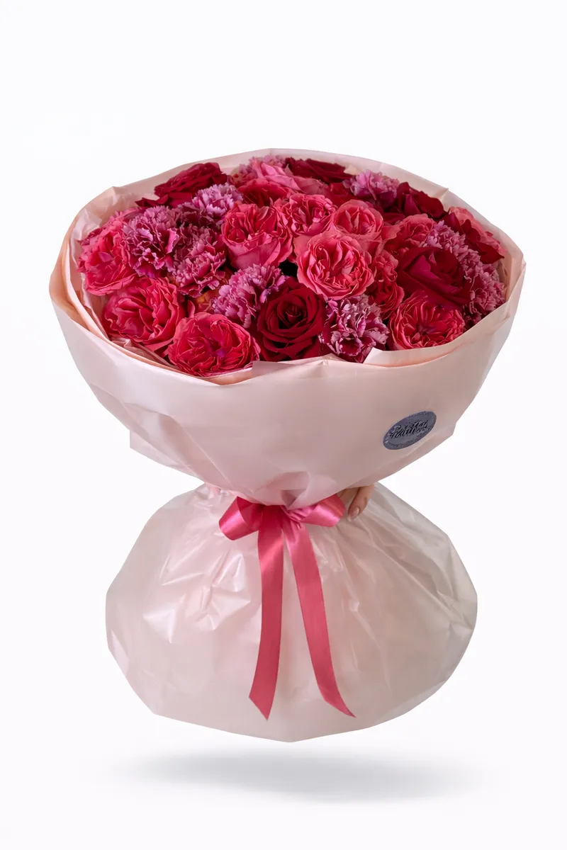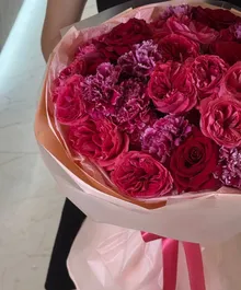 Объёмная композиция из бархатных красных роз, пионовидных роз и насыщенных гвоздик в оттенках фуксии и бордо создаёт плотное, роскошное полотно цвета. Мягкая пудровая упаковка аккуратно обрамляет яркую сердцевину, усиливая контраст и глубину композиции.