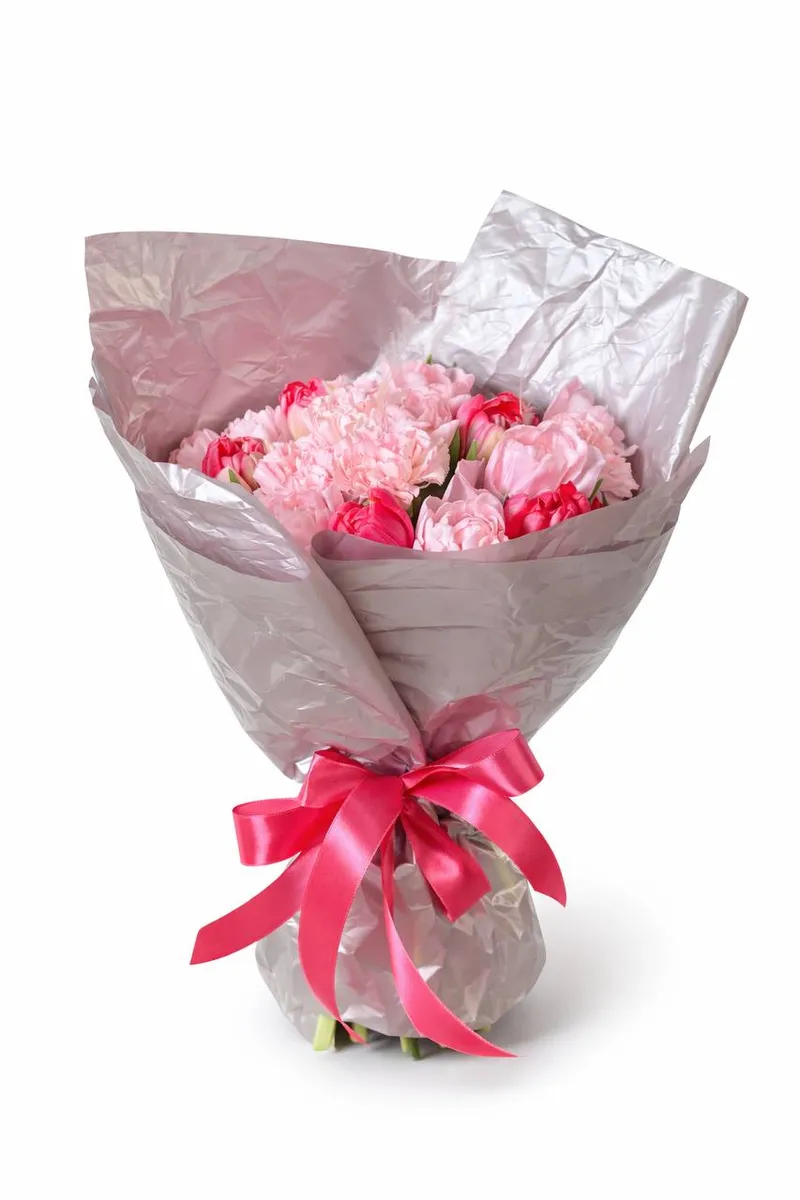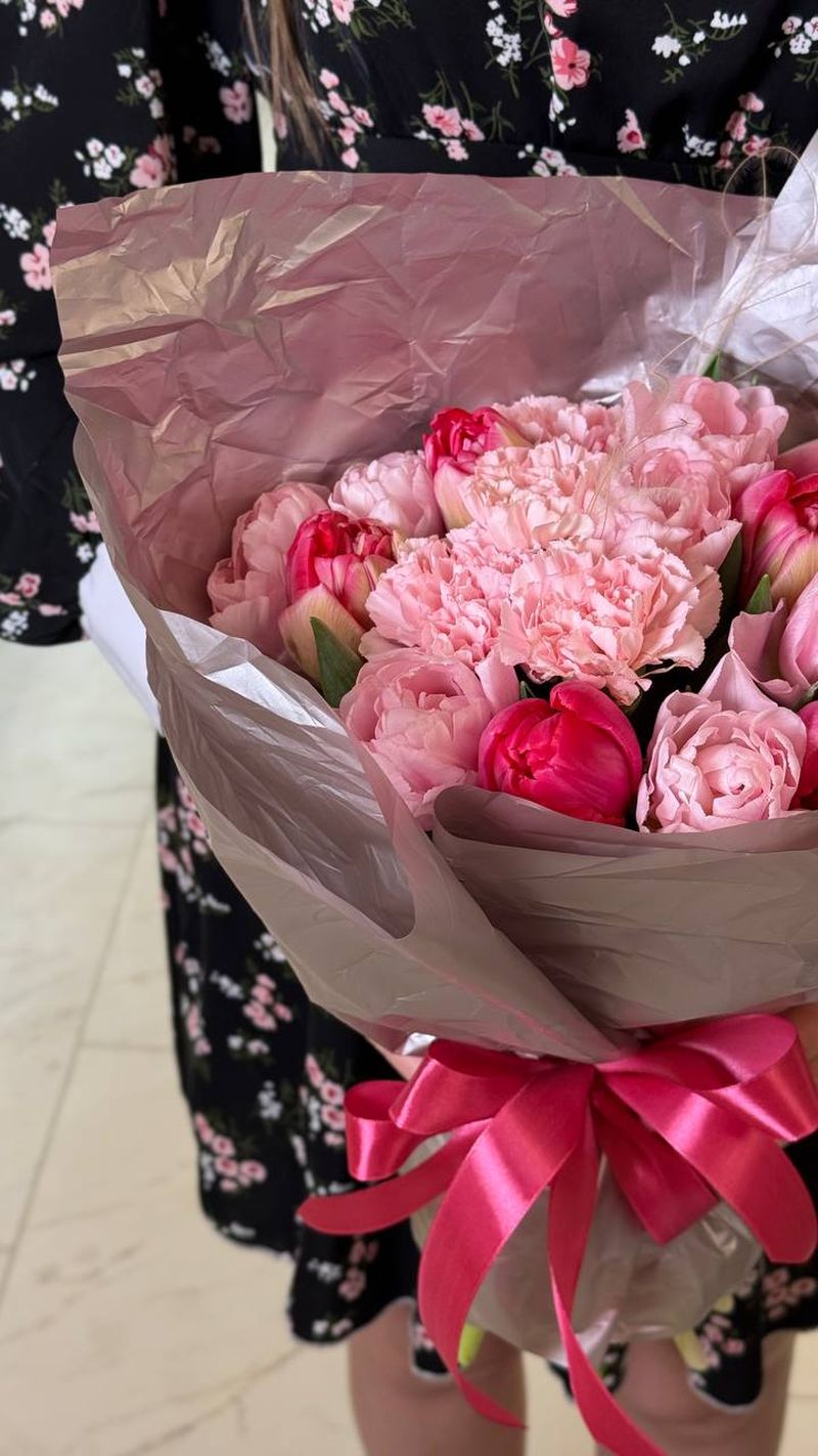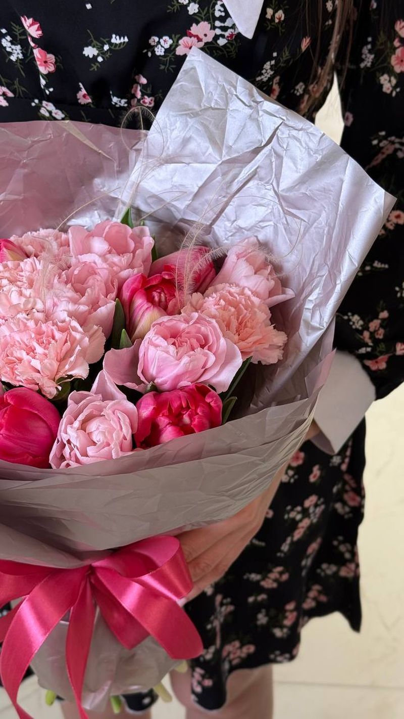 Романтичная композиция в розовой палитре — букет, который говорит о чувствах без лишних слов. Нежные пионовидные тюльпаны и воздушные гвоздики создают мягкий, пышный объём, а яркие акценты добавляют глубины и выразительности. Цветы собраны плотно, поэтому букет выглядит насыщенно и дорого.