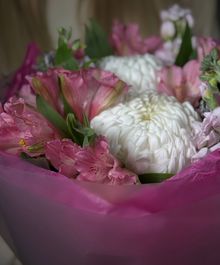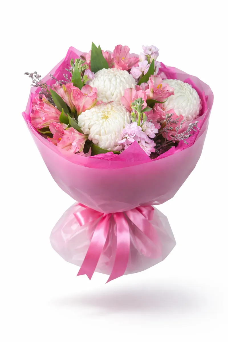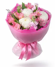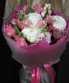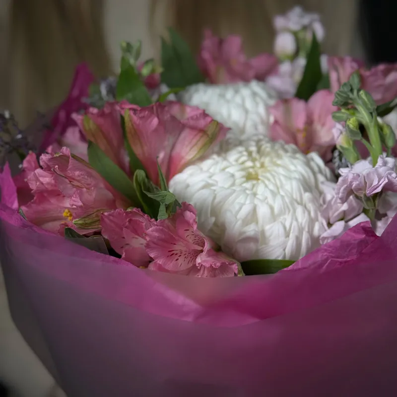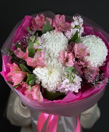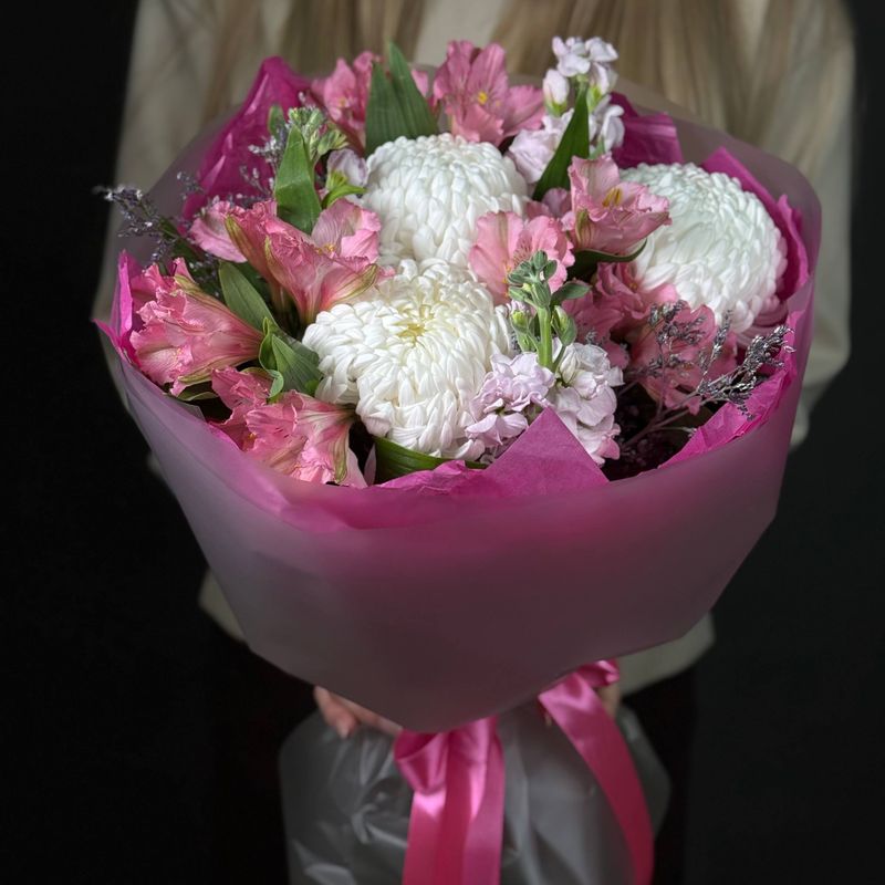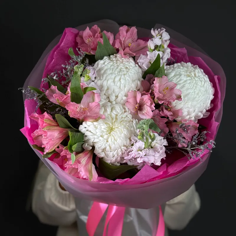 Букет «Mi Mi» — это воплощение мягкости и искренности. Белоснежная хризантема бигуди делает композицию воздушной и объёмной, а розовая альстромерия добавляет игривость и лёгкий романтичный акцент.