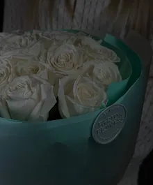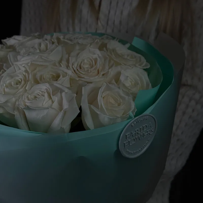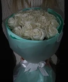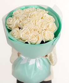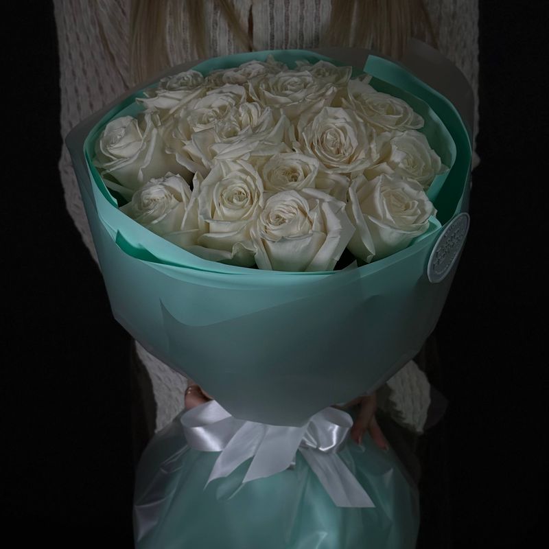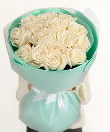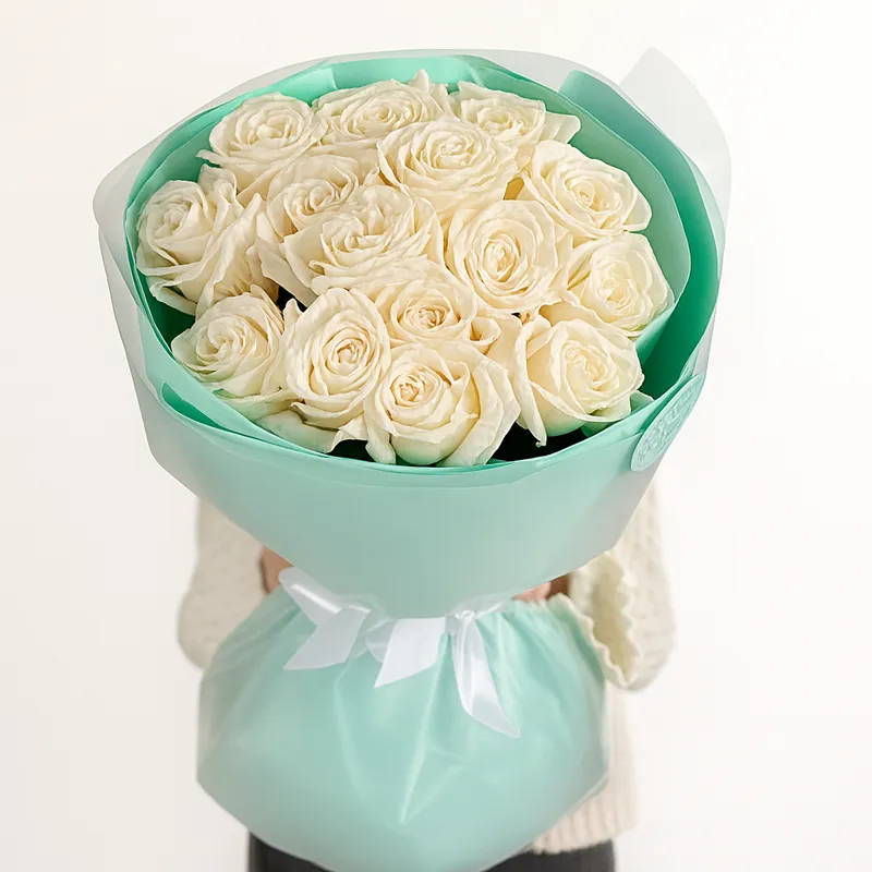 Нежный букет из 15 кремовых роз в мятной упаковке — аккуратный, чистый, тёплый, как мамины руки.