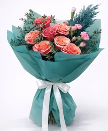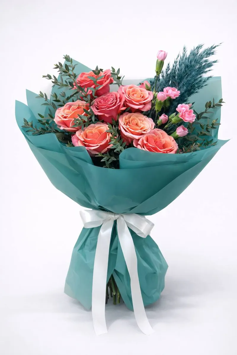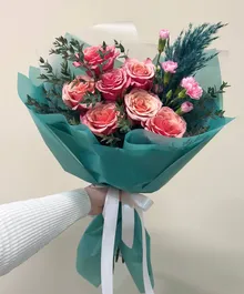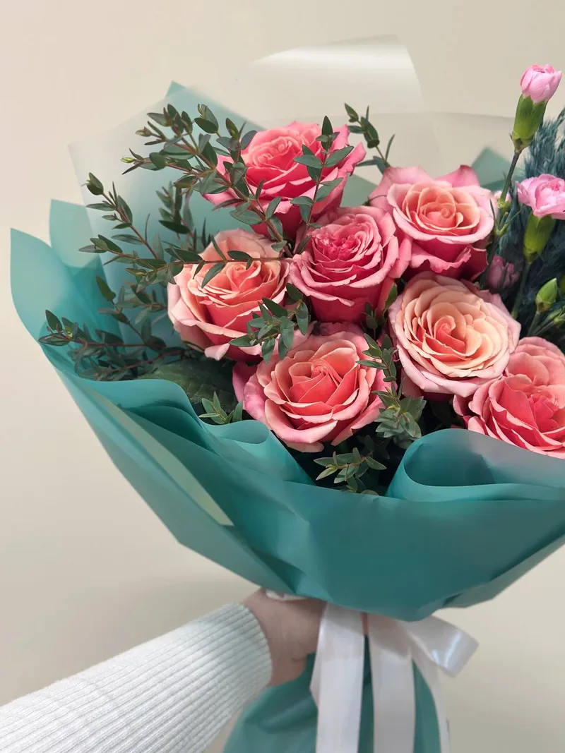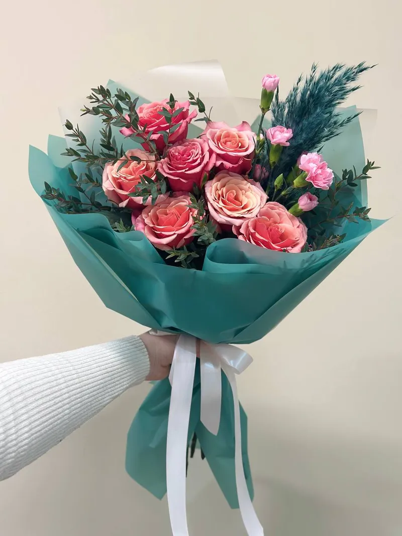 Элегантный букет из розовых роз в свежем мятном оформлении — как утренний воздух после дождя. Нежные оттенки лепестков подчёркнуты фактурной зеленью и аккуратными акцентами, создавая чувство спокойствия, стиля и утончённой заботы. Идеален для тех, кто ценит современную классику и лёгкую, ненавязчивую роскошь.