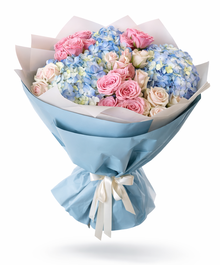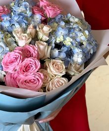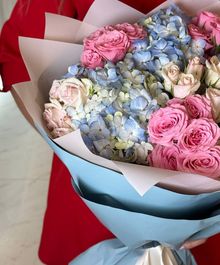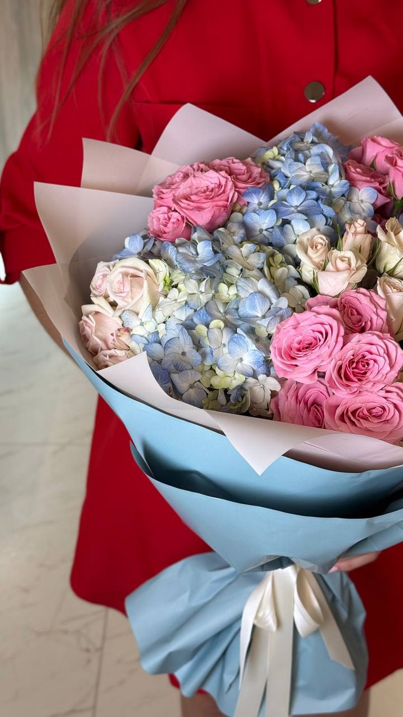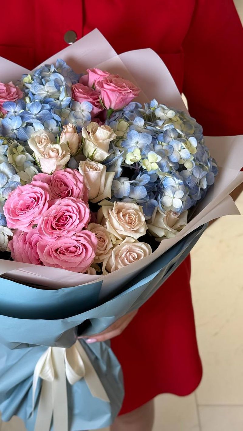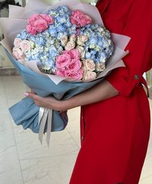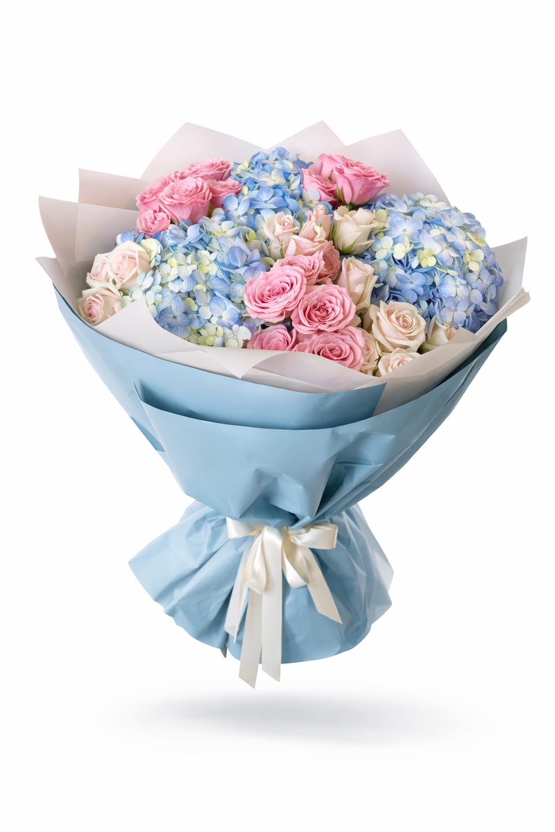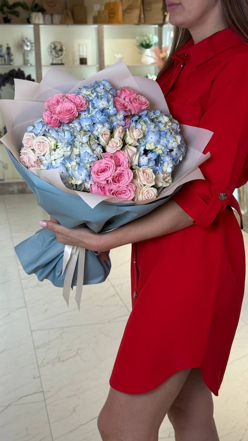 Объёмная композиция из пышной голубой гортензии, нежных кремовых и розовых роз создаёт эффект мягкого облака с яркими акцентами. Холодные небесные оттенки гармонично переплетаются с тёплой розовой палитрой, создавая глубину и благородство. Стильная многослойная упаковка подчёркивает масштаб и премиальный характер букета.