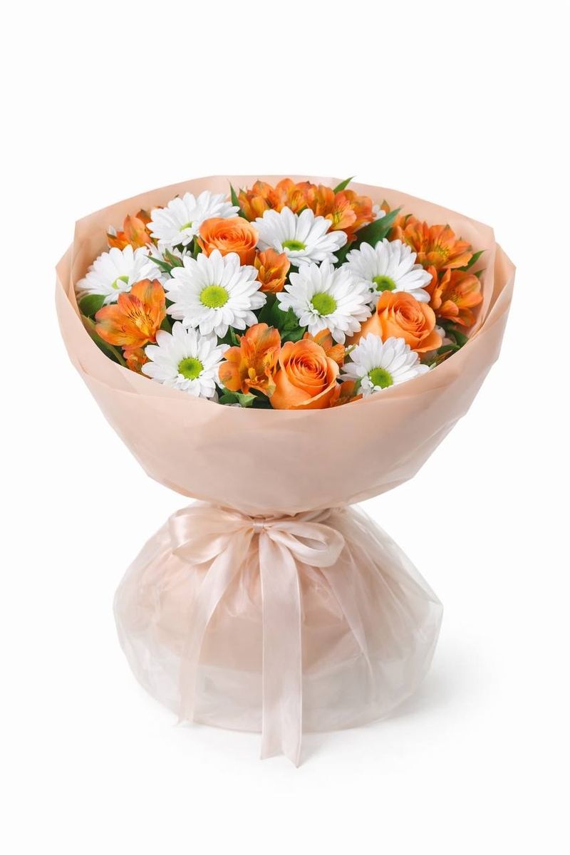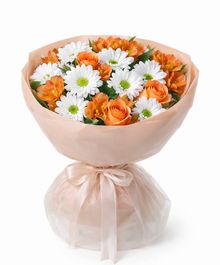 Яркая и жизнерадостная композиция в тёплой солнечной гамме — букет, который заряжает настроением с первого взгляда. Сочные оранжевые розы и альстромерии создают динамику и энергию, а белые хризантемы добавляют свежести и лёгкости. Контраст оттенков делает композицию живой и выразительной.