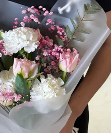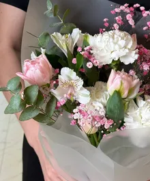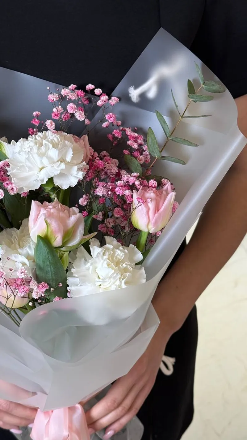 Лёгкая, воздушная композиция в пастельной гамме — букет, который выглядит как нежный комплимент. Розовые тюльпаны, белые гвоздики и альстромерии гармонично переплетаются с облаком мелкой розовой гипсофилы и свежими веточками эвкалипта. Текстура получается многослойной, живой и очень деликатной.