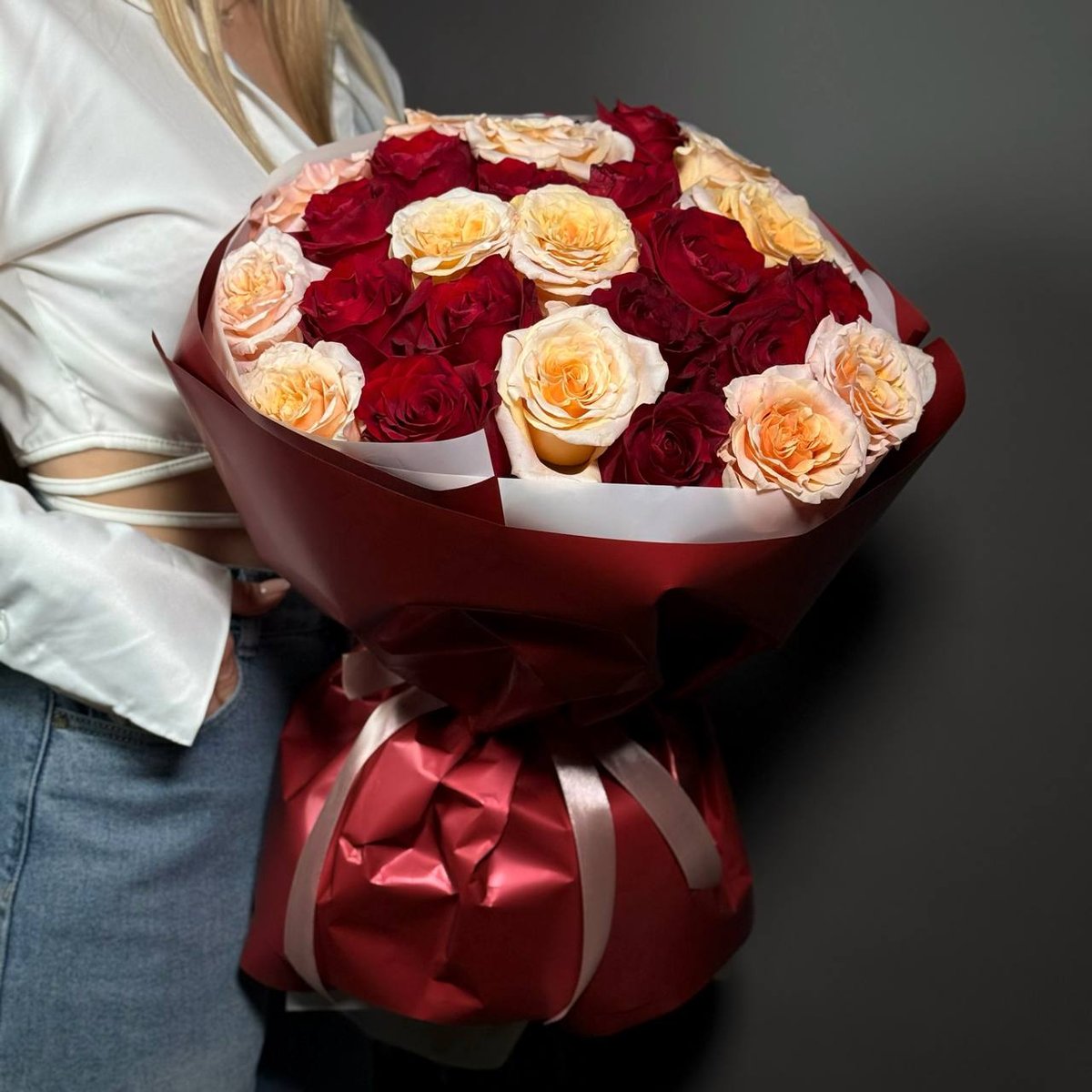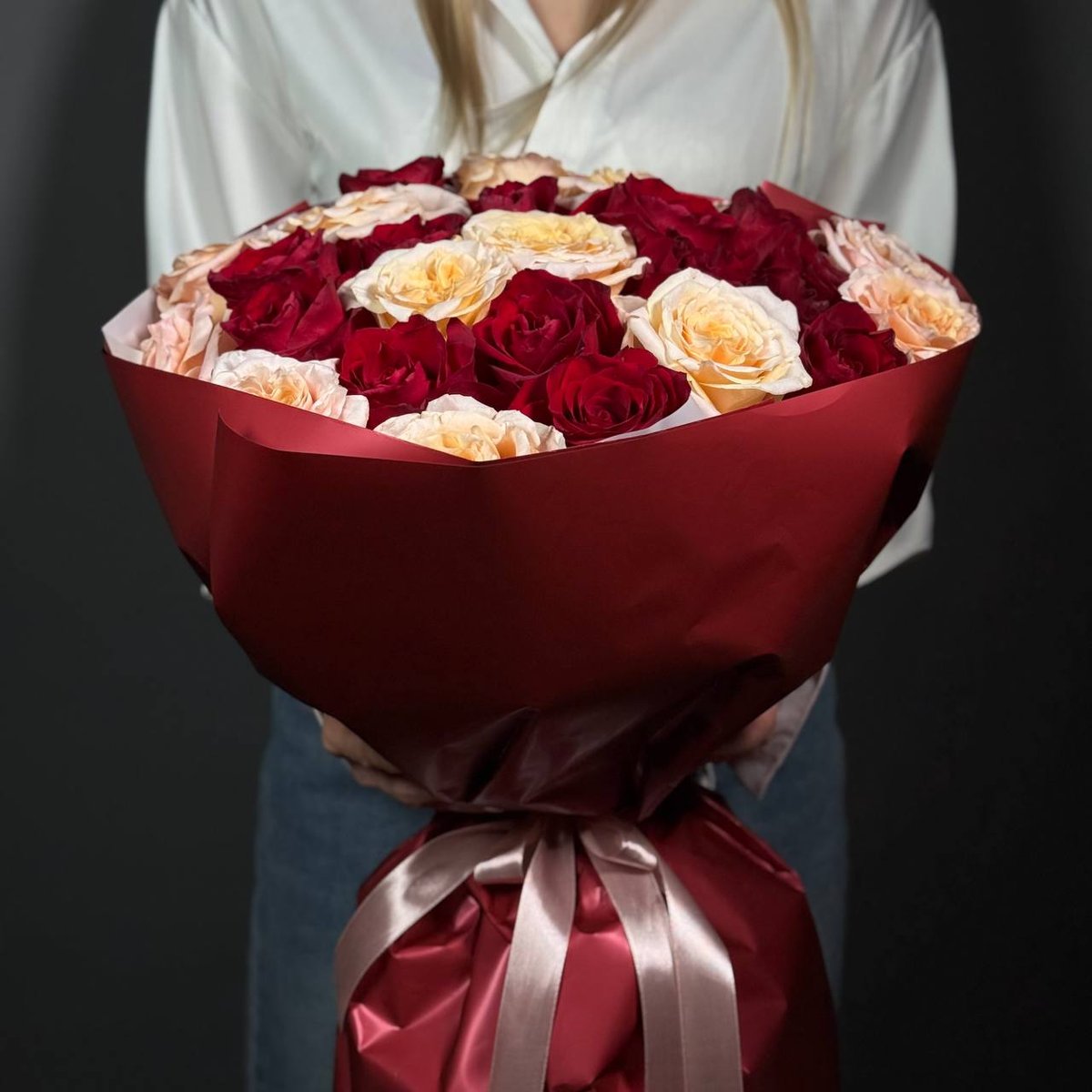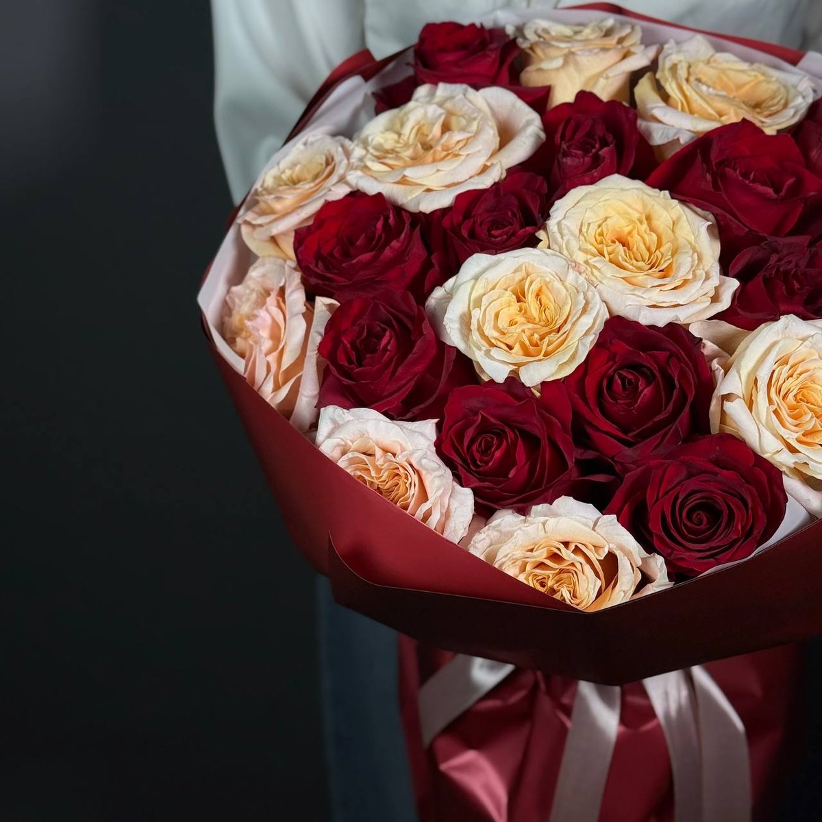 Эффектный букет из бордовых и кремовых роз — для той, чьё «строго, но с любовью» слышно с детства. Немного строгости, немного тепла и бесконечная любовь, спрятанная в каждом лепестке.
