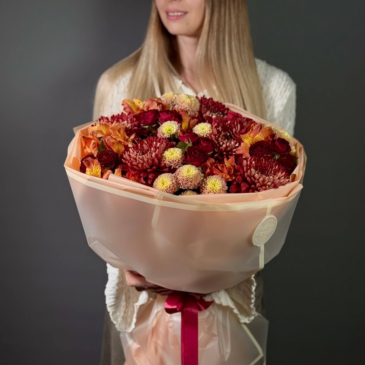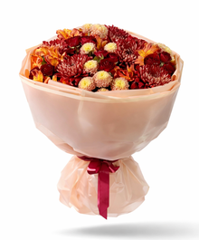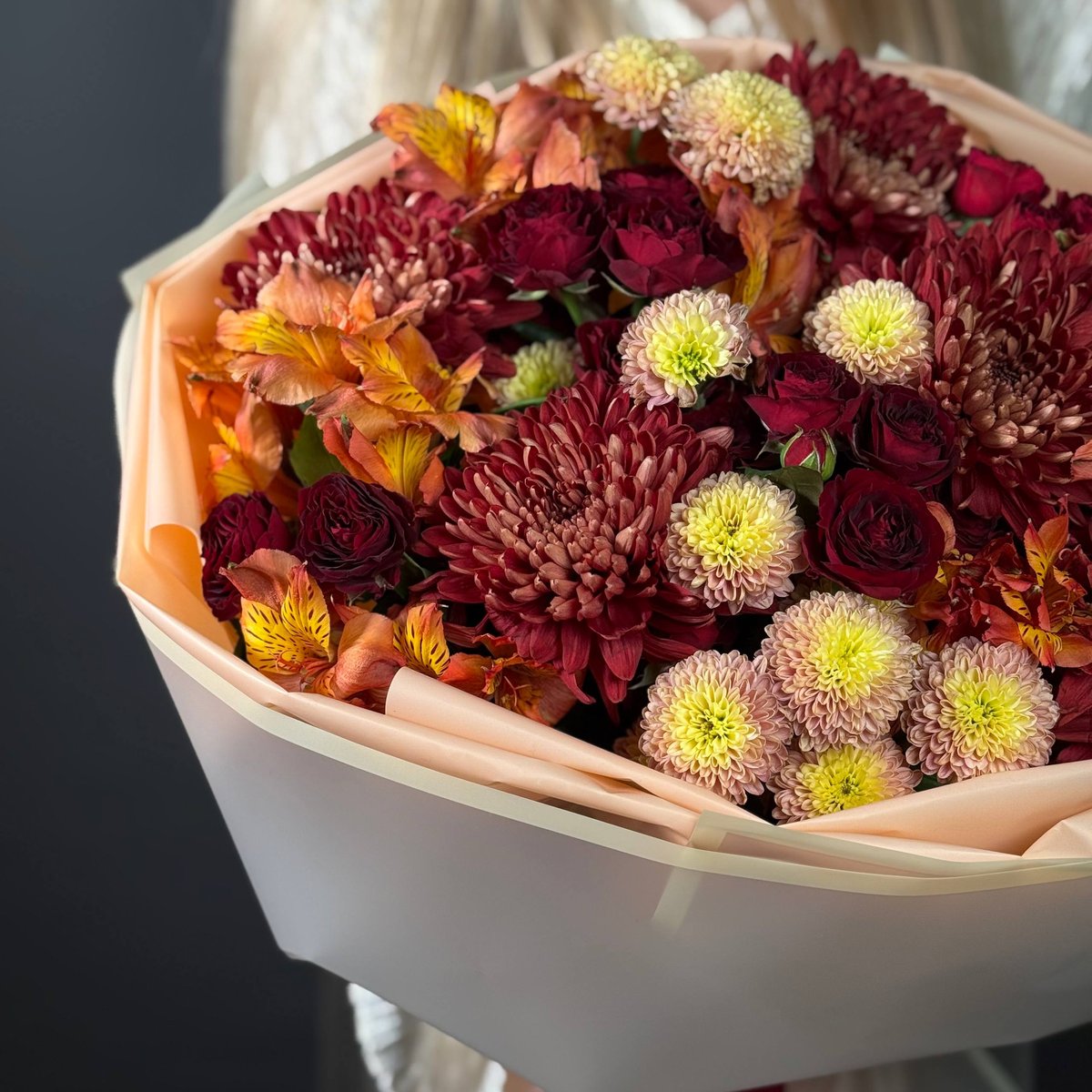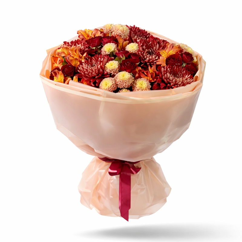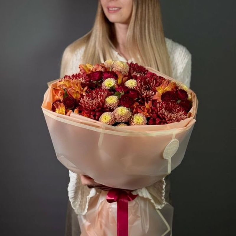 Букет в тёплых осенних оттенках — бордо, янтарь и карамель.