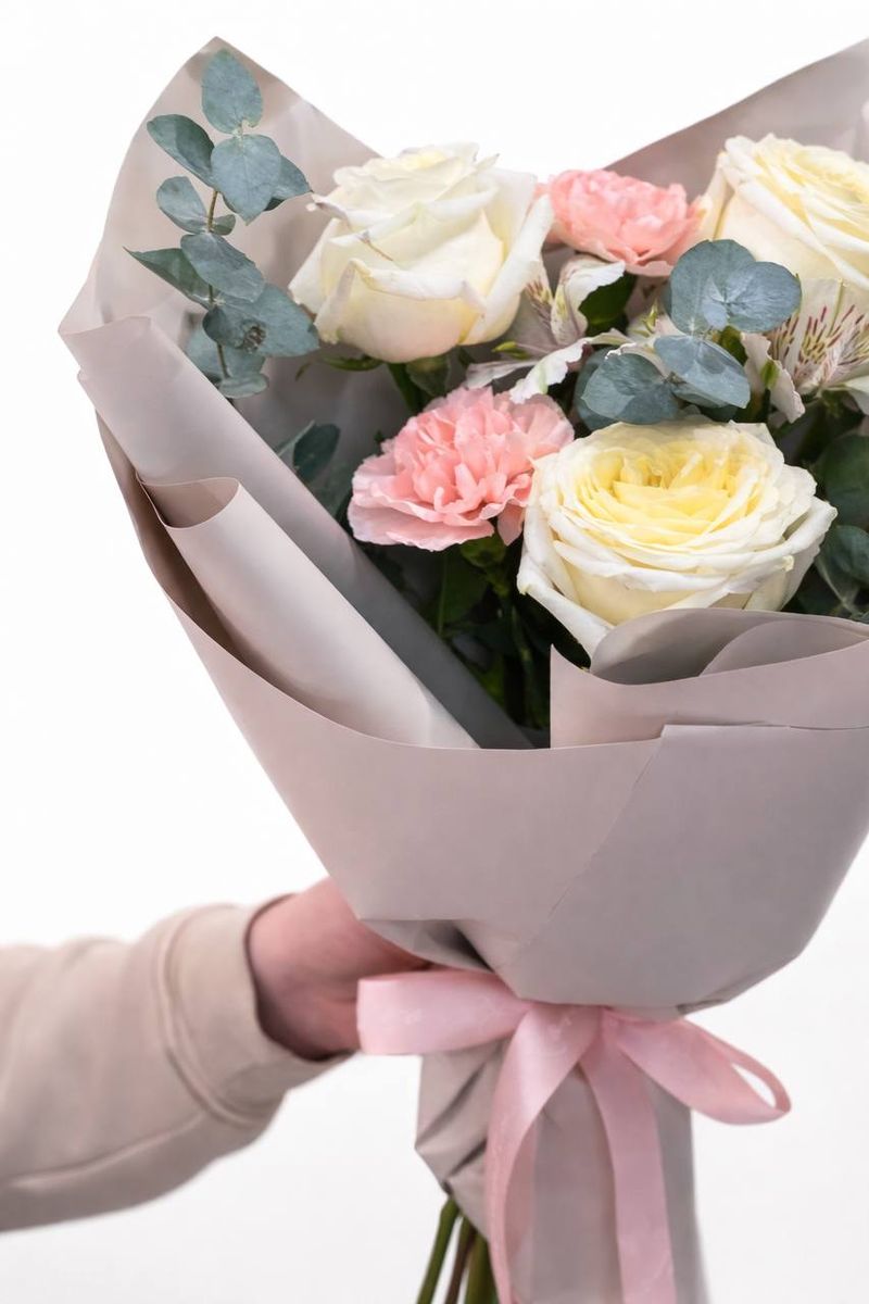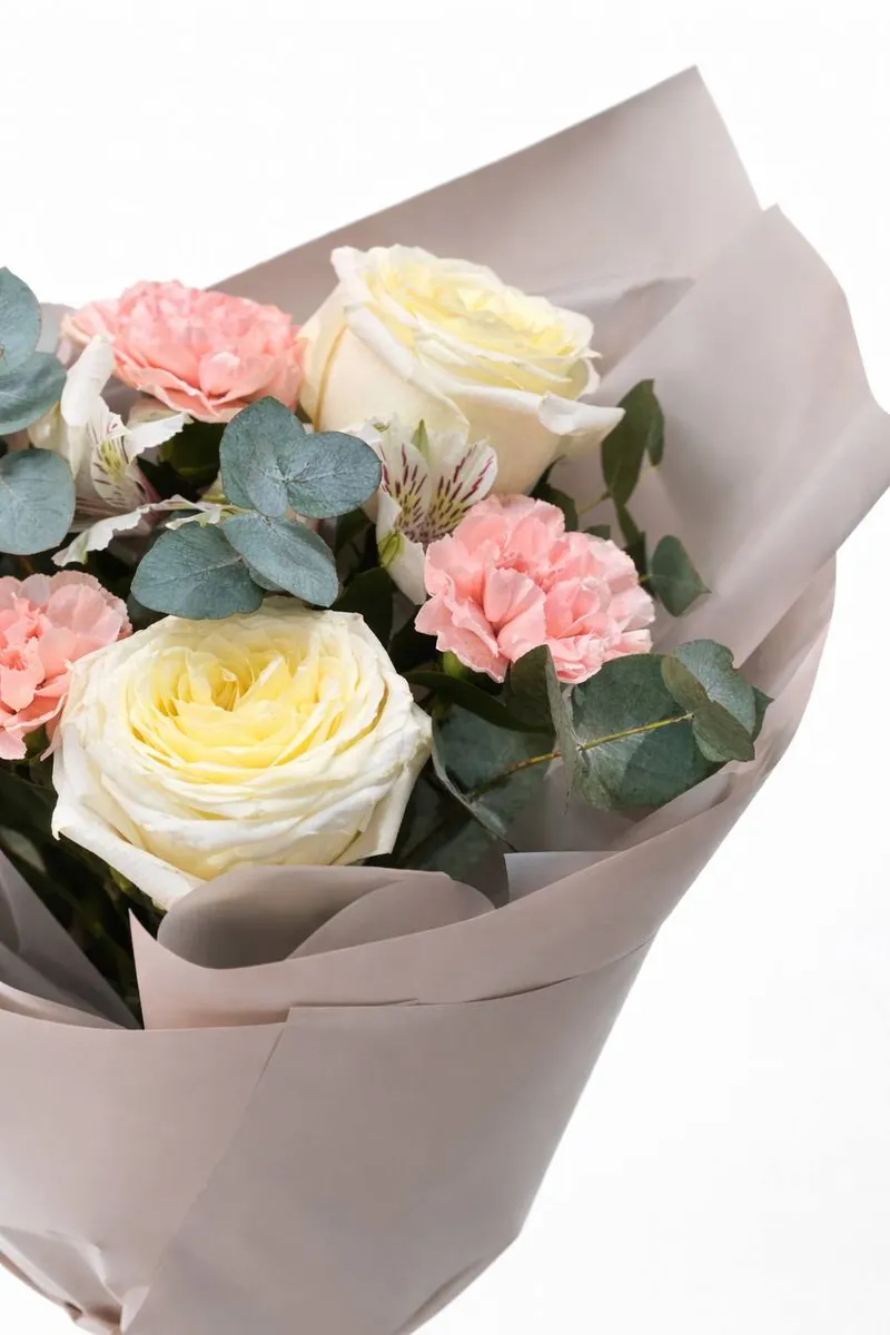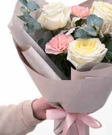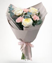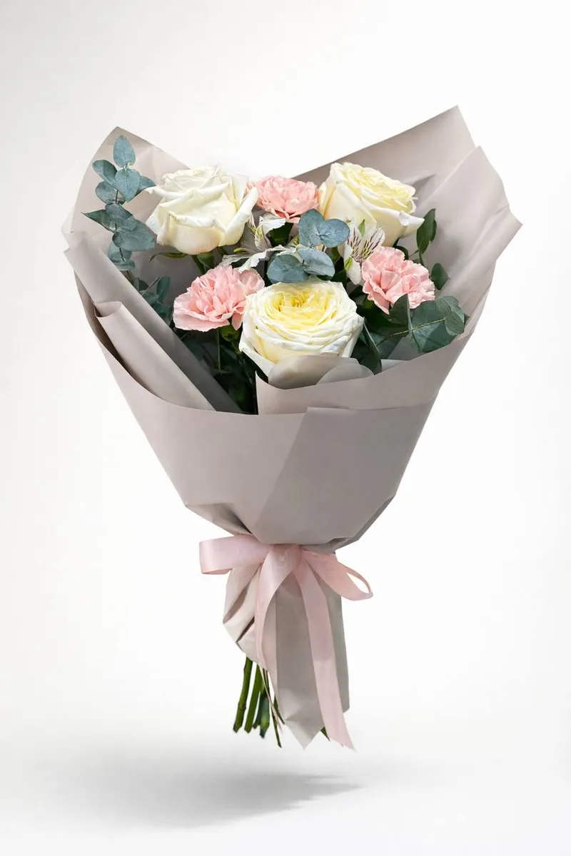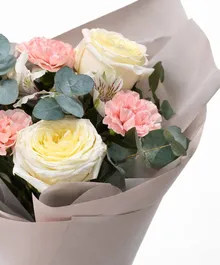 Нежная композиция из кремовых роз с мягким лимонным свечением в сердце бутона, пудрово-розовых гвоздик и благородного эвкалипта. Спокойная упаковка в тёплом бежевом оттенке подчёркивает чистоту линий, а атласная лента добавляет лёгкий романтический акцент.