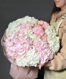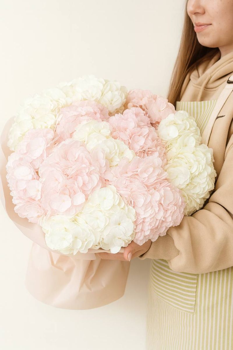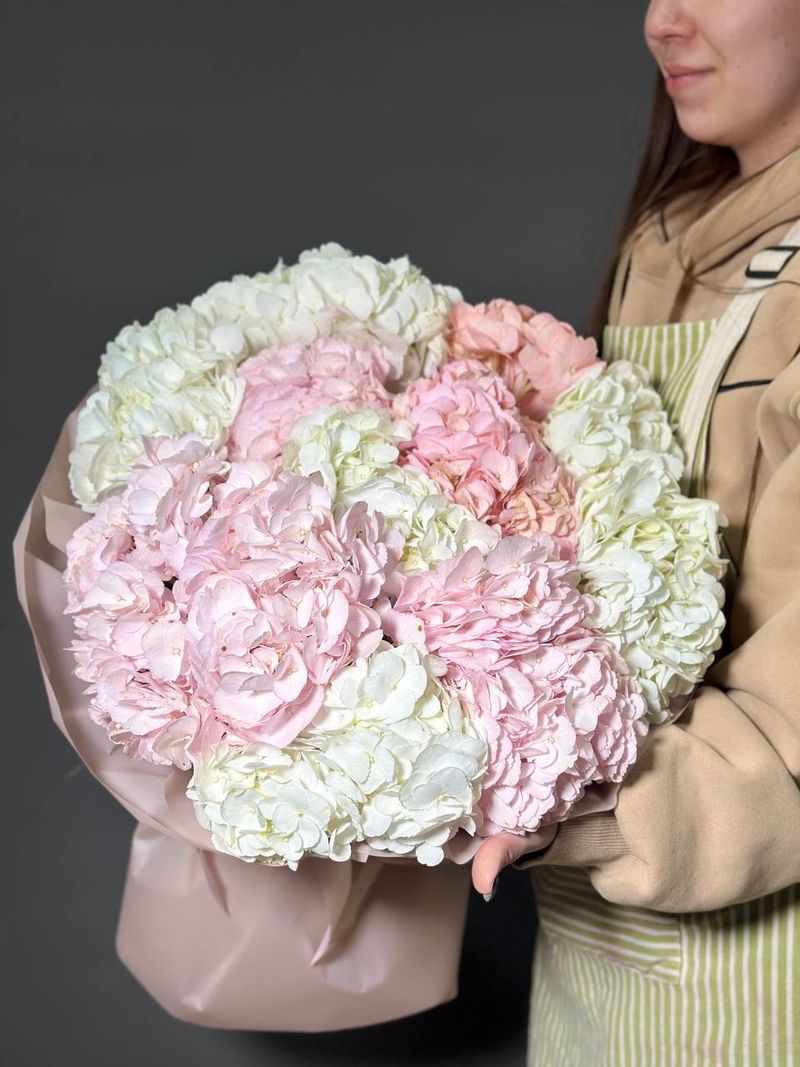 Объёмный букет из нежных гортензий в пудрово-розовых и молочных оттенках. Лёгкий, воздушный и очень тактильный — словно мягкое облако в руках. Идеален для признаний, тёплых моментов и подарков без повода, когда важны не слова, а ощущение.