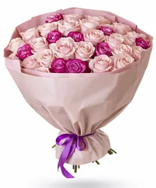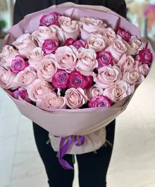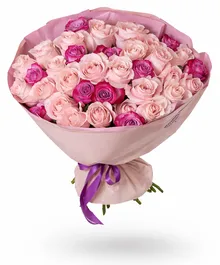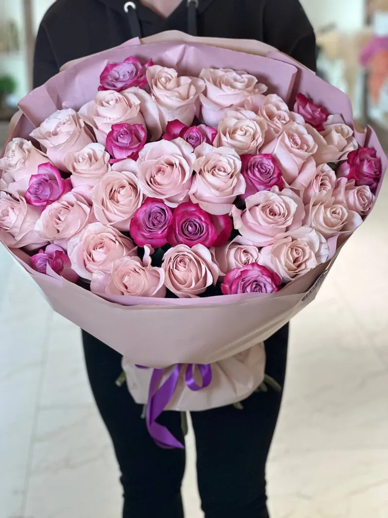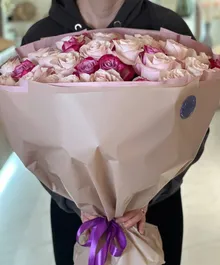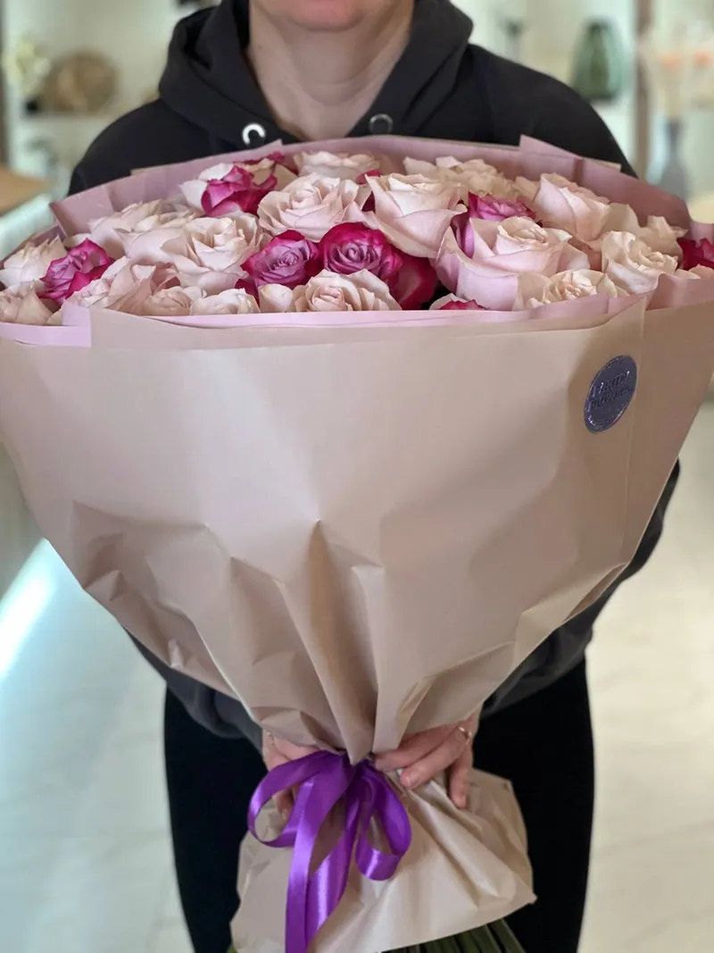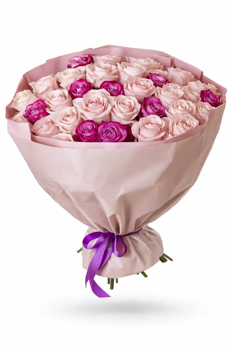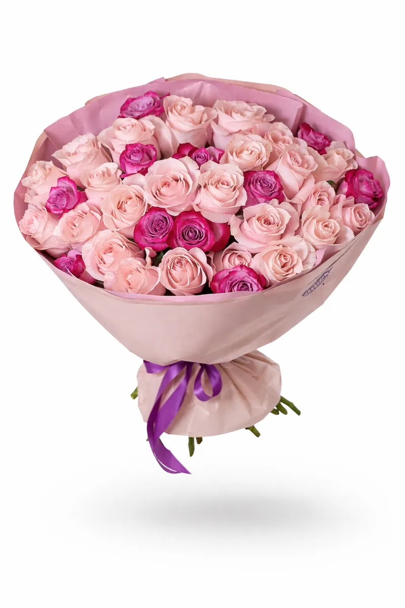 Нежные пудровые розы в объятиях ярких фуксий создают эффект лёгкого флирта — сдержанно, но с характером. Контраст оттенков делает букет живым и эмоциональным, а благородная упаковка подчёркивает премиальность композиции.