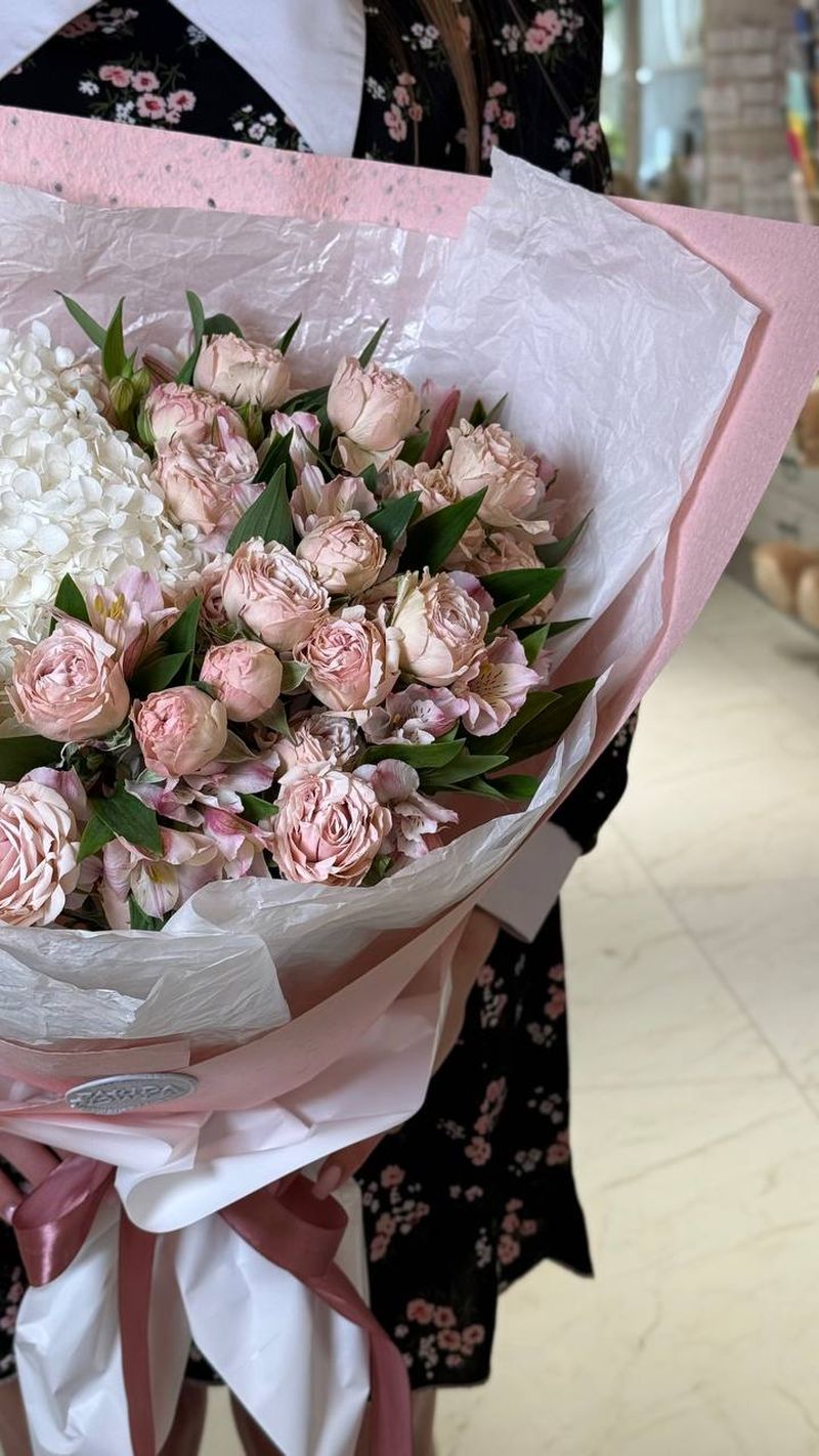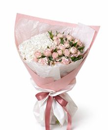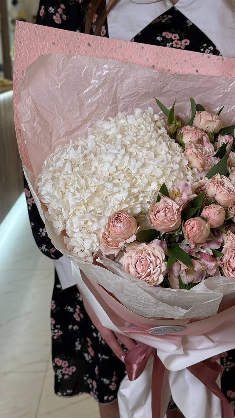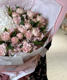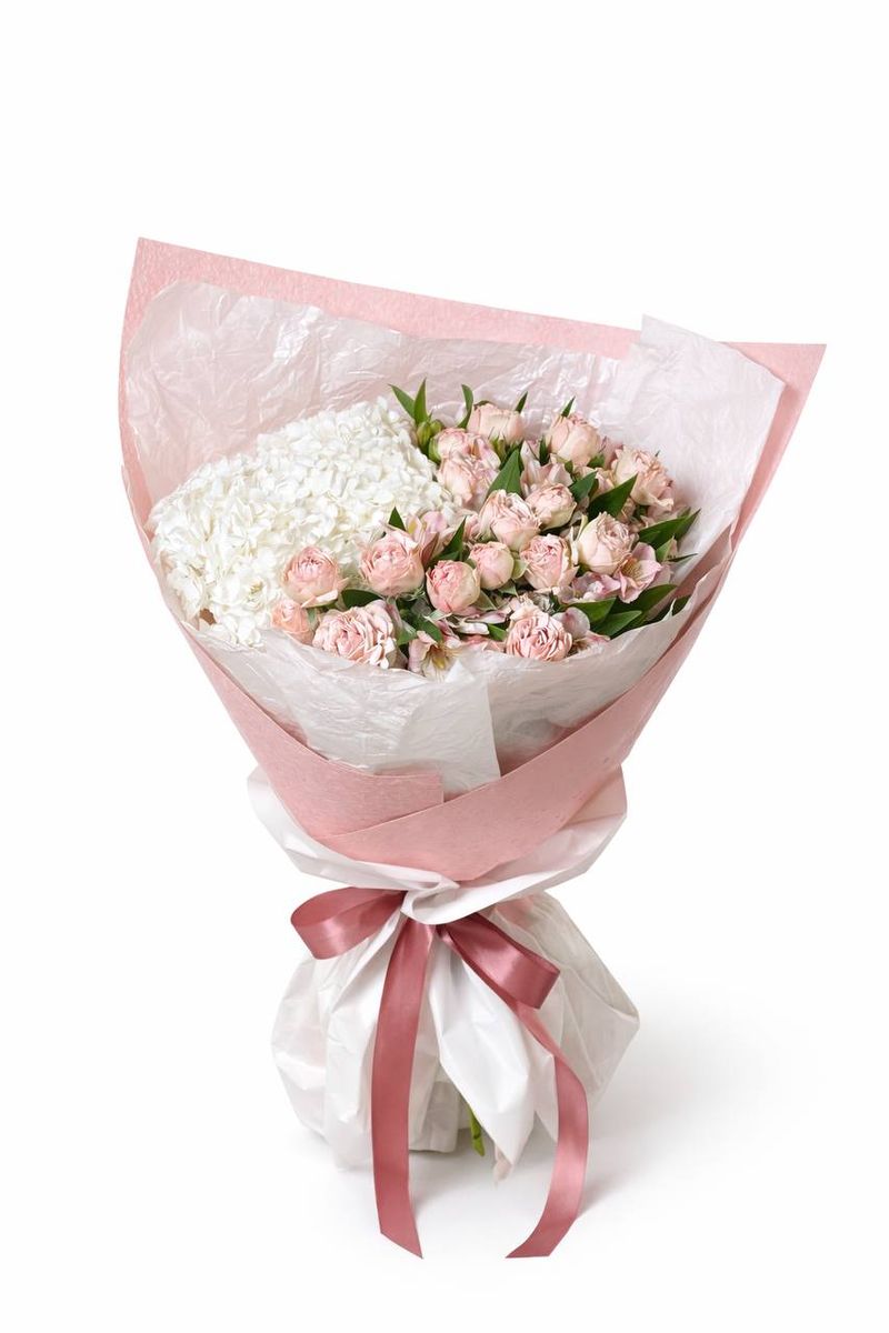 Нежная и изысканная композиция в светло-розовой гамме — букет с особым шармом. Пышная белая гортензия создаёт эффектный объём и ощущение воздушного облака, а миниатюрные кустовые розы добавляют утончённости и романтики. Сочетание фактур делает композицию живой и по-настоящему премиальной.