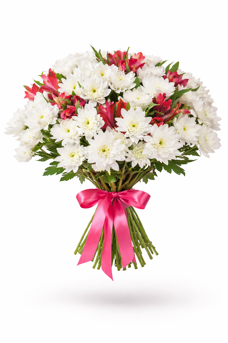Выбрав букет из хризантем и альстромерий, вы будете не только очарованы внешним видом прекрасных цветов, но и приятно удивлены долгим сроком их жизни.