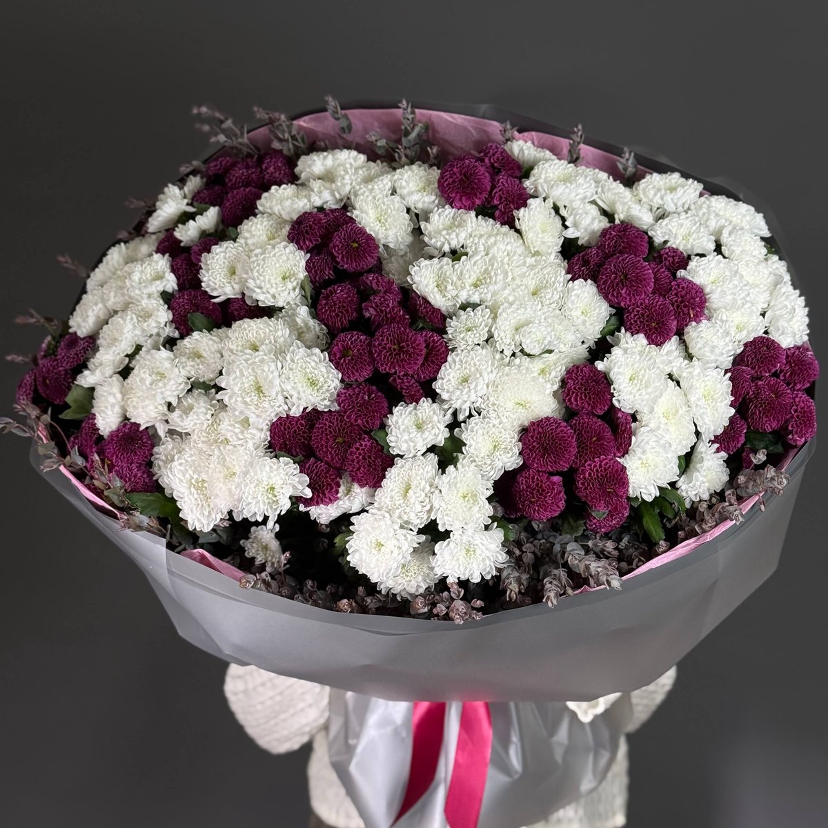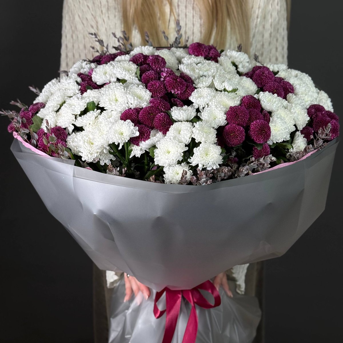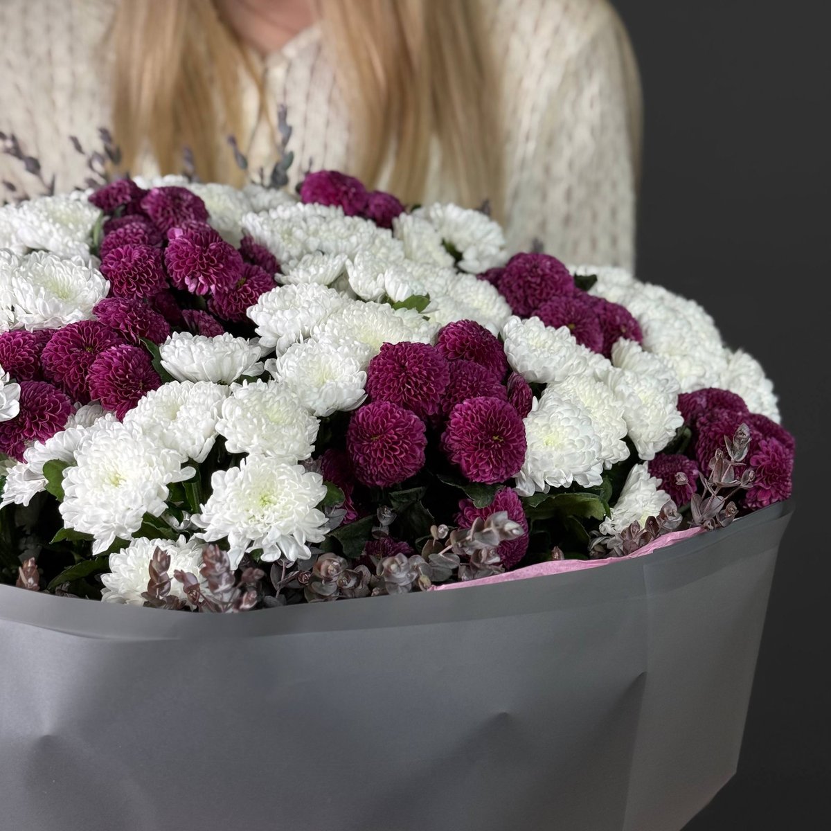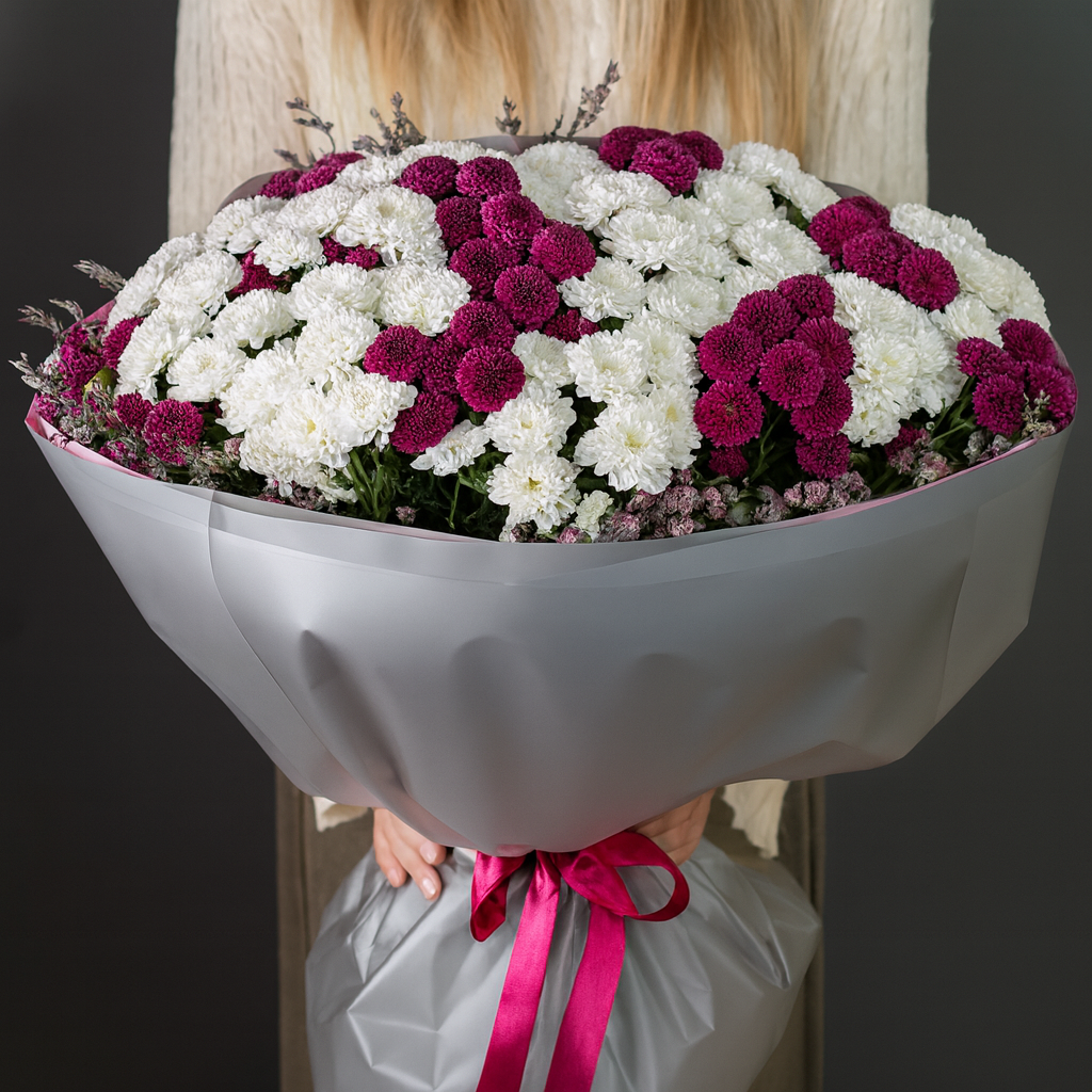 Он собран из пышных, плотных хризантем, которые создают объёмное облако нежности и красоты. Аккуратные ягодные акценты добавляют глубину и делают букет живым, эмоциональным и по-настоящему праздничным.