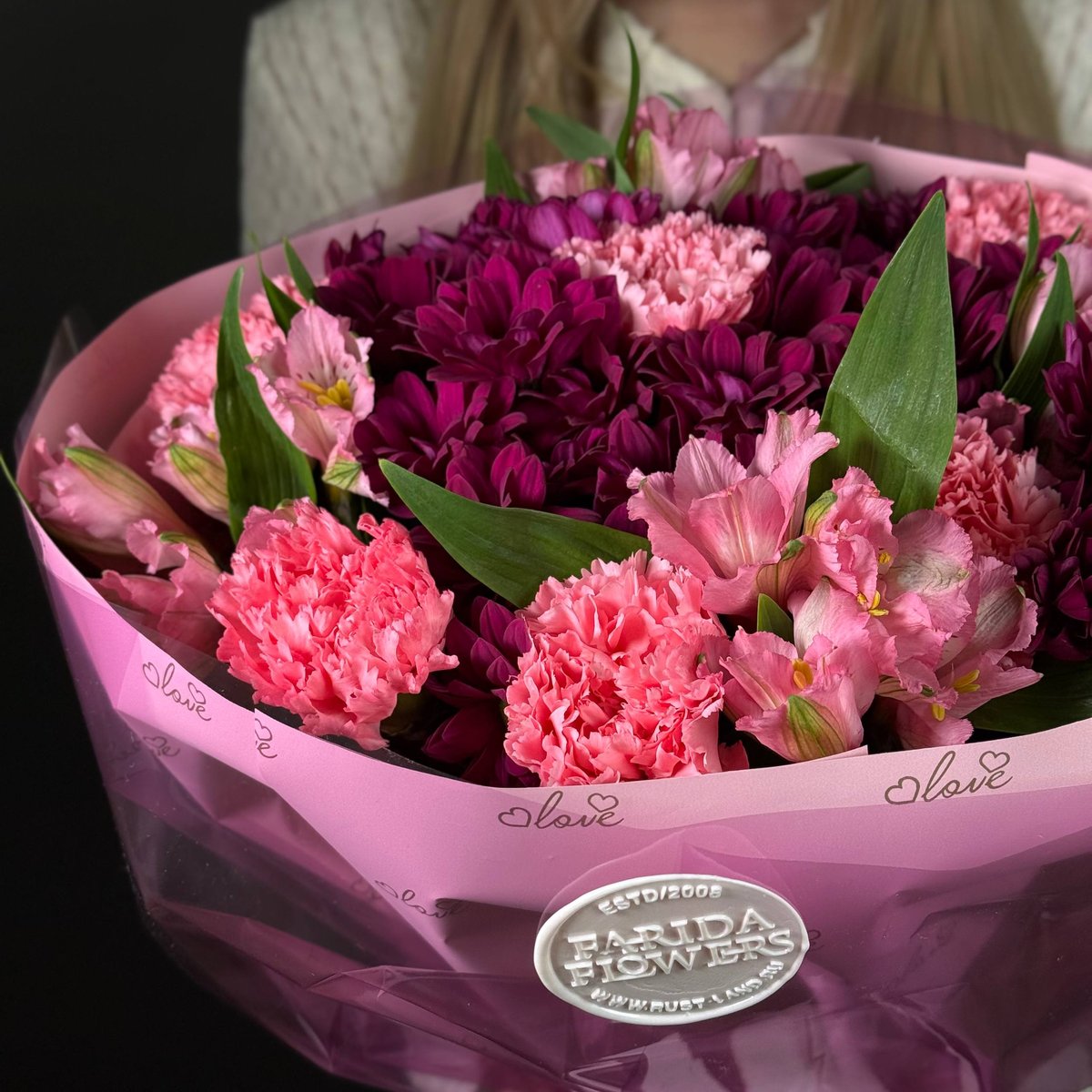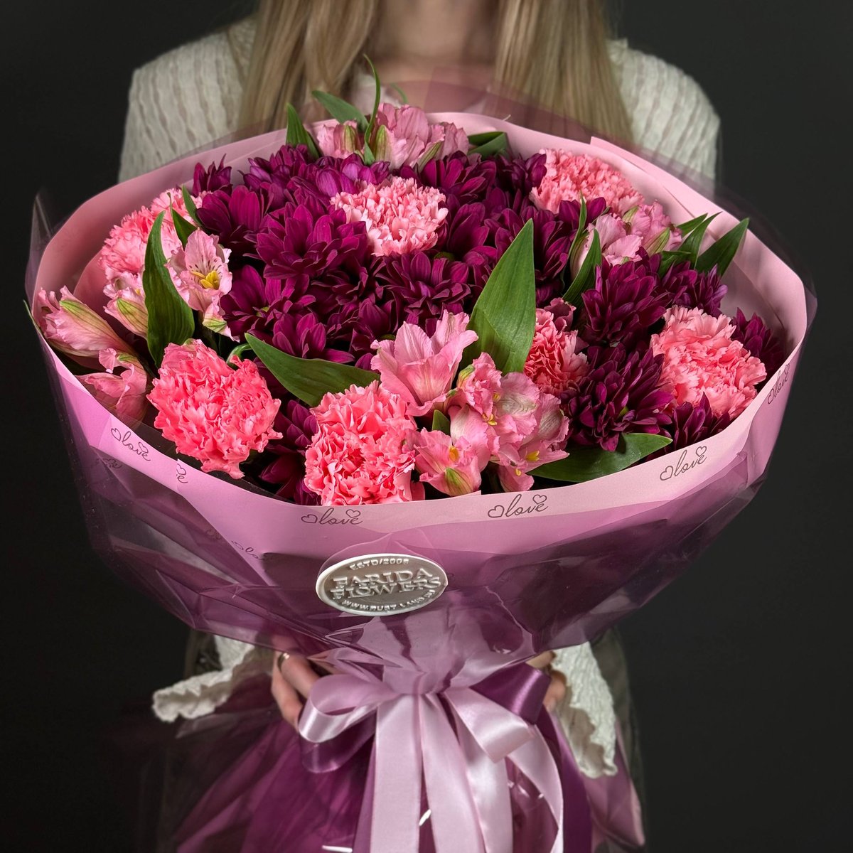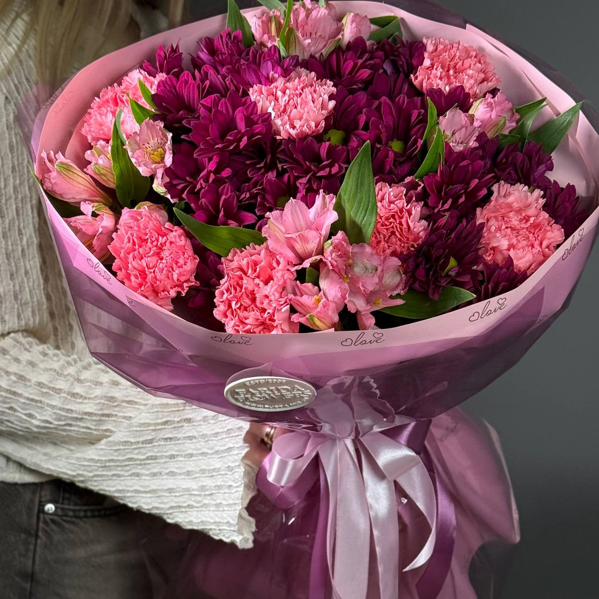 Гармония глубоких винных оттенков хризантемы, нежных розовых диантусов и лёгкой альстромерии делает композицию утончённой и очень женственной.
