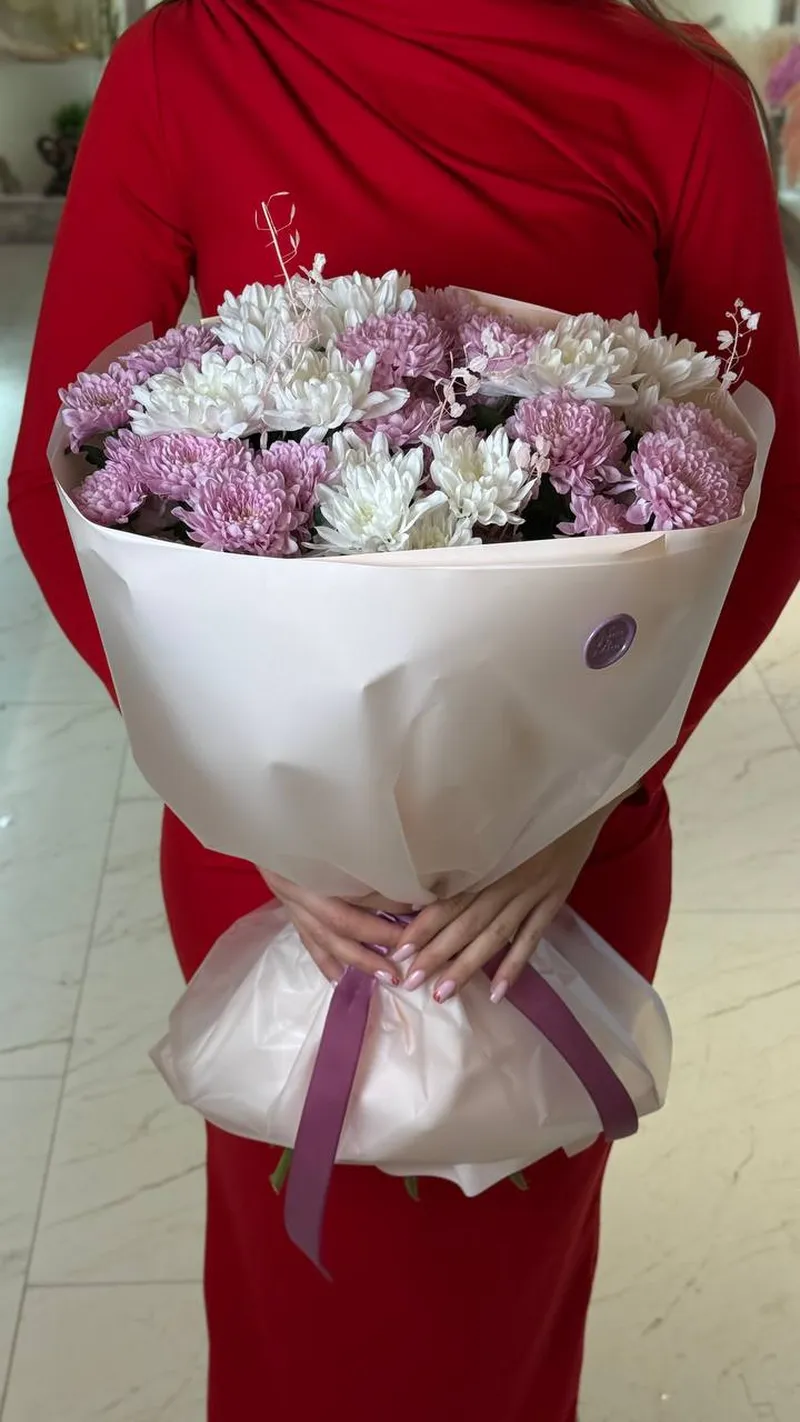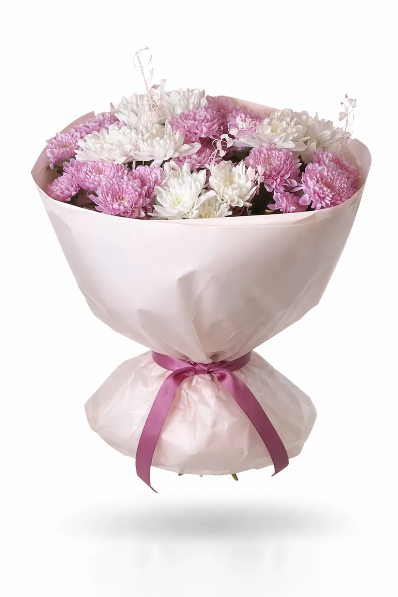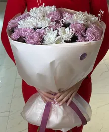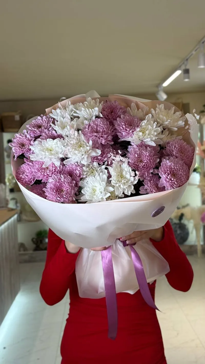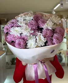 Нежный, выверенный, спокойный — этот букет создан для тех, кто ценит гармонию без лишнего шума. Сочетание сиреневых и белых хризантем образует мягкий градиент, который смотрится дорого, свежо и очень аккуратно. Это не кричащая страсть — это уверенная симпатия, искренность и тёплая забота. Идеальный выбор для признания, благодарности, дня рождения или 14 февраля, когда хочется сказать: «Ты для меня — важна» без лишних слов.