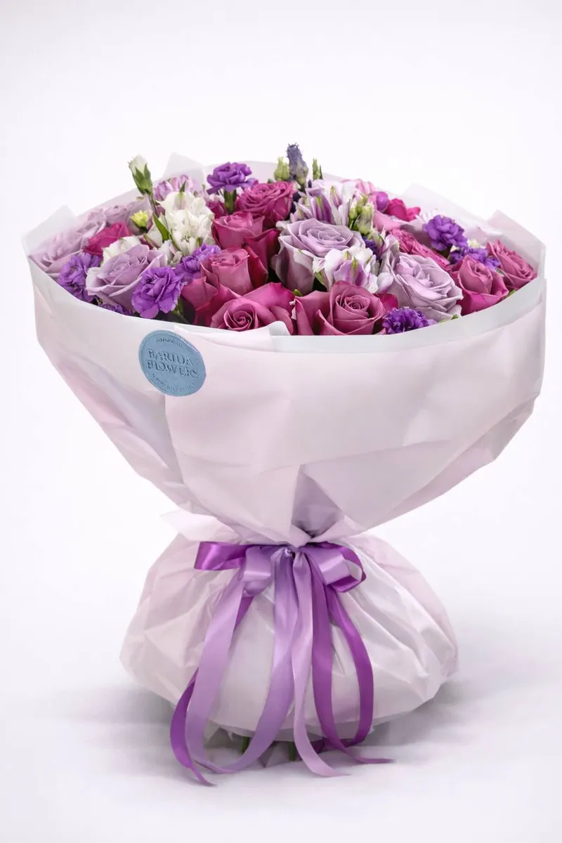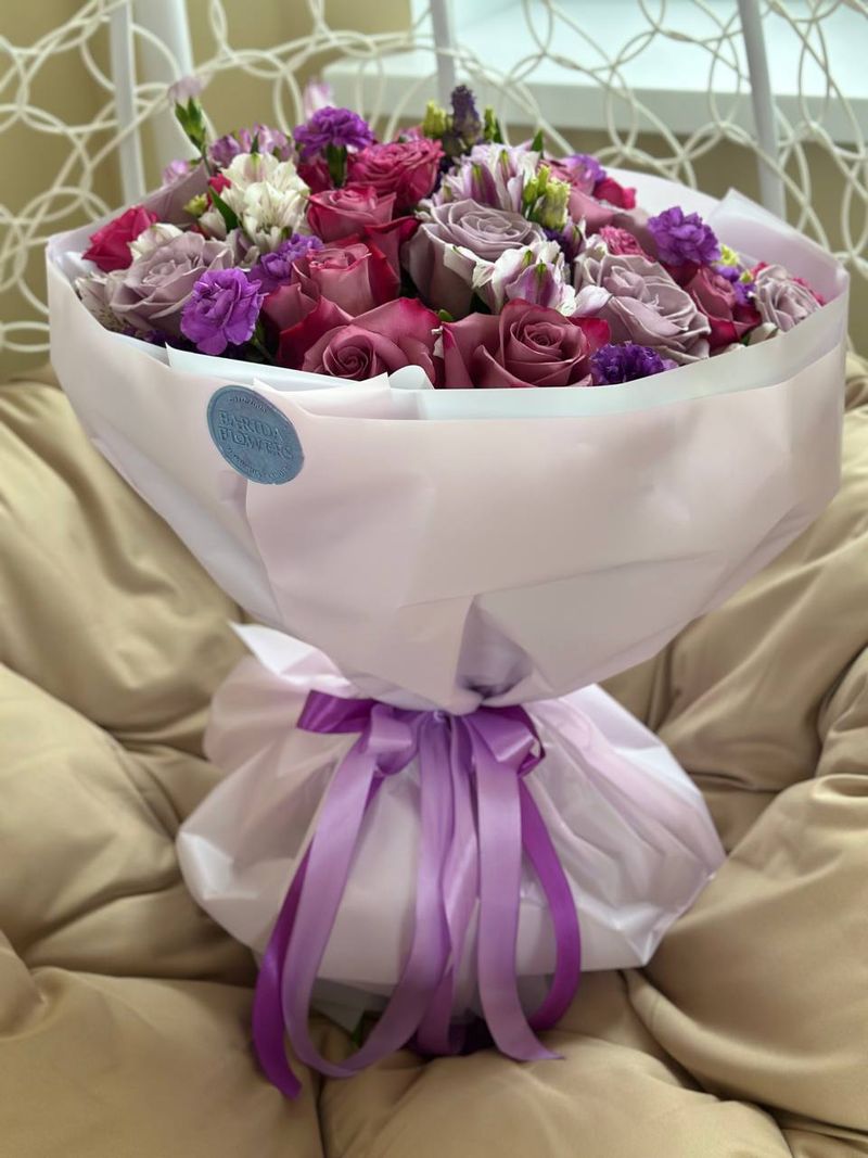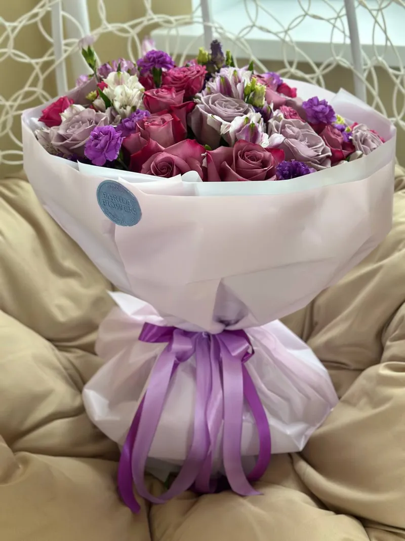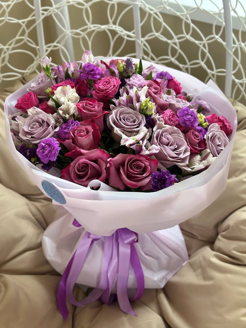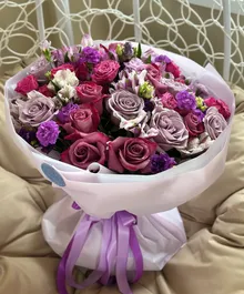 Глубокий, чувственный букет в оттенках розового, сливового и сирени. Бархатные розы переплетаются с нежными акцентами и создают ощущение роскоши без лишней громкости. Этот букет — как вечернее признание: элегантный, тёплый и запоминающийся. Идеален для особых чувств и особых людей.