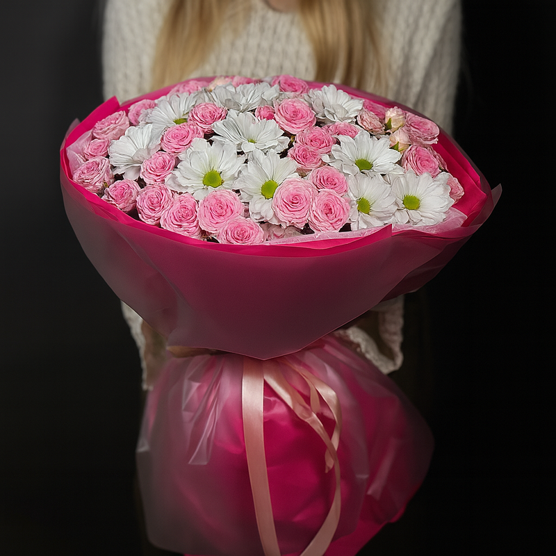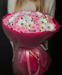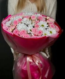 Нежный букет из розовых спрей-роз и белоснежной хризантемы.
