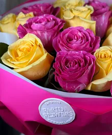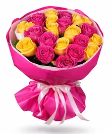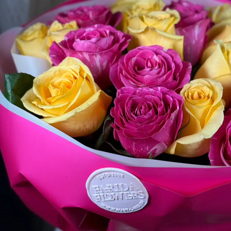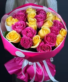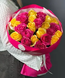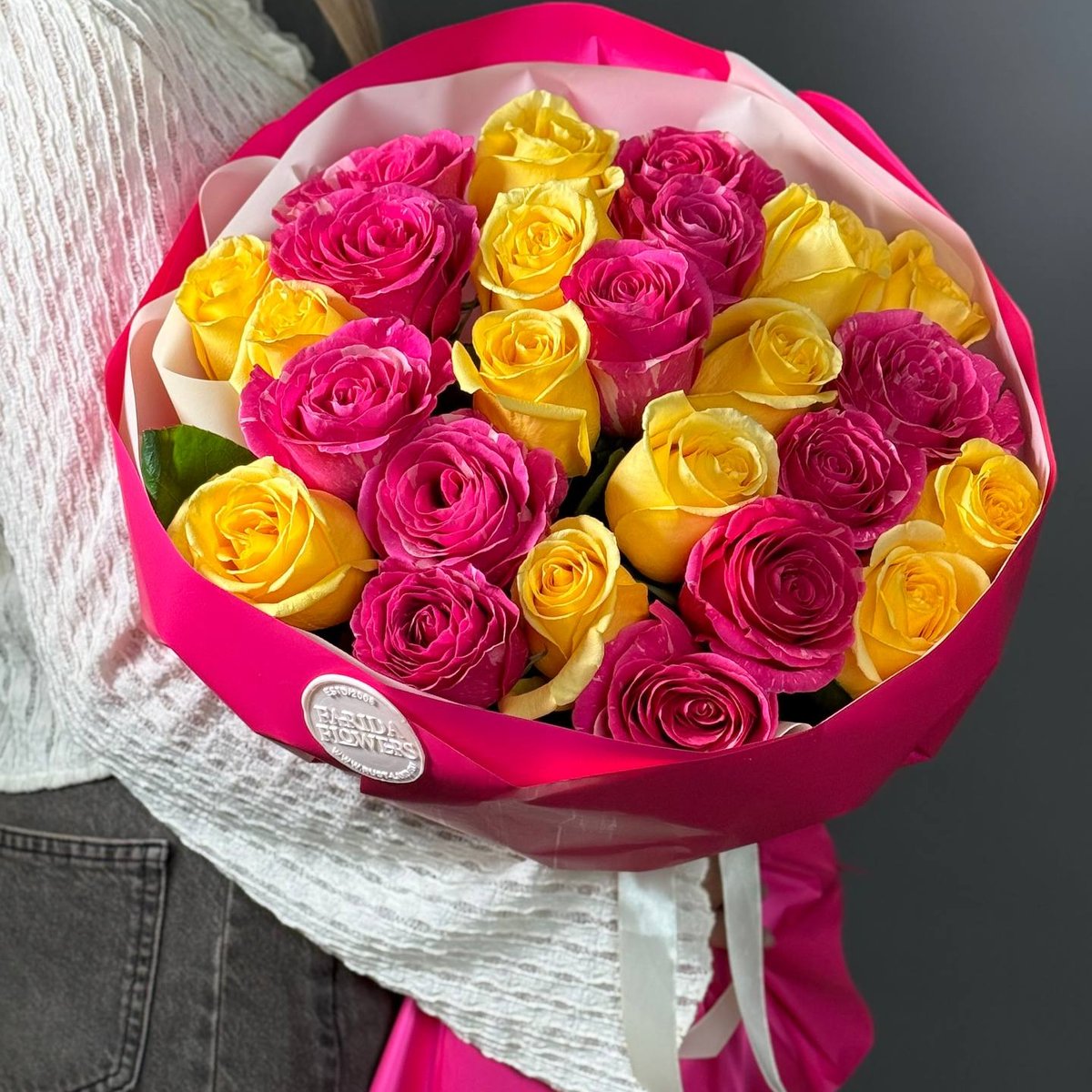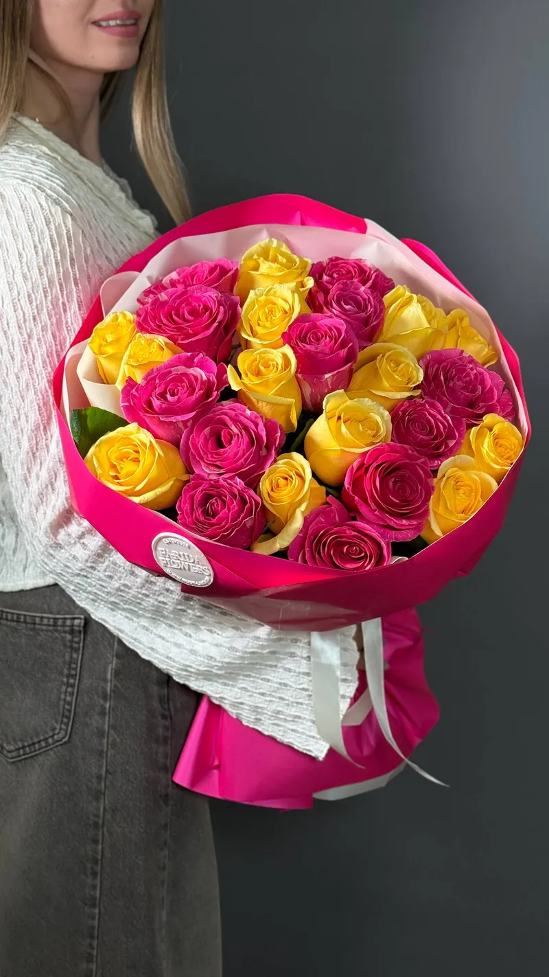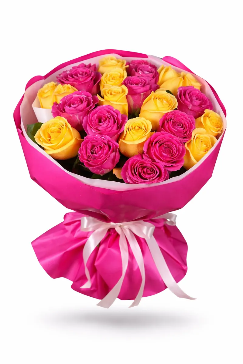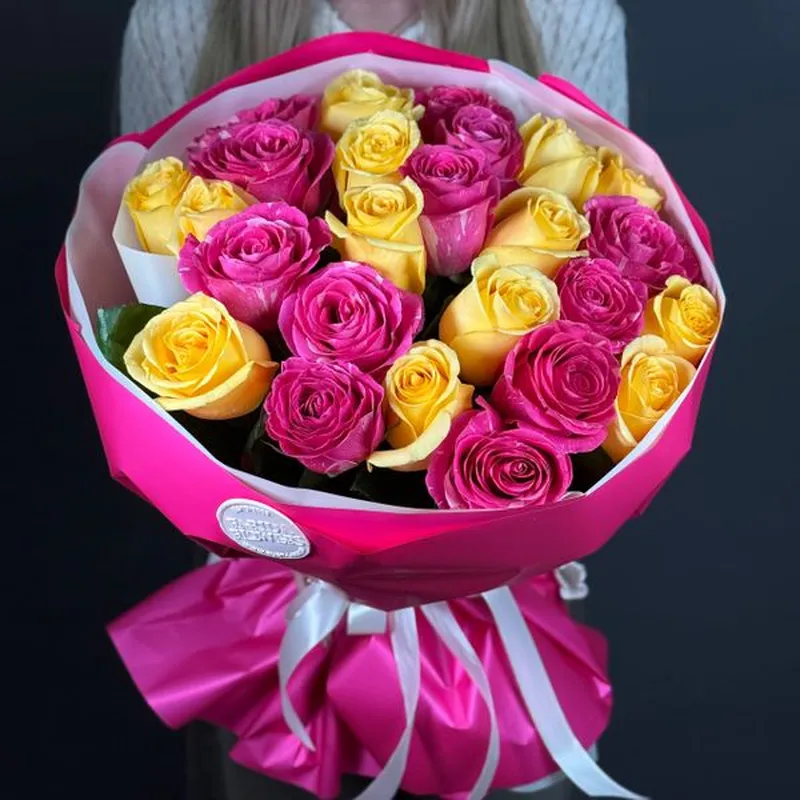 Ярко-розовые и солнечные жёлтые розы создают тёплую, радостную композицию, которая мгновенно поднимает настроение и вызывает улыбку.
