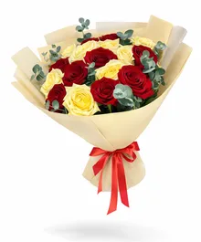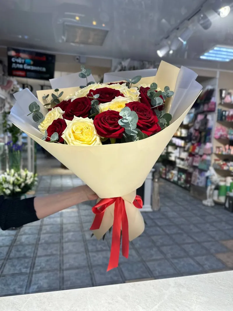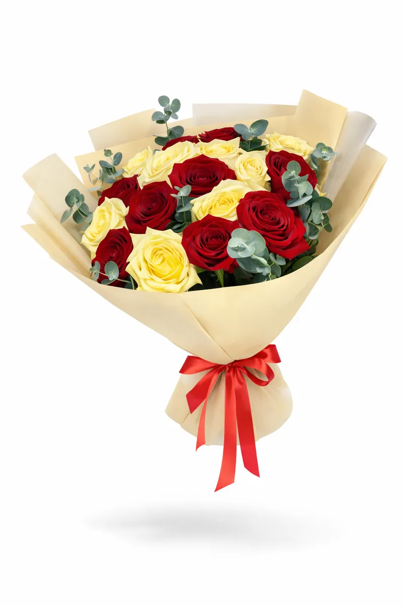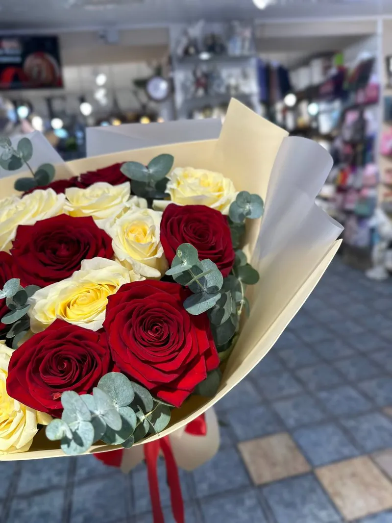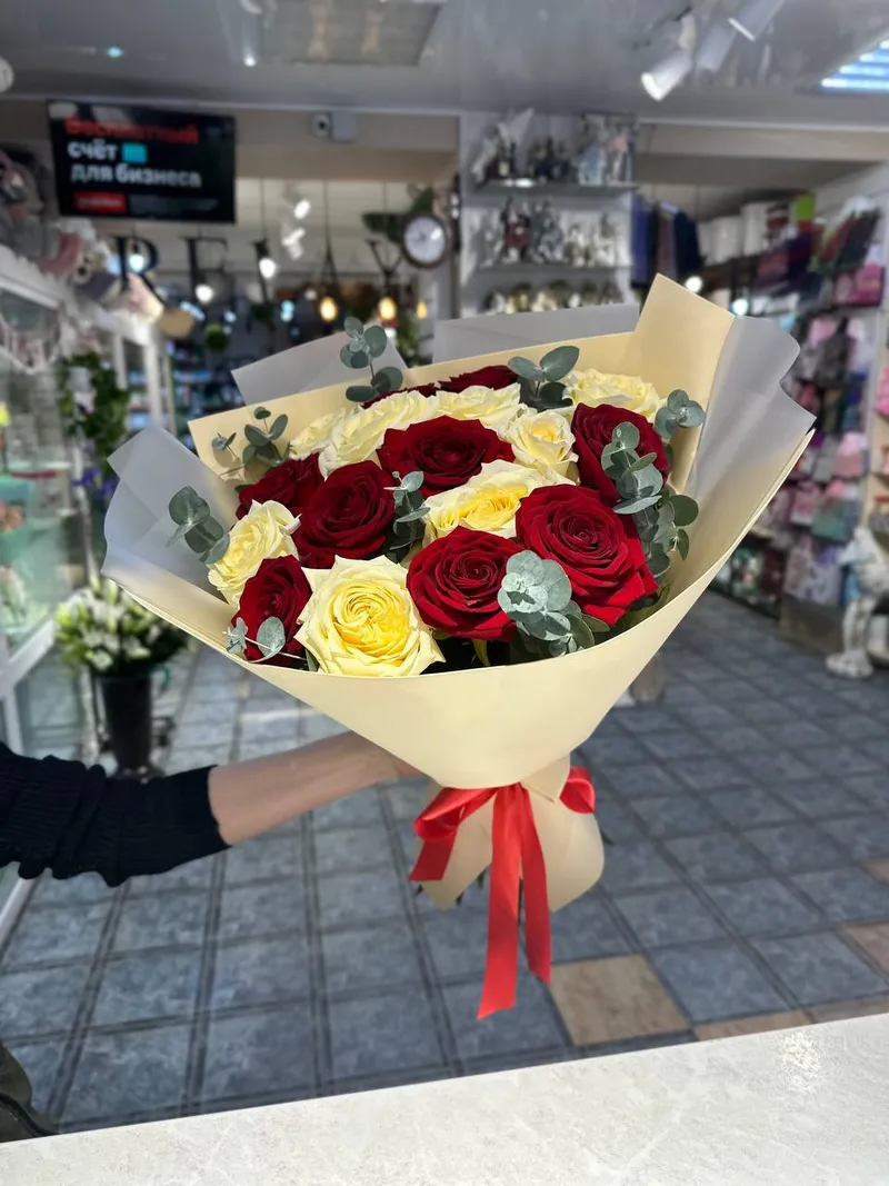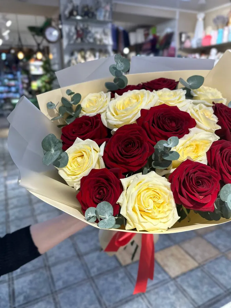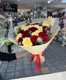 Перед вами стоит букет, который словно произведение искусства воплощает в себе гармоничное сочетание двух контрастных, но дополняющих друг друга цветов - красного и белого. Розы, собравшиеся в этом букете, символизируют собой любовь, страсть и уважение, а их белые сестры - чистоту, искренность и надежду.