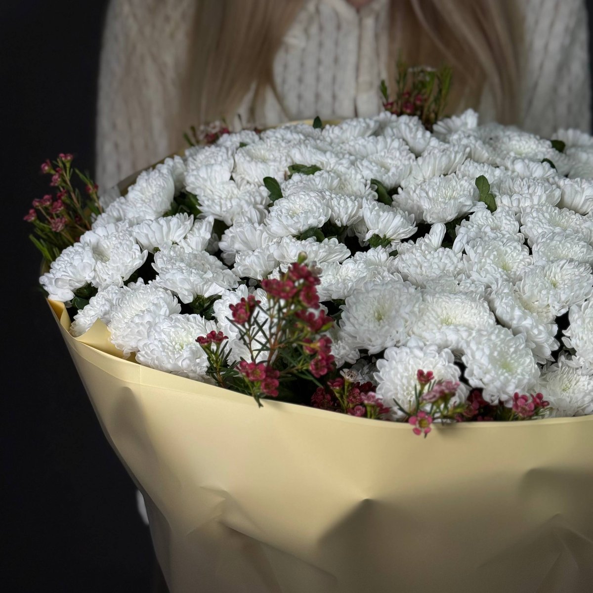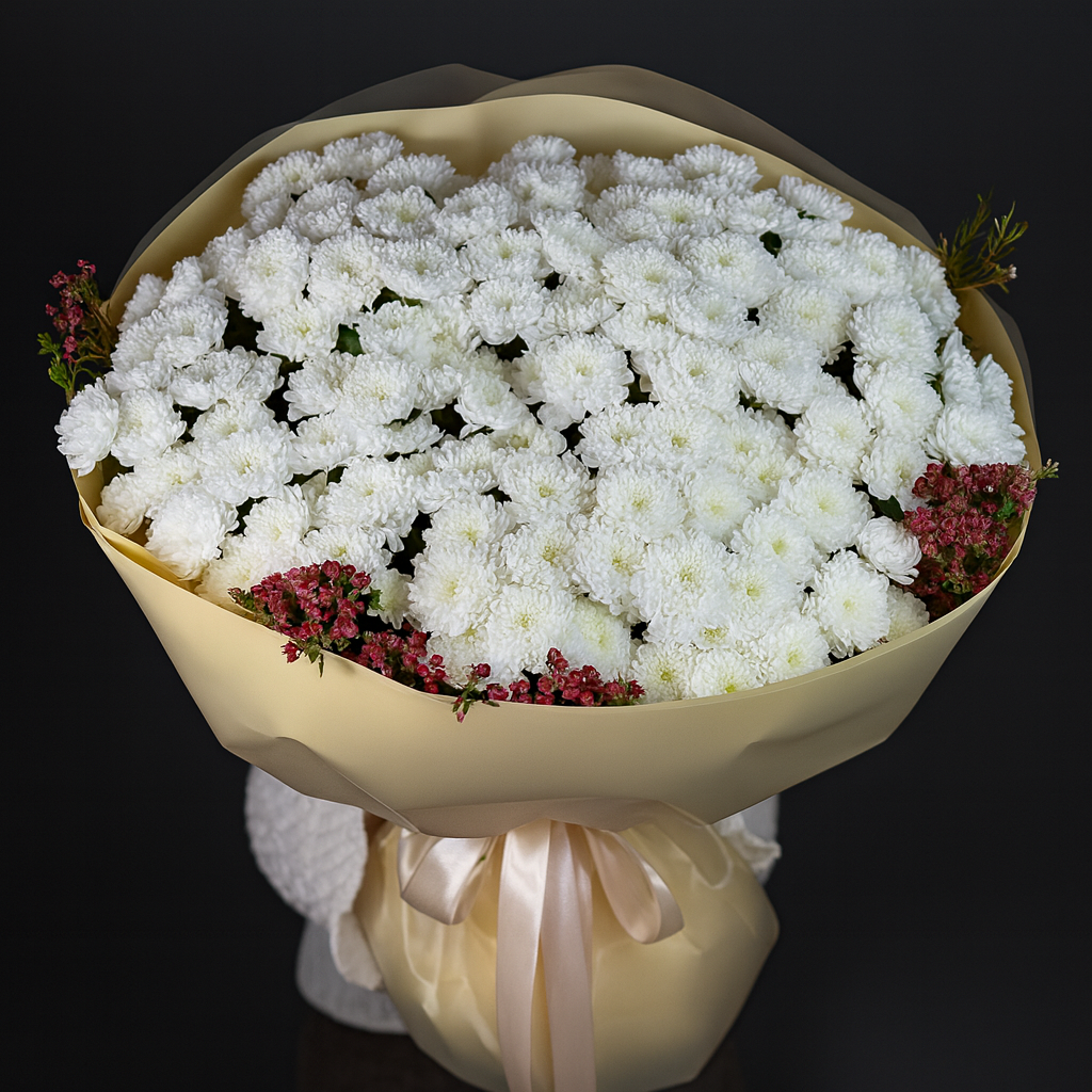 Этот букет XL-формата — настоящий гигант. Внутри 25 роскошных веток белой хризантем: плотные, пушистые, идеально раскрытые «шарики», которые создают эффект снежного облака.